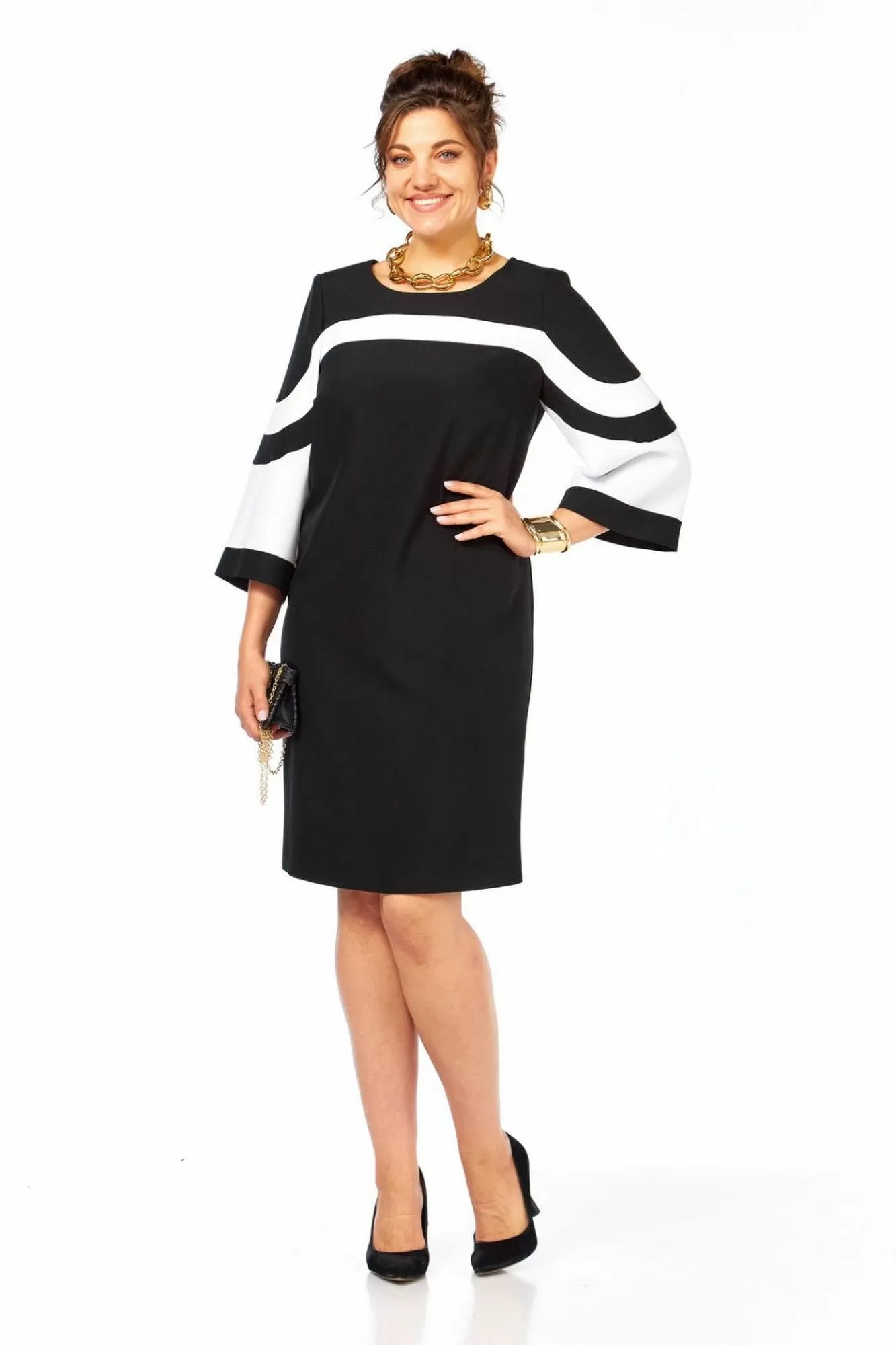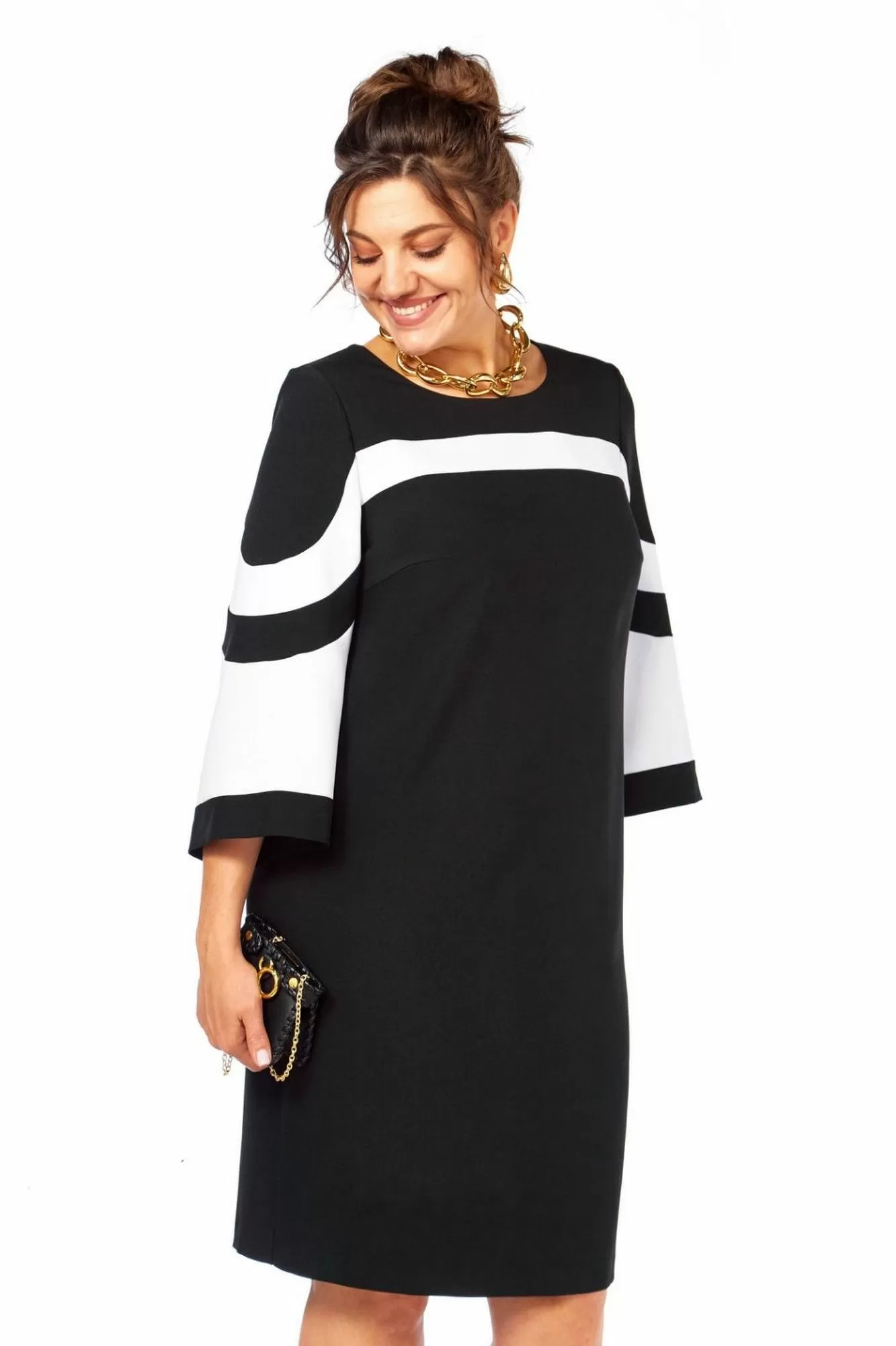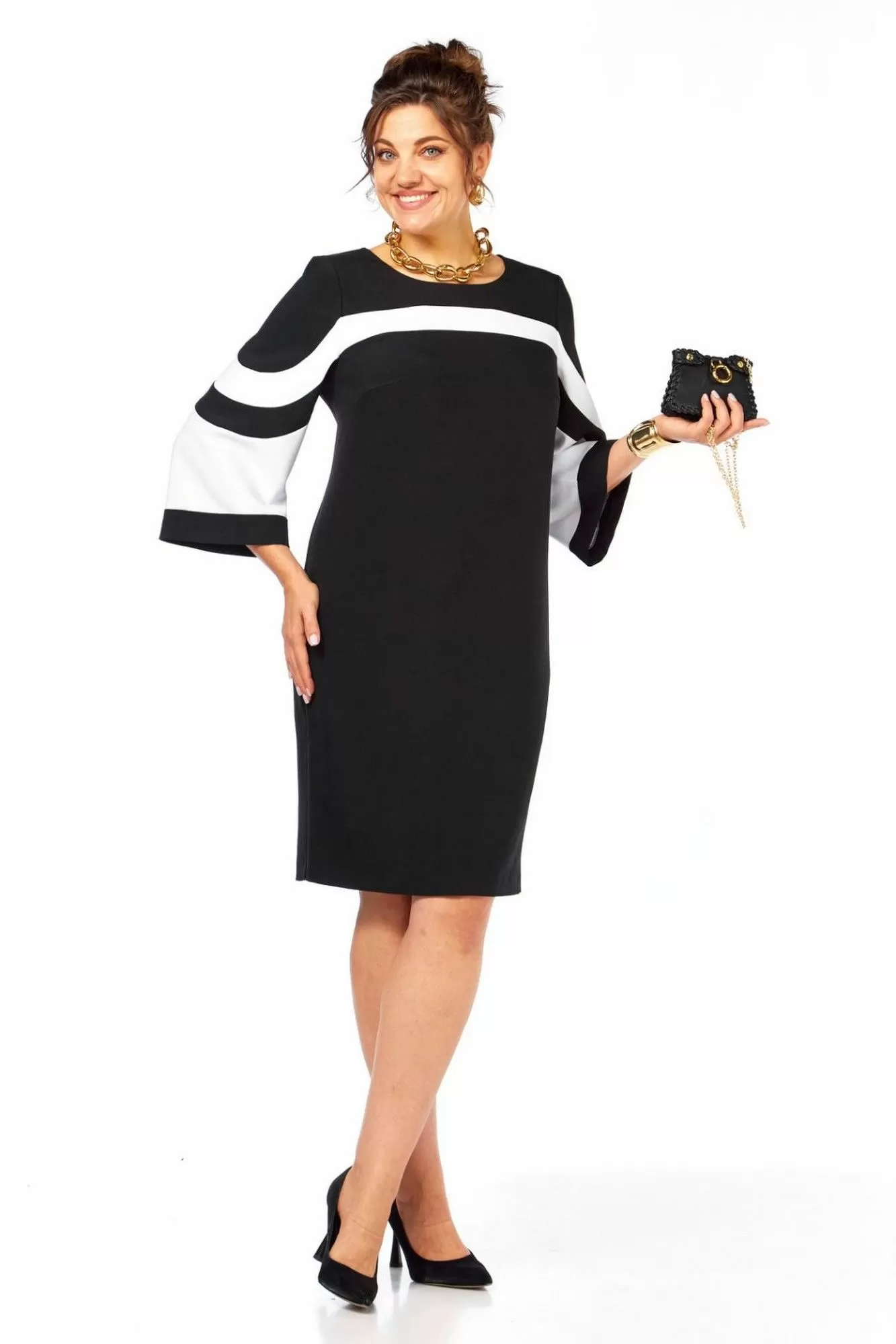 Платье женское, нарядное, полуприлегающего силуэта, с нагрудными вытачками, идущими от центра груди к боковым швам. По переду расположено горизонтальное членение с отделочным элементом. Спинка со средним швом, в среднем шве расположена потайная молния и сверху и разрез снизу. По спинке расположены талиевые вытачки. Рукава втачные, одношовные, расклешенные, длиной ¾. С фигурными членениями.