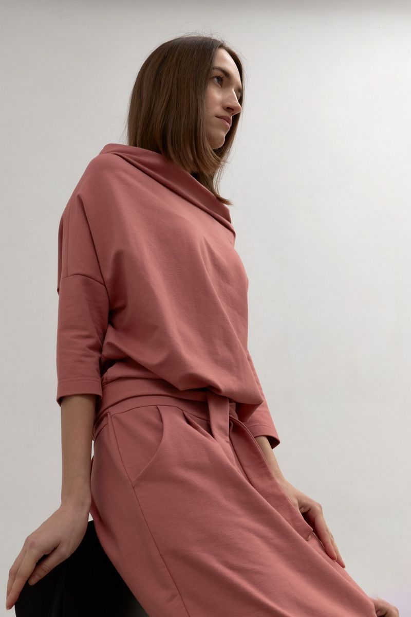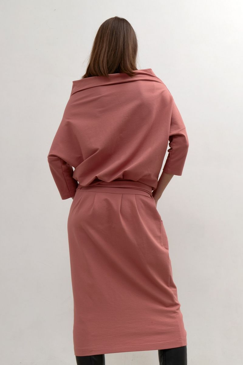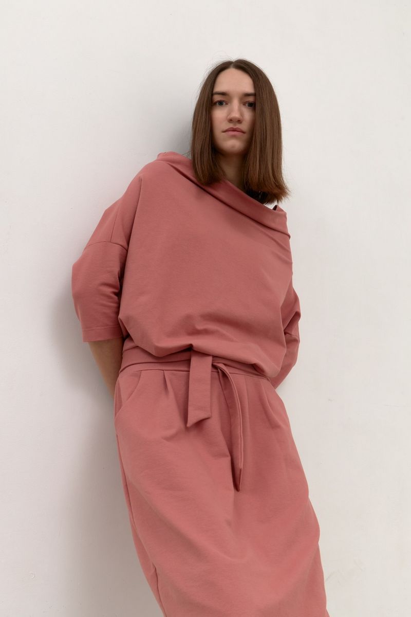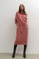 Платье из трикотажного полотна полуприлегающего силуета с цельнокройным рукавом. Горловина расширена с цельнокройной высокой стойкой мягкой формы. Рукав с отрезной мажетой длиной 3/4. На переднем полотнище юбки карманы с отрезным бочком . Обьем по талии регулируется завязками. Длина изделия по спинке 125 см . Стирка при t 30 °C. Подойдет От 42 до 48 р.