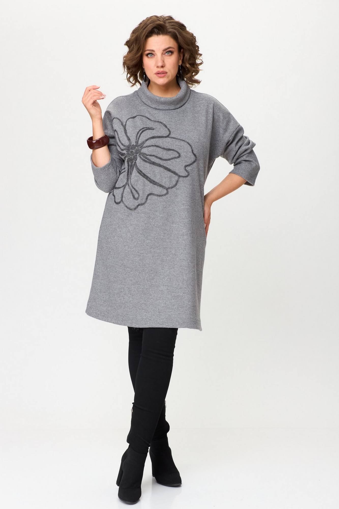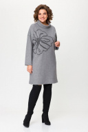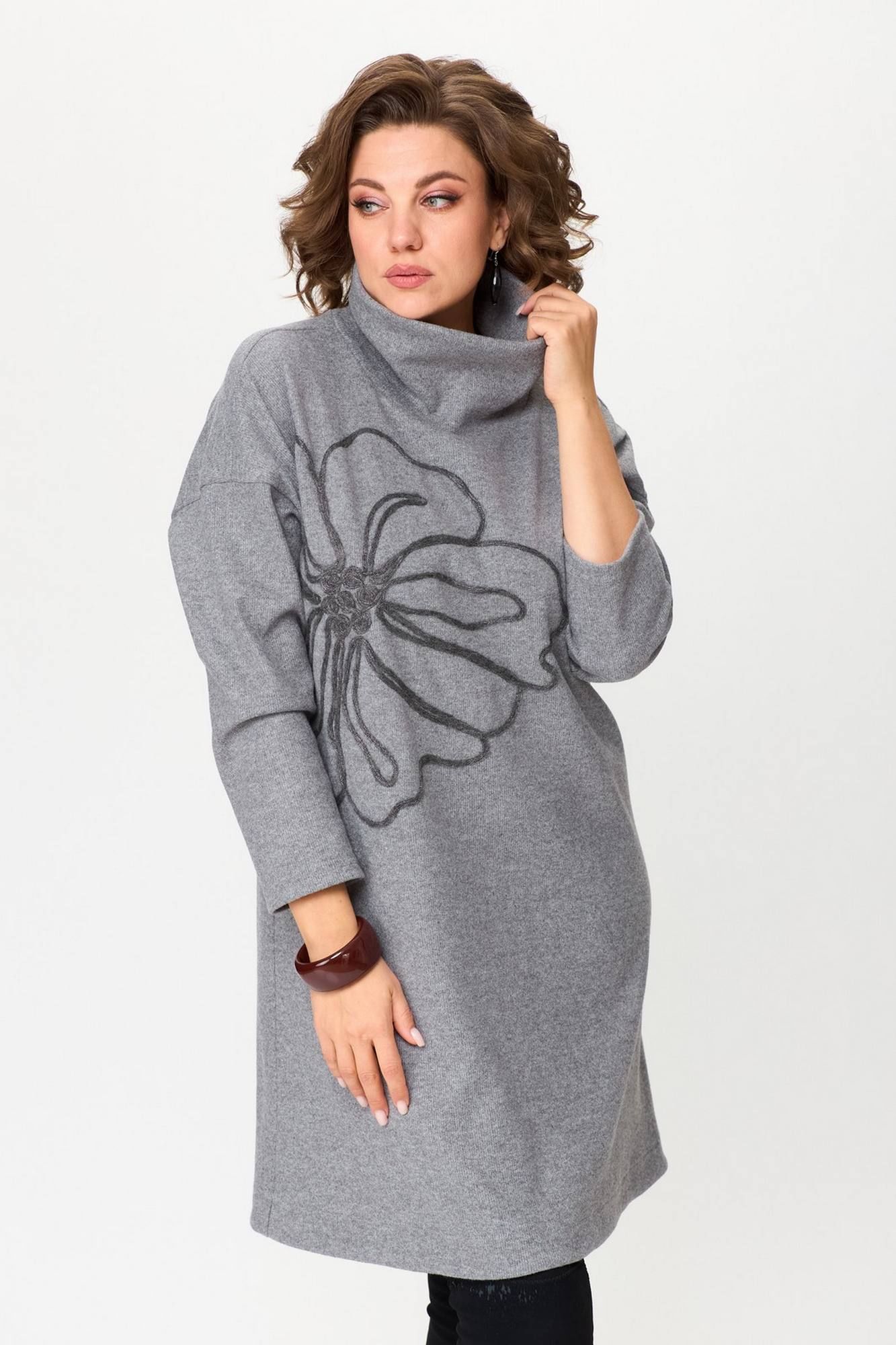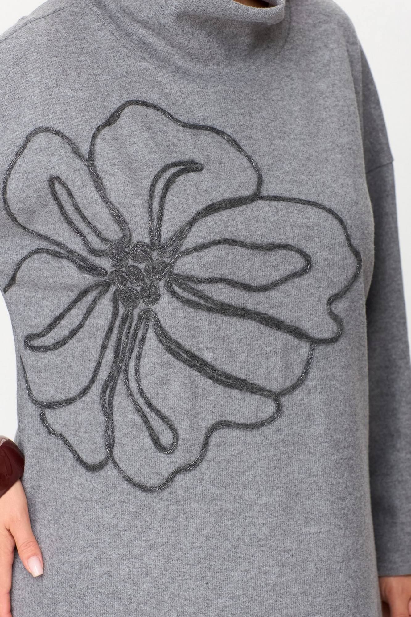 Платье свободного А-образного силуэта, изготовлено из трикотажа. Горловина с воротником-хомут. Рукав спущенный, длинный. Изделие без застежки, декором является вышивка по переду. Длина рукава – 45см, ширина плеча – 25см, длина изделия – 95см