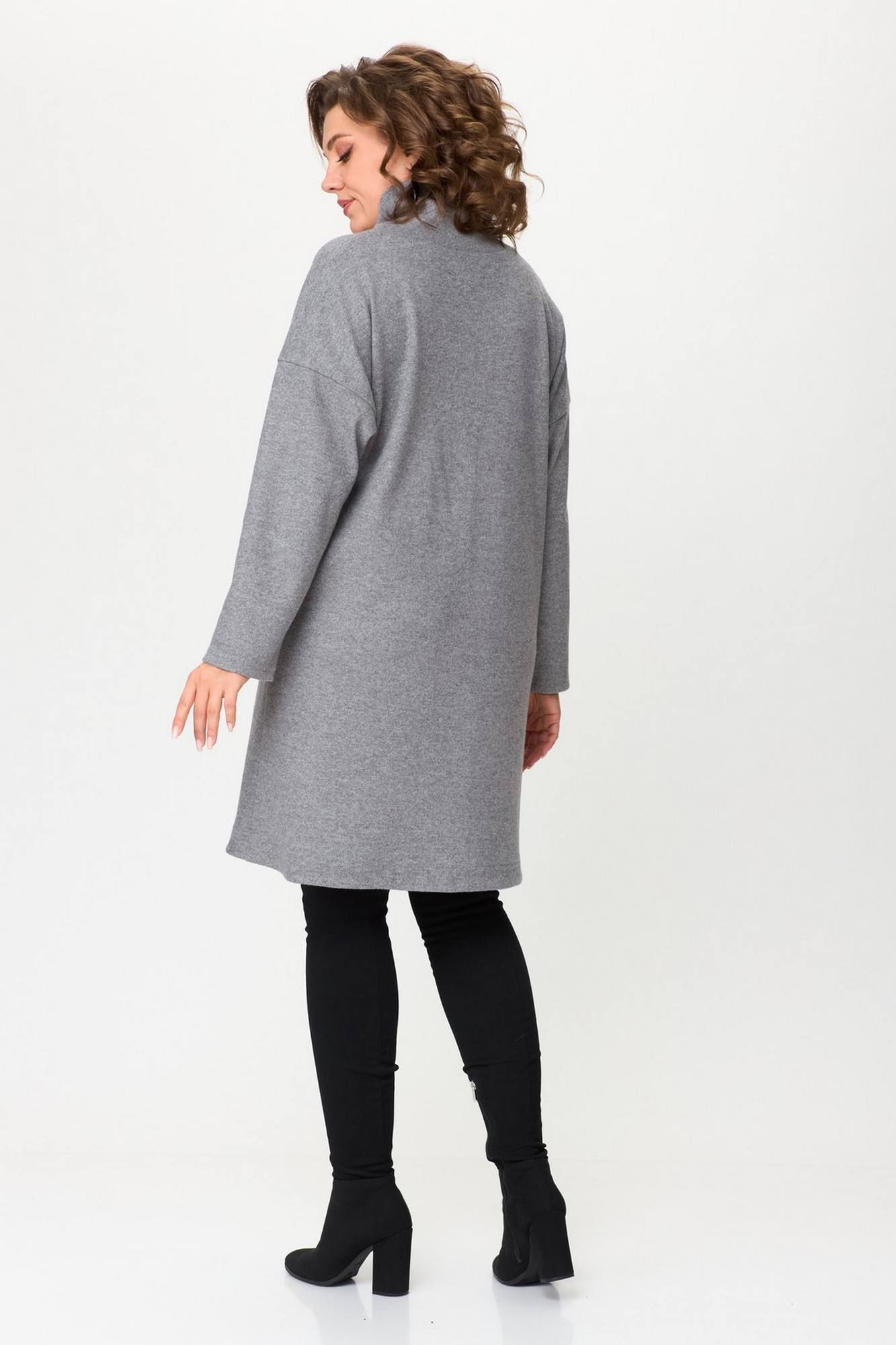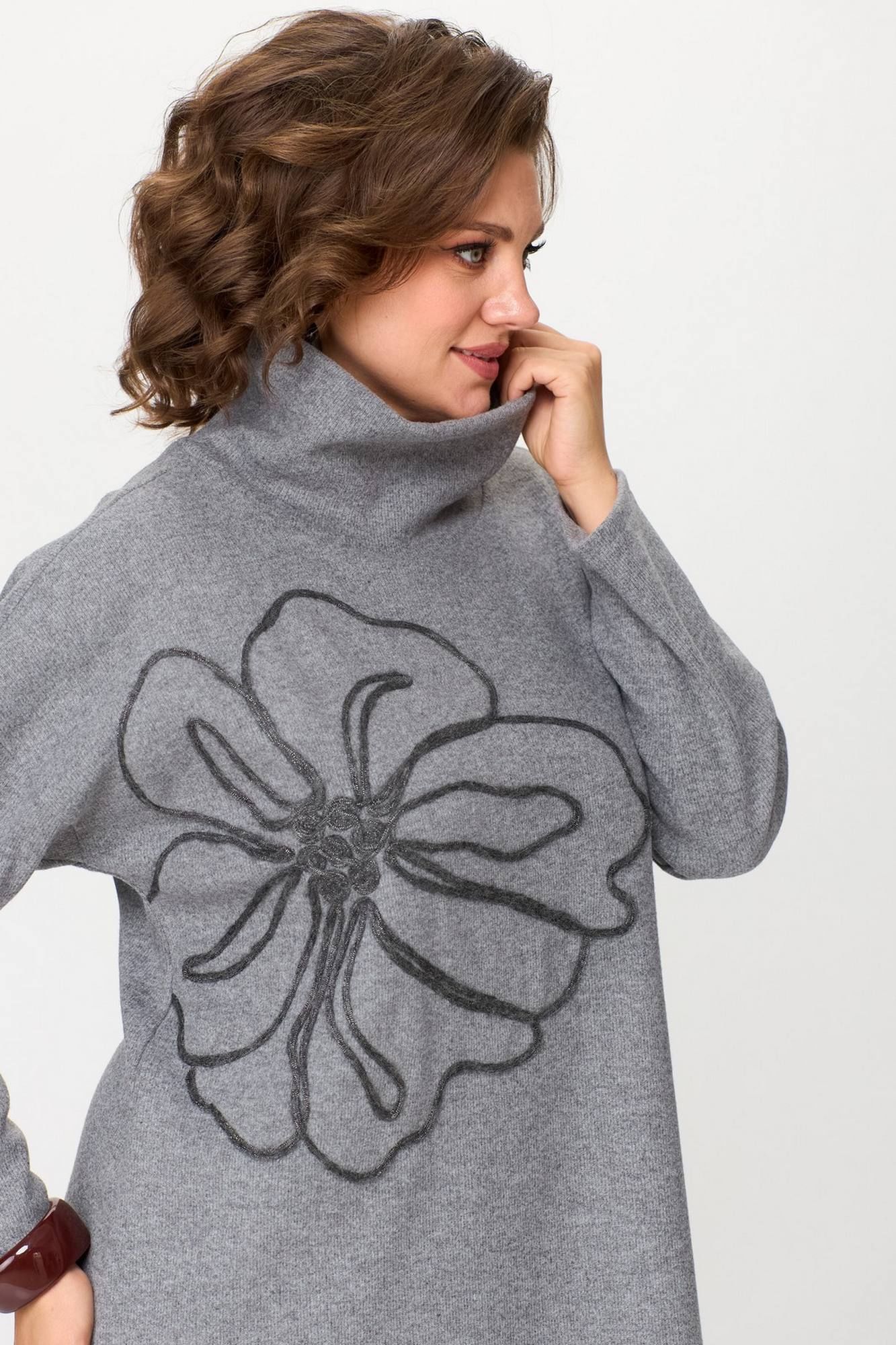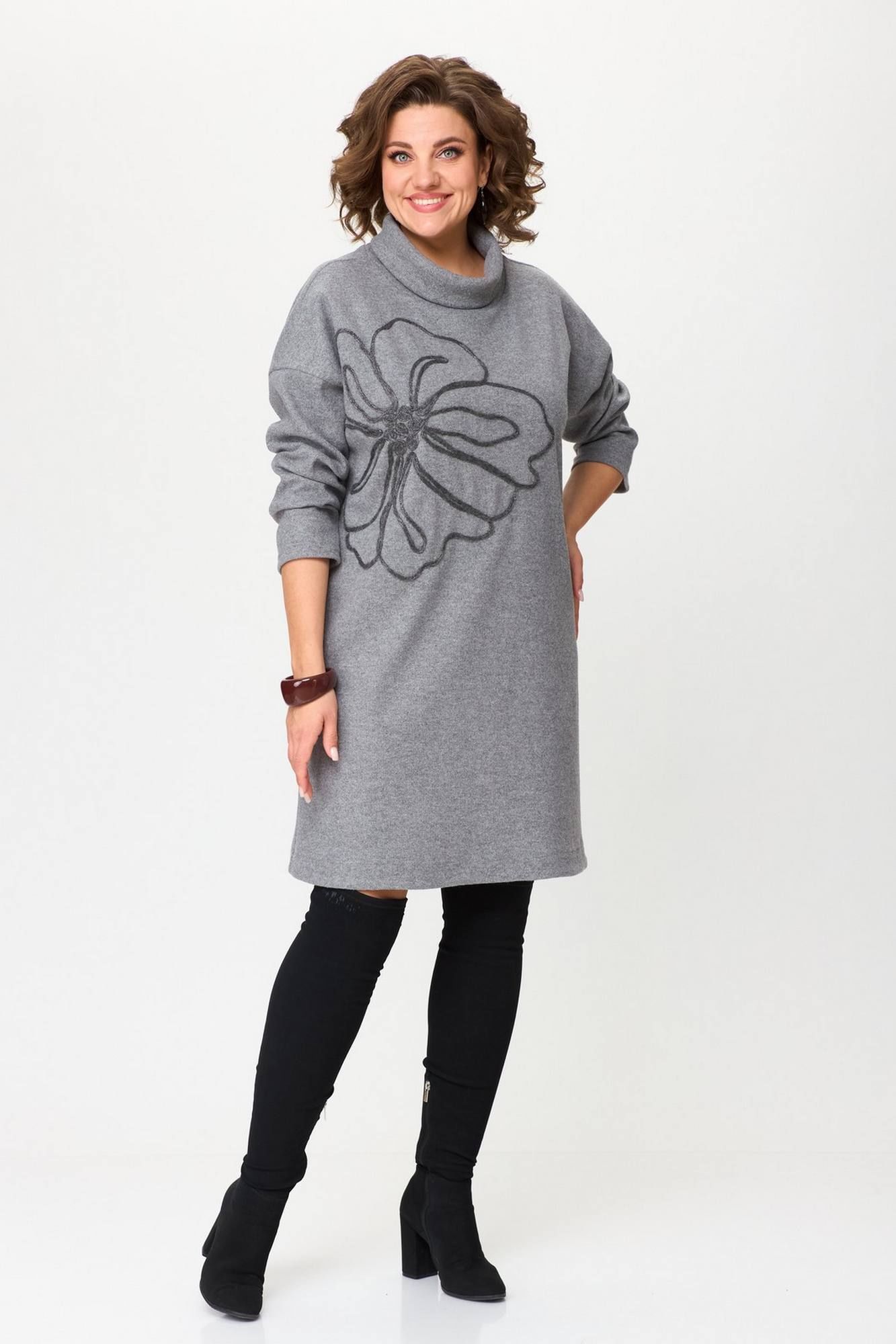 Платье свободного А-образного силуэта, изготовлено из трикотажа. Горловина с воротником-хомут. Рукав спущенный, длинный. Изделие без застежки, декором является вышивка по переду. Длина рукава – 45см, ширина плеча – 25см, длина изделия – 95см