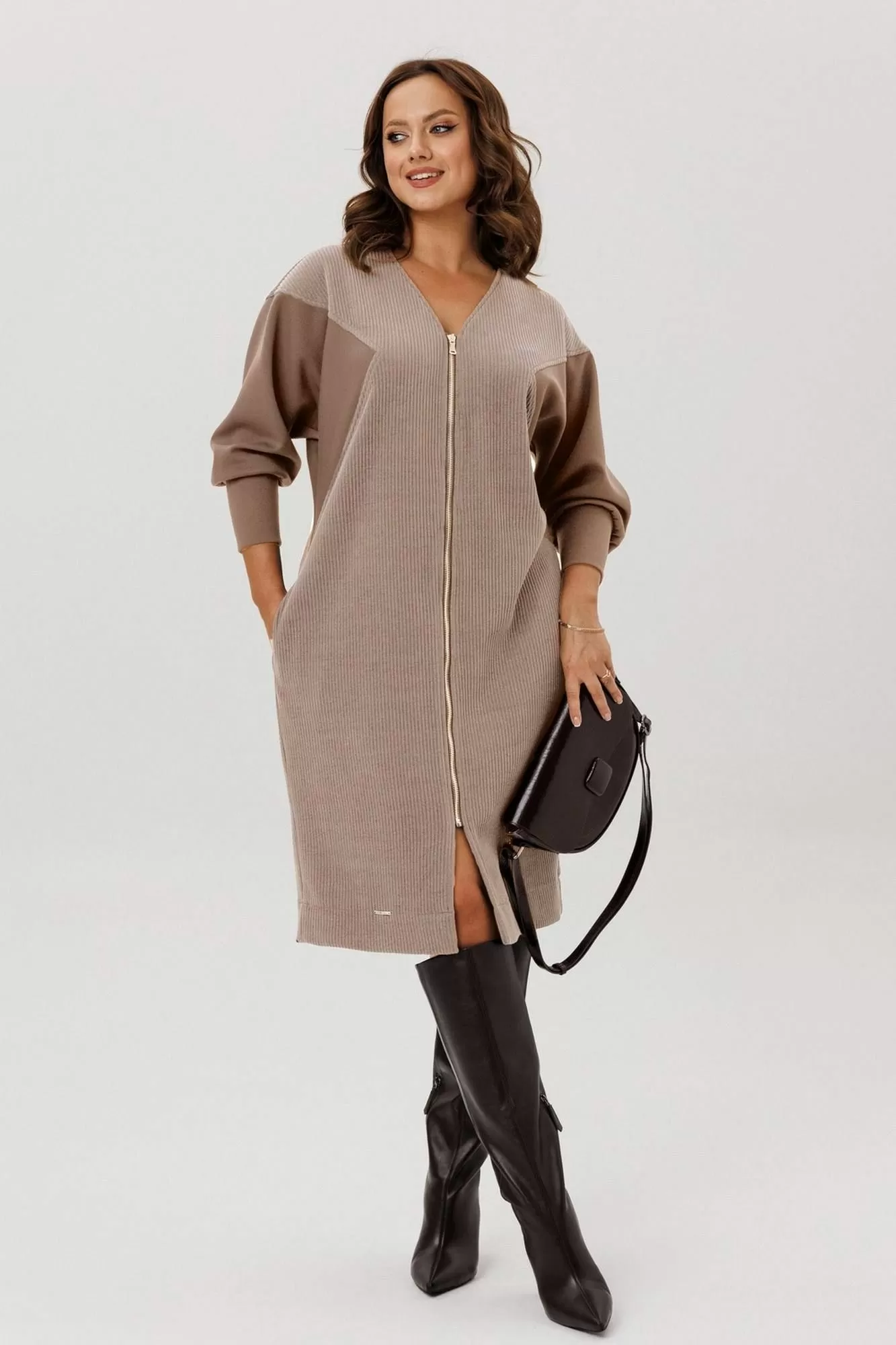 Платье полуприлегающего силуэта, вырез горловины V – образный, рукав цельнокроеный спущенный со вставками из кожи и на манжете внизу. По спинке кокетка, в боковых швах функциональные карманы. Застежка на тесьму-молнию. В комплекте ремень из экокожи.