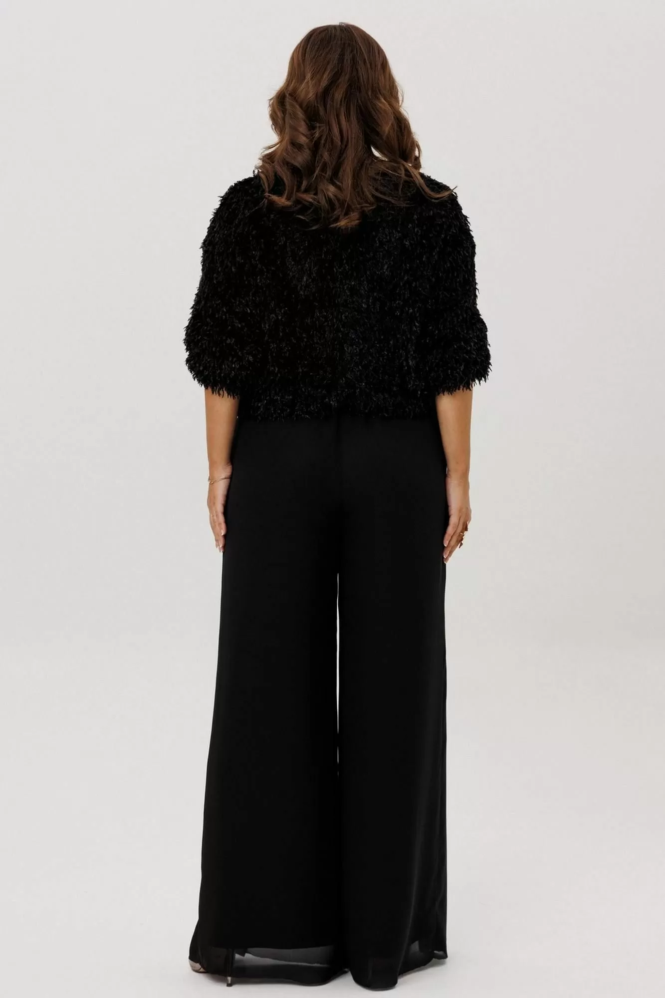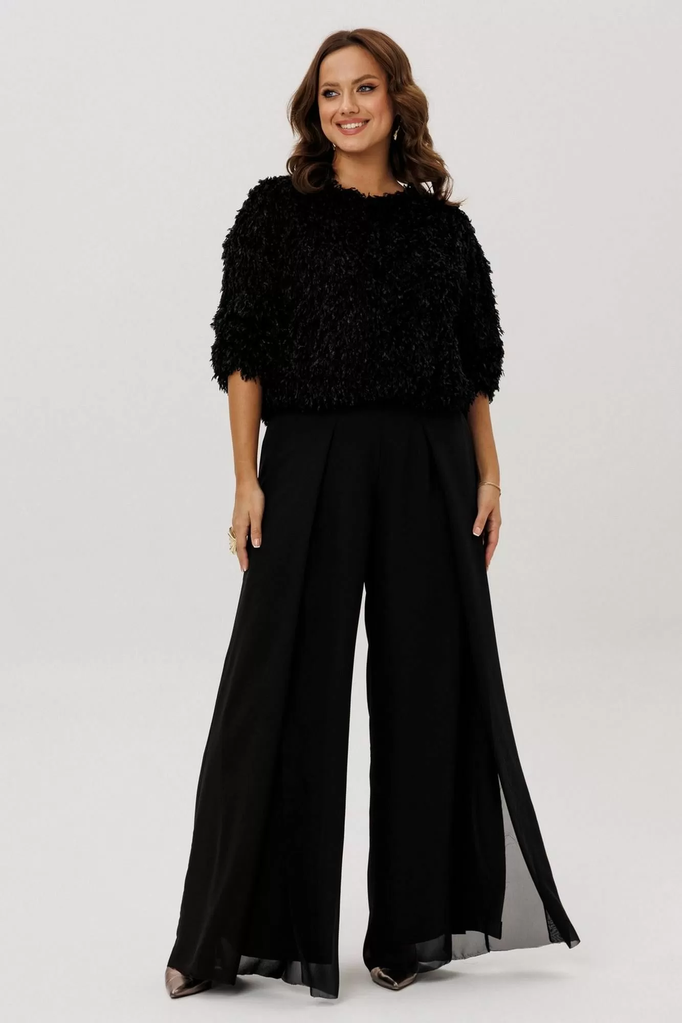 Брюки -палаццо двойные. По талии на резинке, по переду складки и разрезы. Без карманов.