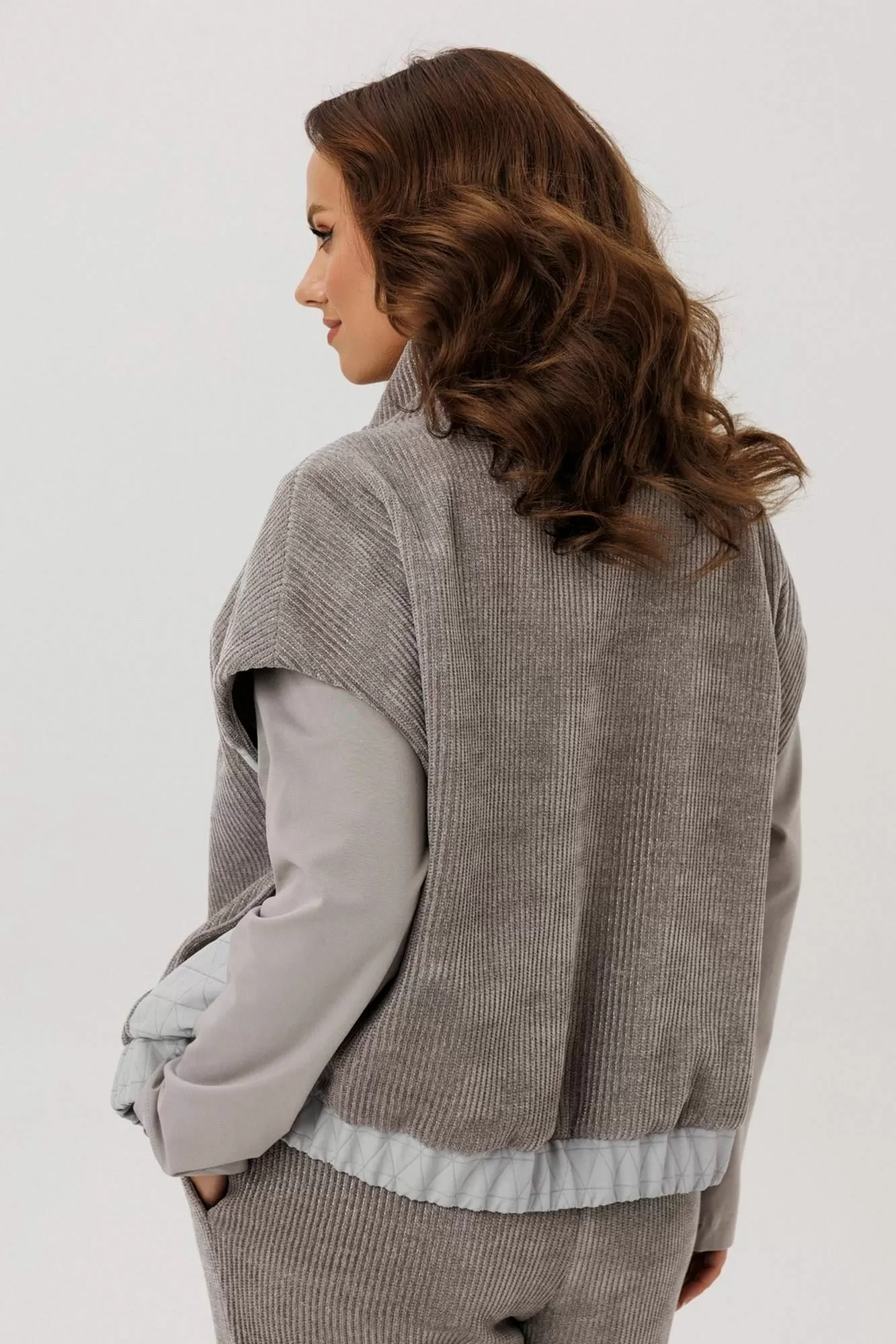 Жилет свободного силуэта, вырез горловины на стойке. Изделие без рукавов. По бокам бочки из отделочной ткани и карманы в шве. По низу изделие на резинке, застежка на тесьму-молнию по переду.