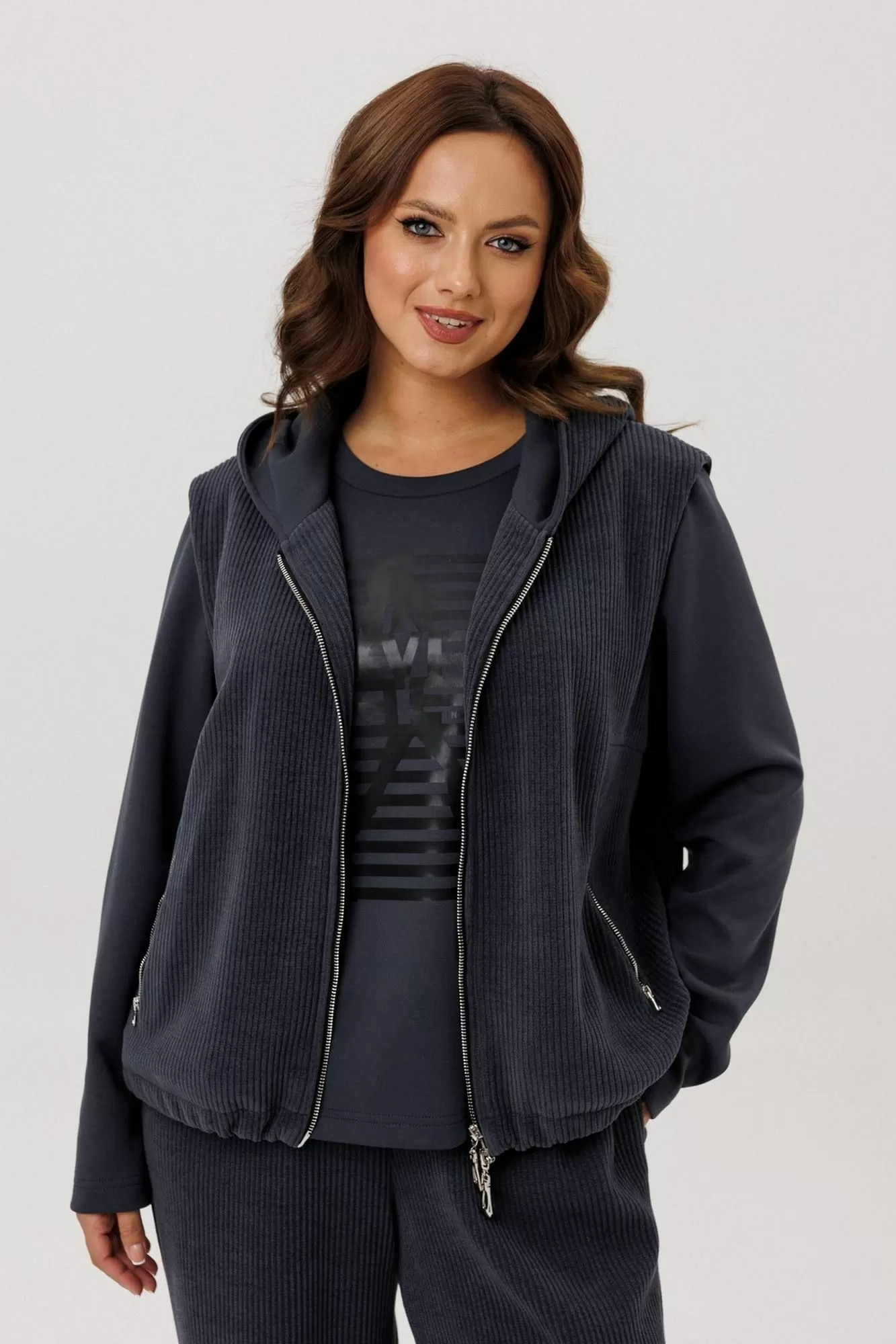 Жилет свободного силуэта с капюшоном, без рукавов. По переду карманы на молнии, по низу на кулисе-резинке.. Застежка на тесьму-молнию по переду.