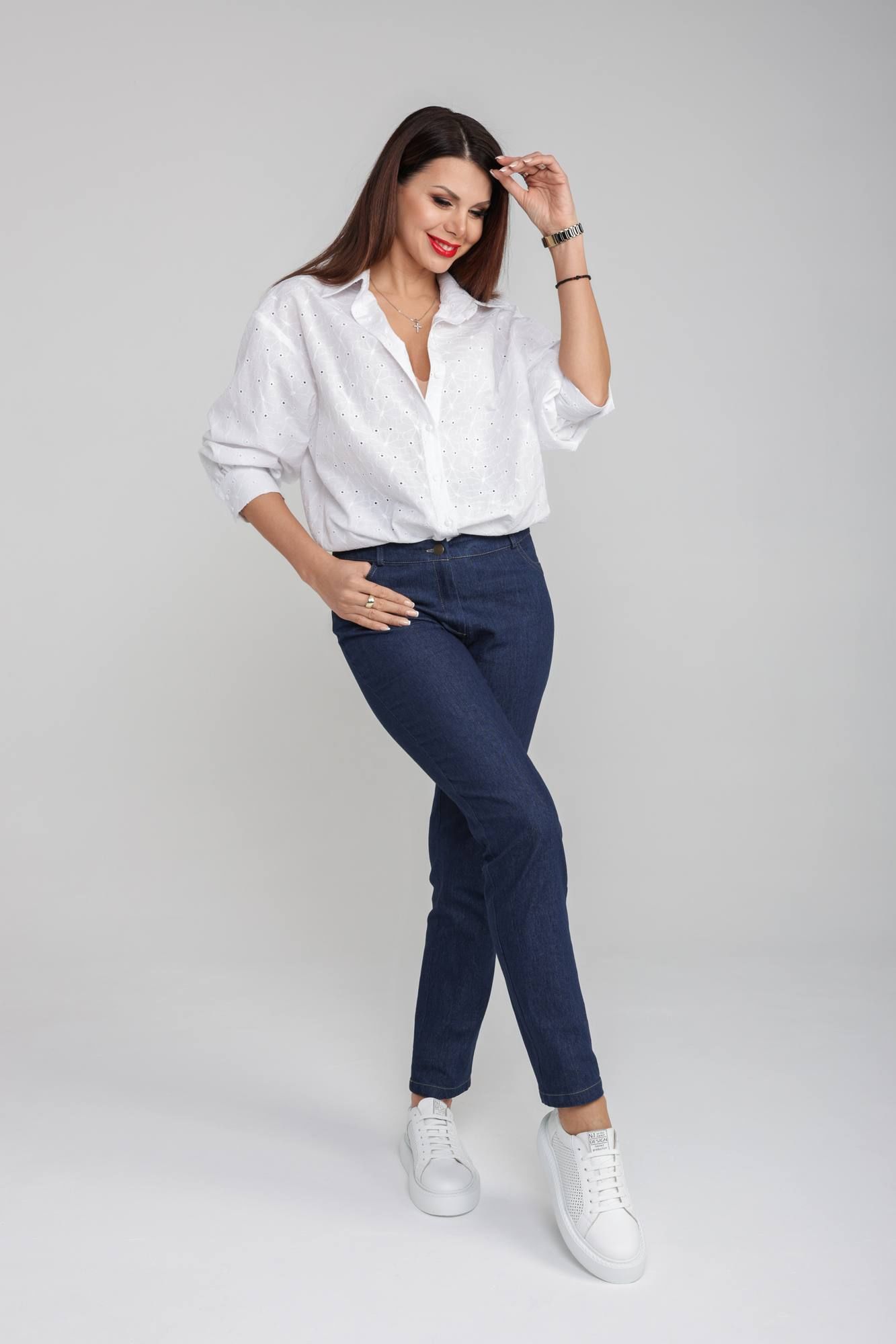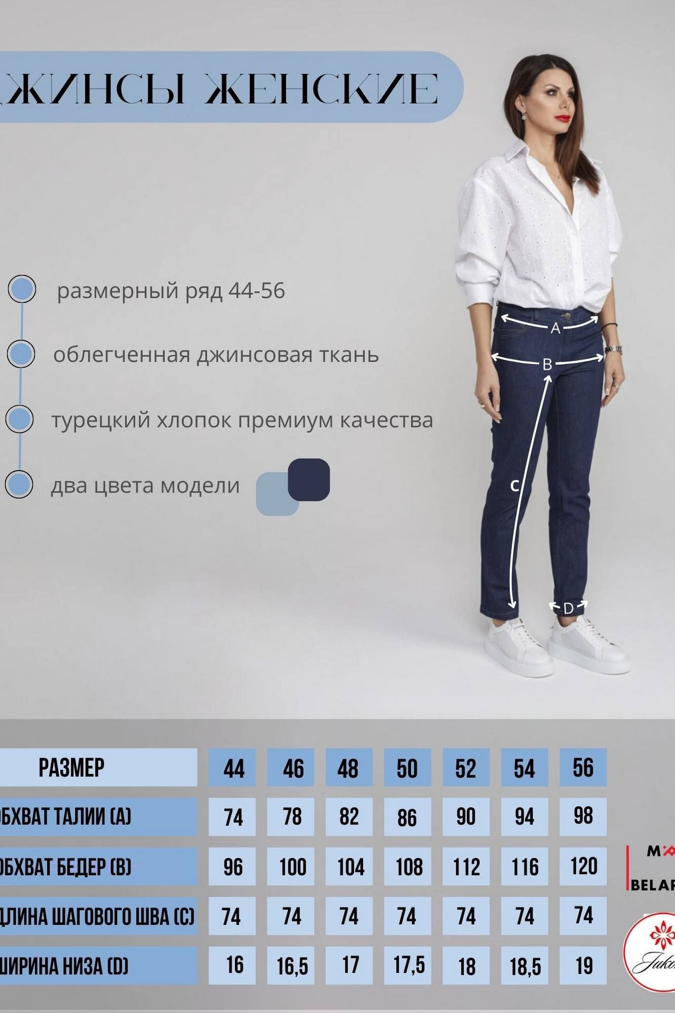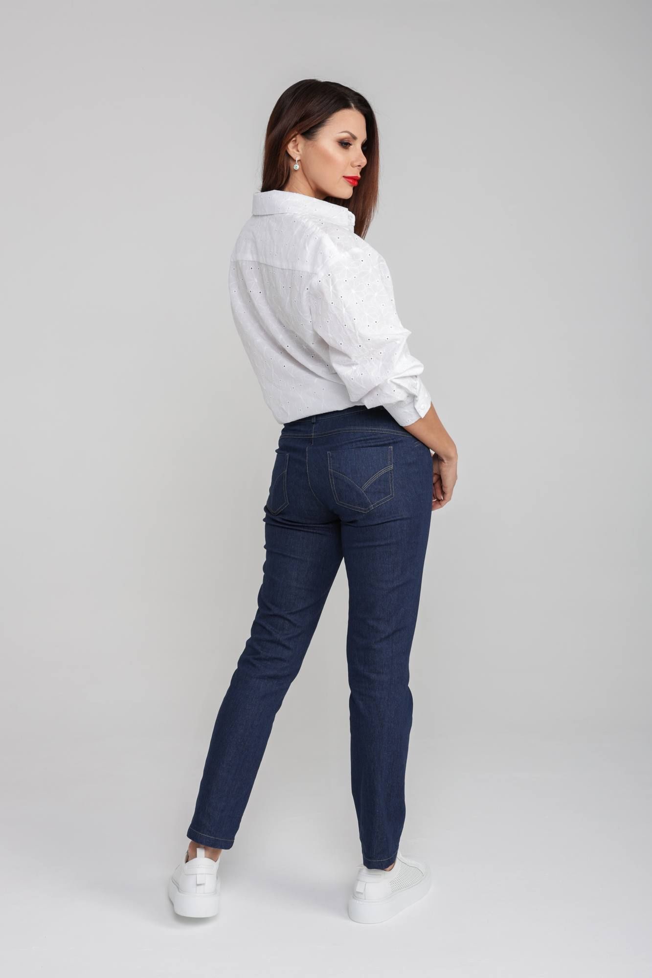1. Брюки женские. 2. Брюки облегающего силуэта, немного укороченные. 3.Застежка молния и обметанная петля пуговица. 4.На передних частях выполнены боковые карманы с отрезным бочком с отделочными строчками. 5. Спинка с кокетками и накладными карманами 6. Длина шагового шва-74 см. 7. Бережная стирка при 30 градусах.
