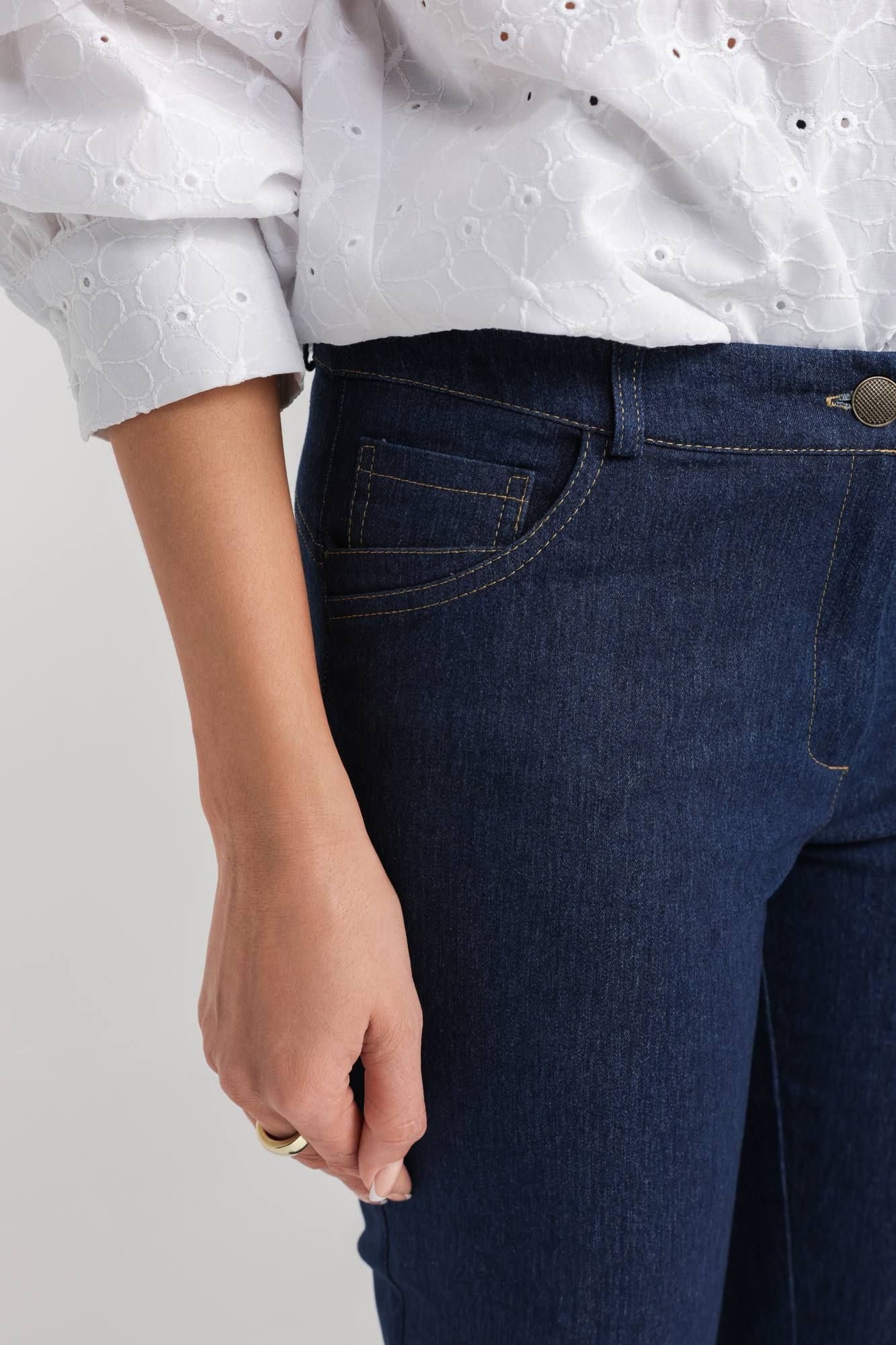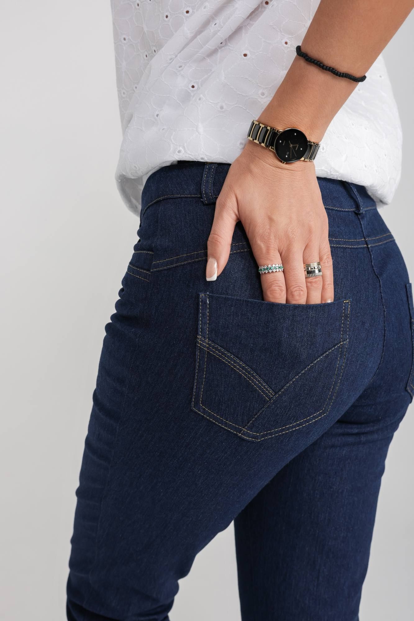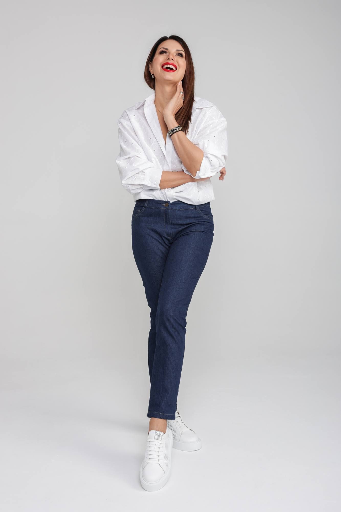 1. Брюки женские. 2. Брюки облегающего силуэта, немного укороченные. 3.Застежка молния и обметанная петля пуговица. 4.На передних частях выполнены боковые карманы с отрезным бочком с отделочными строчками. 5. Спинка с кокетками и накладными карманами 6. Длина шагового шва-74 см. 7. Бережная стирка при 30 градусах.