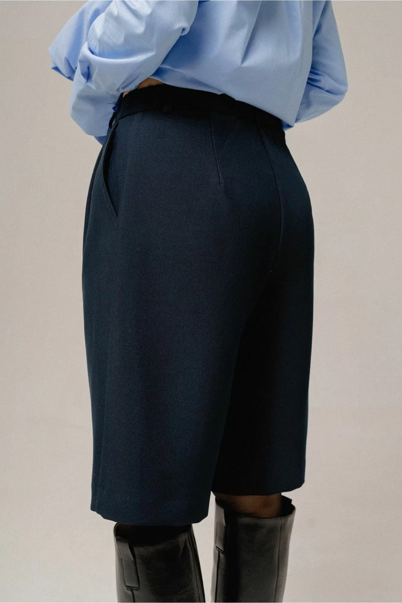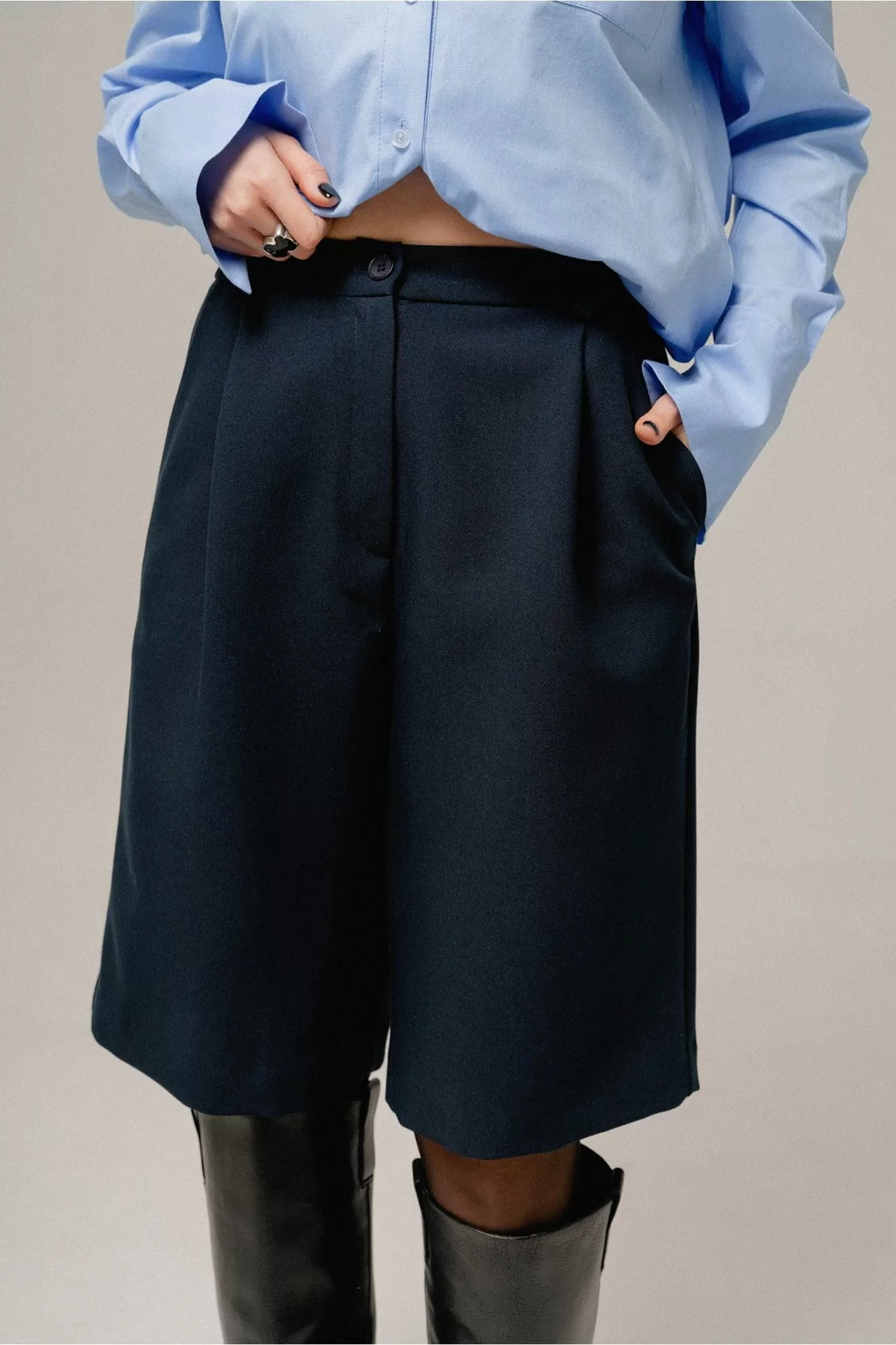 Шорты молодежные из костюмной ткани прямого расширенного силуэта,на притачном поясе прямого силуэта, с наклонными карманами и застежкой "гульфик" по переду, и эластичной тесьмой по спинке пояса. Длина по колено.