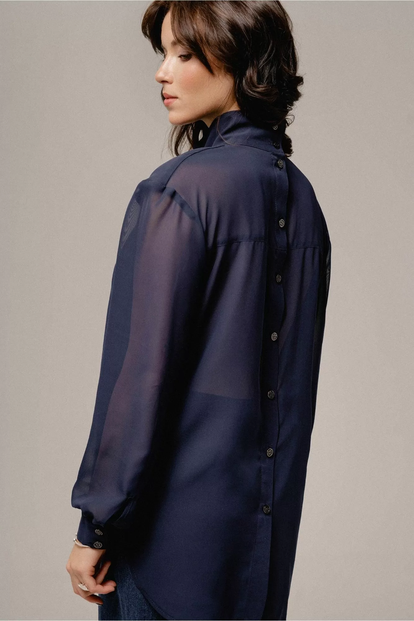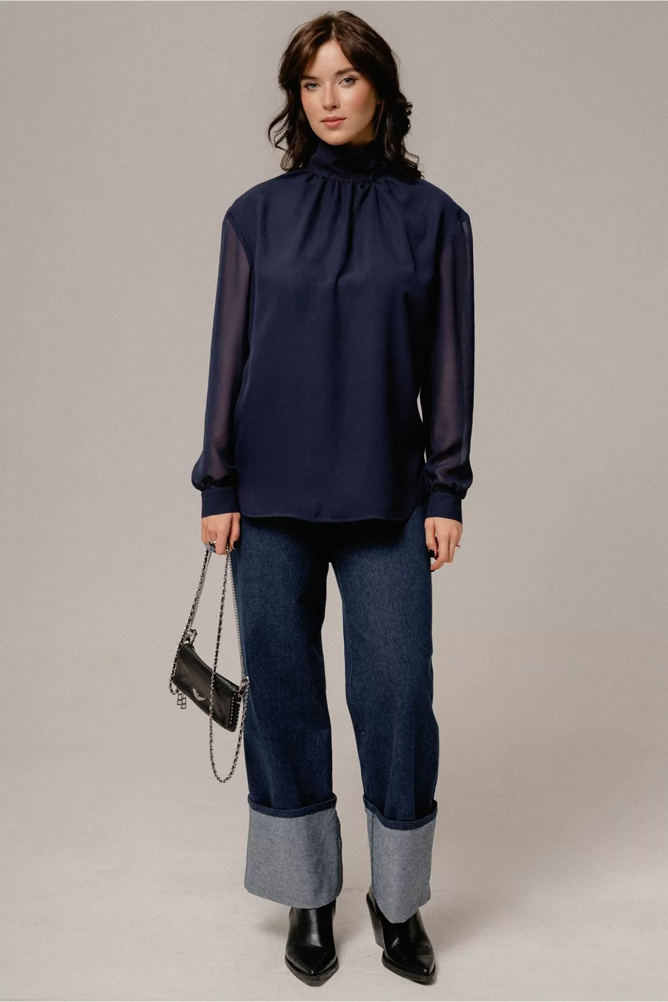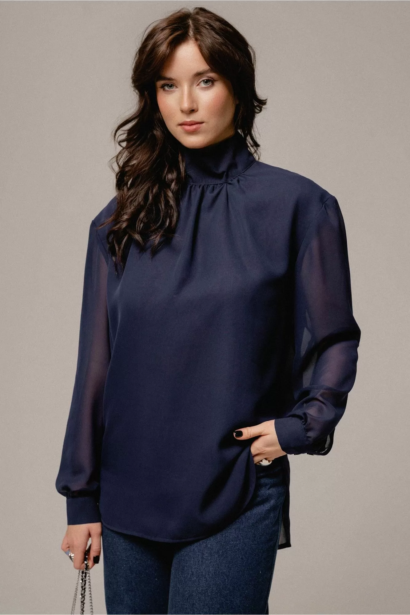 Блузка из шифона , прямого силуэта. С застежкой по спинке на петли-пуговицы ,рукав рубашечного типа на притачной манжете. Перед двойной со сборкой по линии горловины,спинка с кокеткой.Воротник стойка.