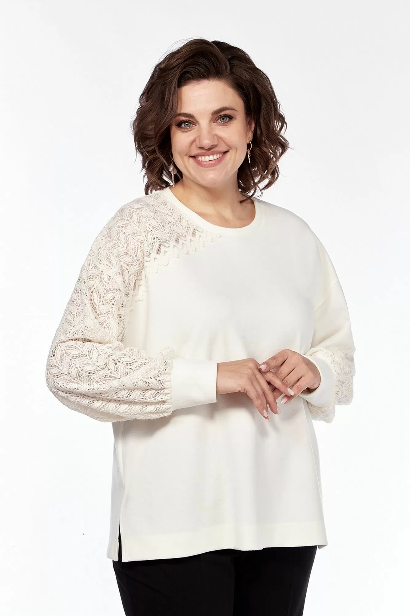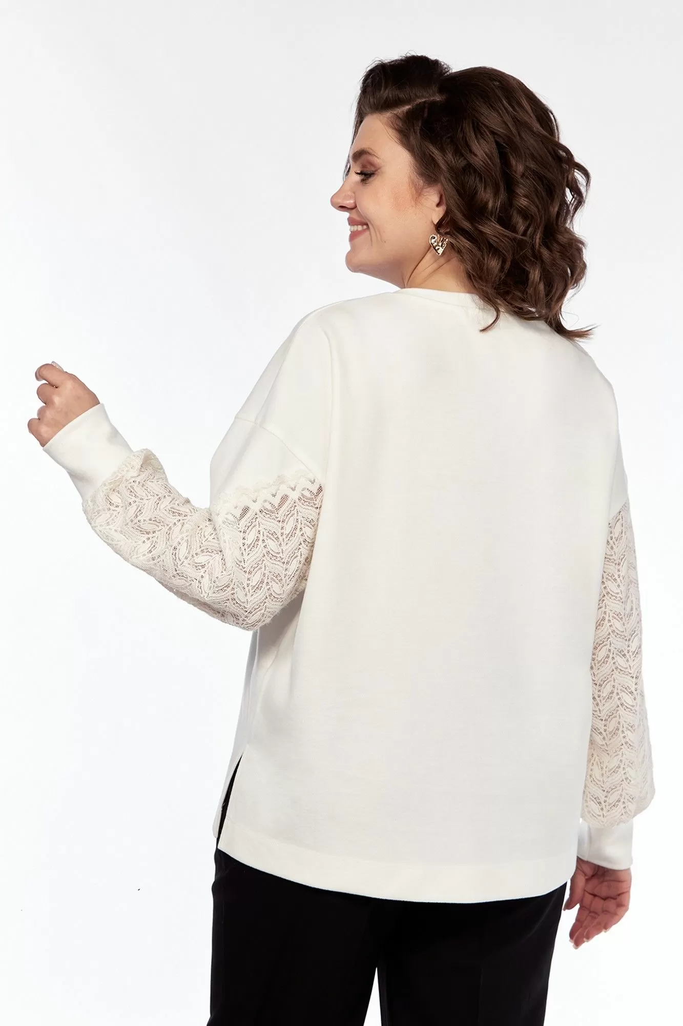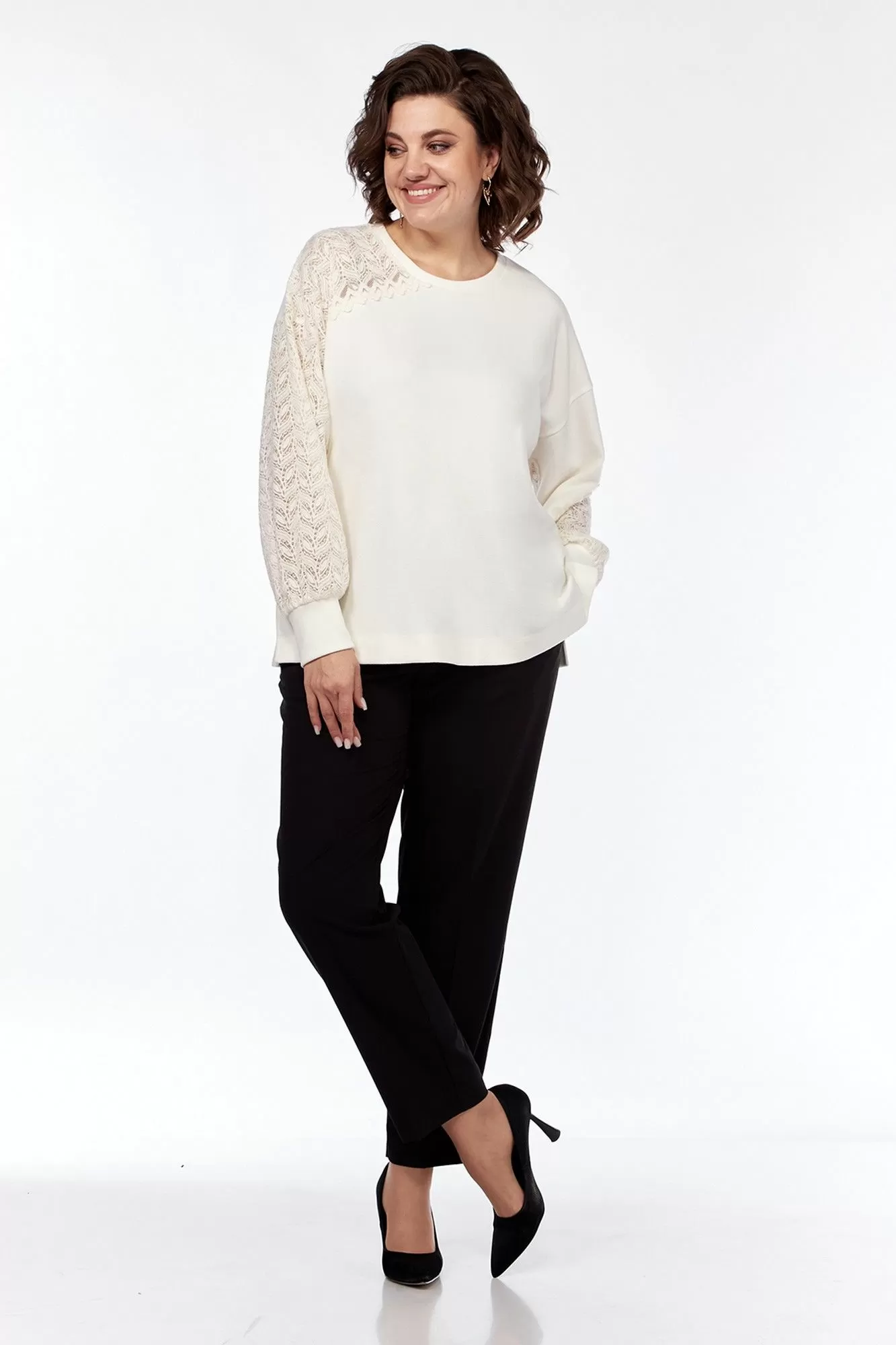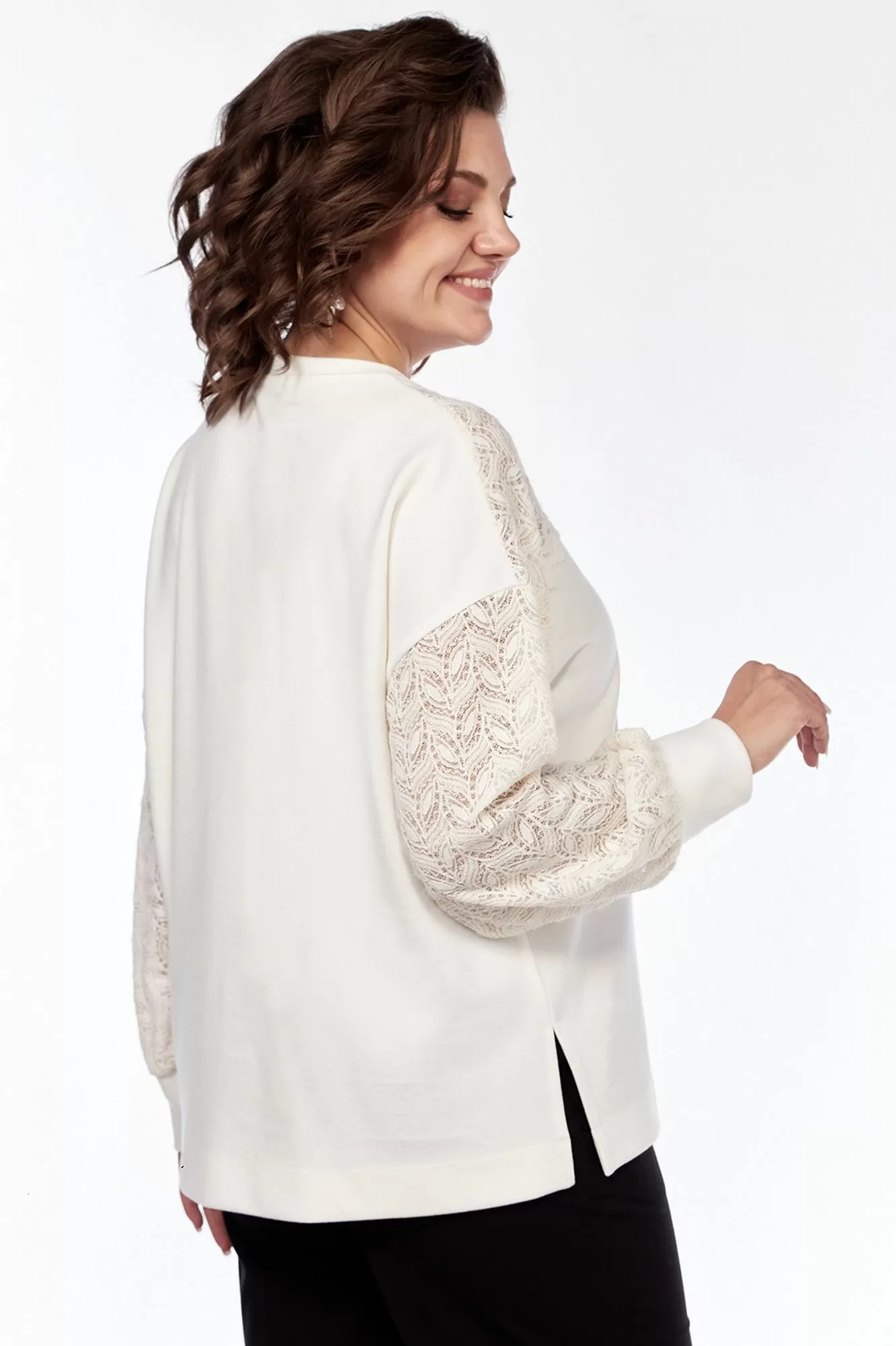 Джемпер женский, свободного силуэта, выполнен из трикотажного полотна в комбинации с трикотажным кружевом. Горловина округлой формы обработана планкой. Перед с асимметричной кокеткой из кружева. Рукава спущенные на манжете. Правый рукав из кружевного полотна, левый с кружевной вставкой. Спинка цельнокроенная. По боковым швам обработаны разрезы.