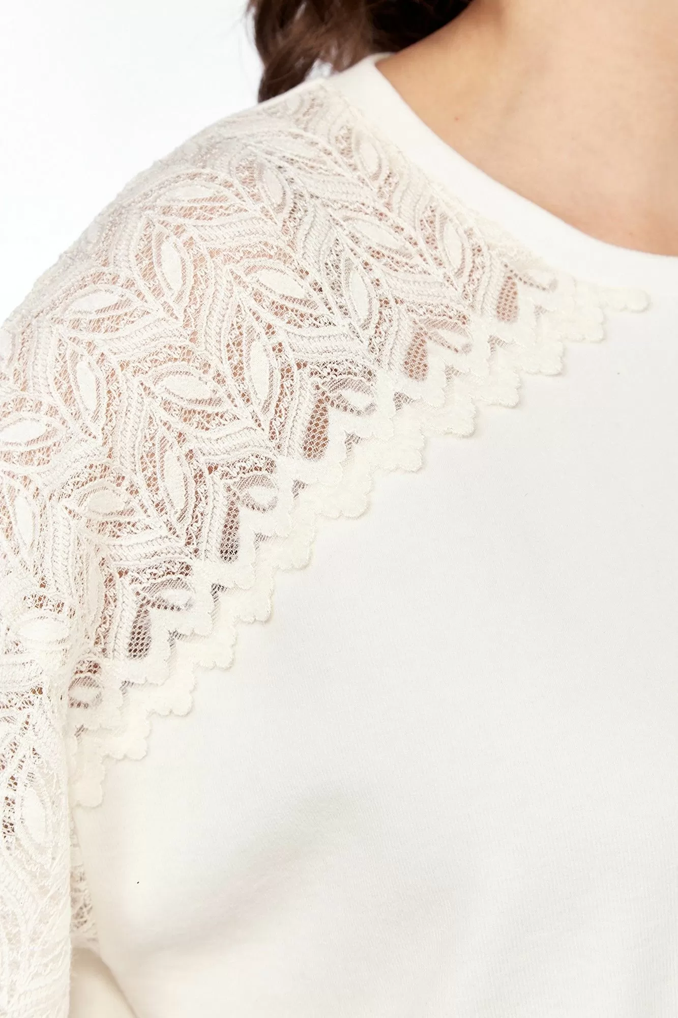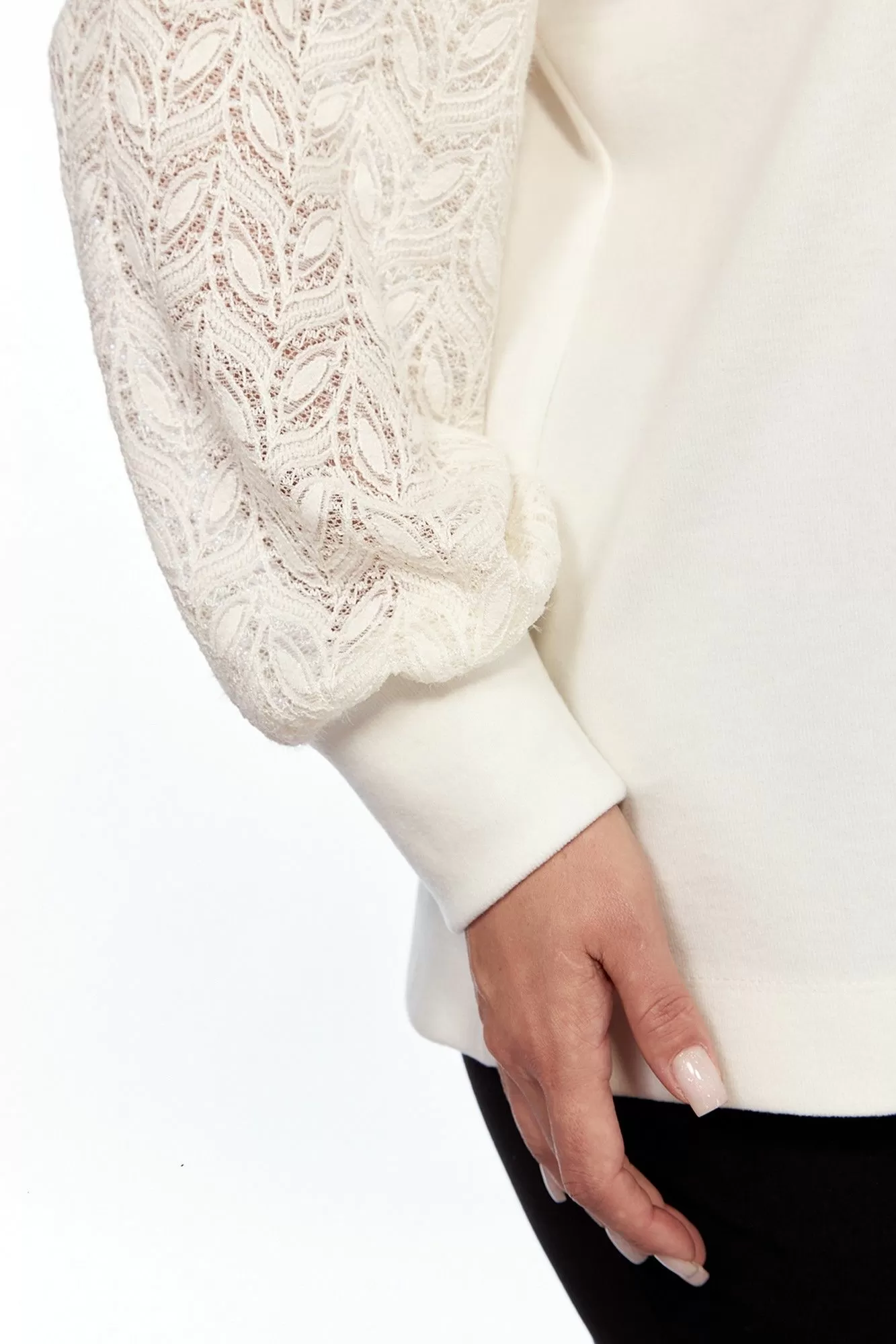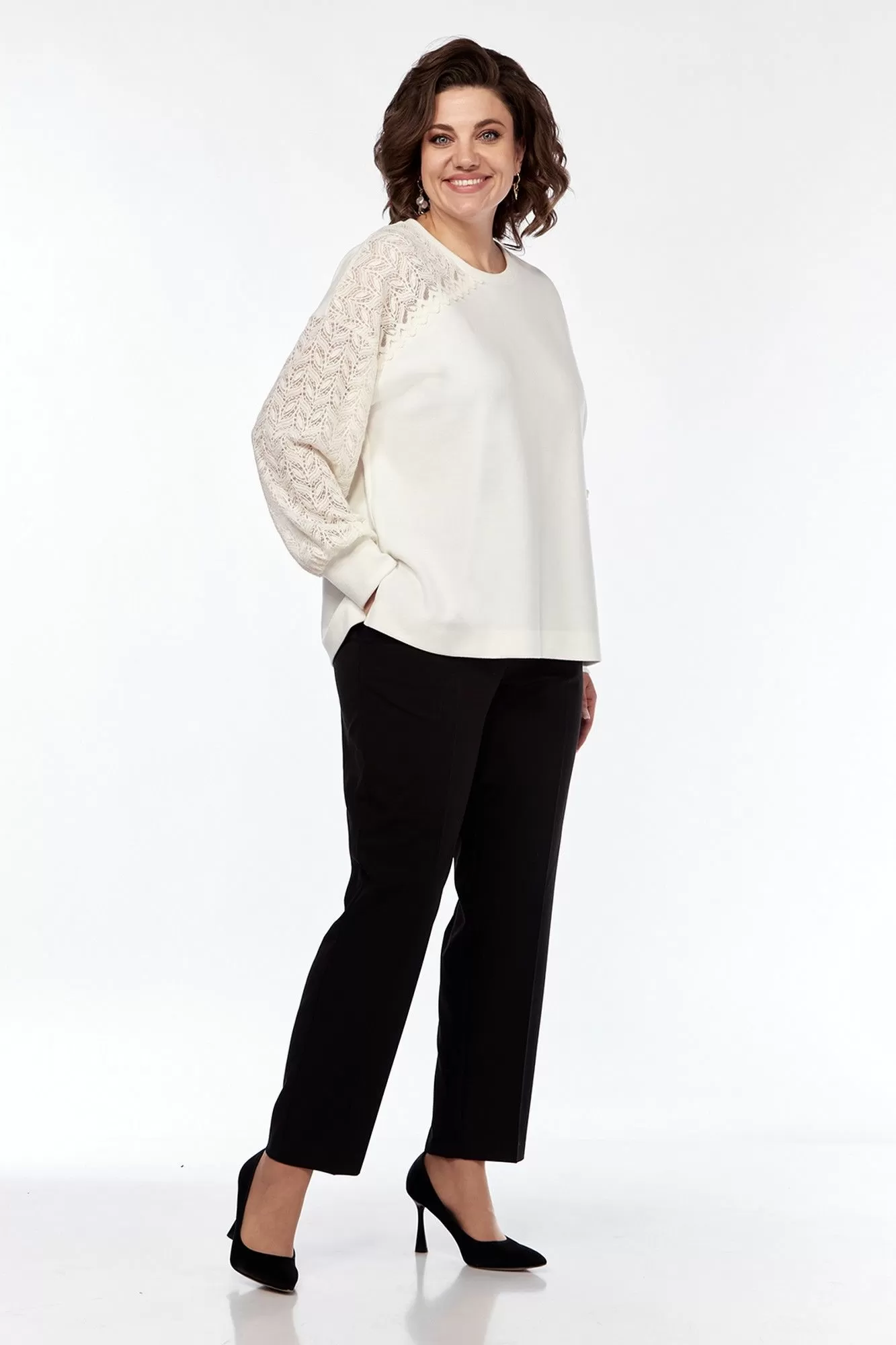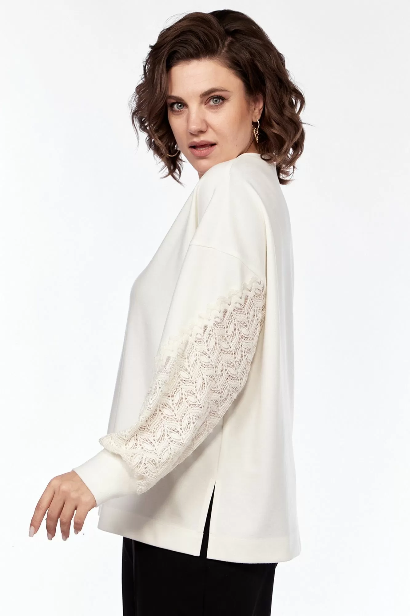 Джемпер женский, свободного силуэта, выполнен из трикотажного полотна в комбинации с трикотажным кружевом. Горловина округлой формы обработана планкой. Перед с асимметричной кокеткой из кружева. Рукава спущенные на манжете. Правый рукав из кружевного полотна, левый с кружевной вставкой. Спинка цельнокроенная. По боковым швам обработаны разрезы.