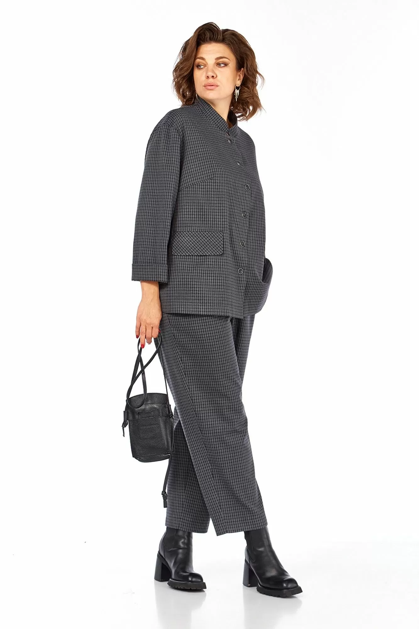 Костюм брючный, изготовлен из костюмной ткани. Жакет прямого силуэта. Горловина обработана воротником-стойкой, застежка центрально-бортовая на петли и пуговицы. На полочке нагрудные вытачки, обработаны карманы. Рукава спущенные, длинные. Брюки свободного кроя, пояс притачной, сзади на резинке. Застежка на тесьму-молнию и петлю пуговицу. На передних частях брюк в подрезных деталях обработаны карманы.