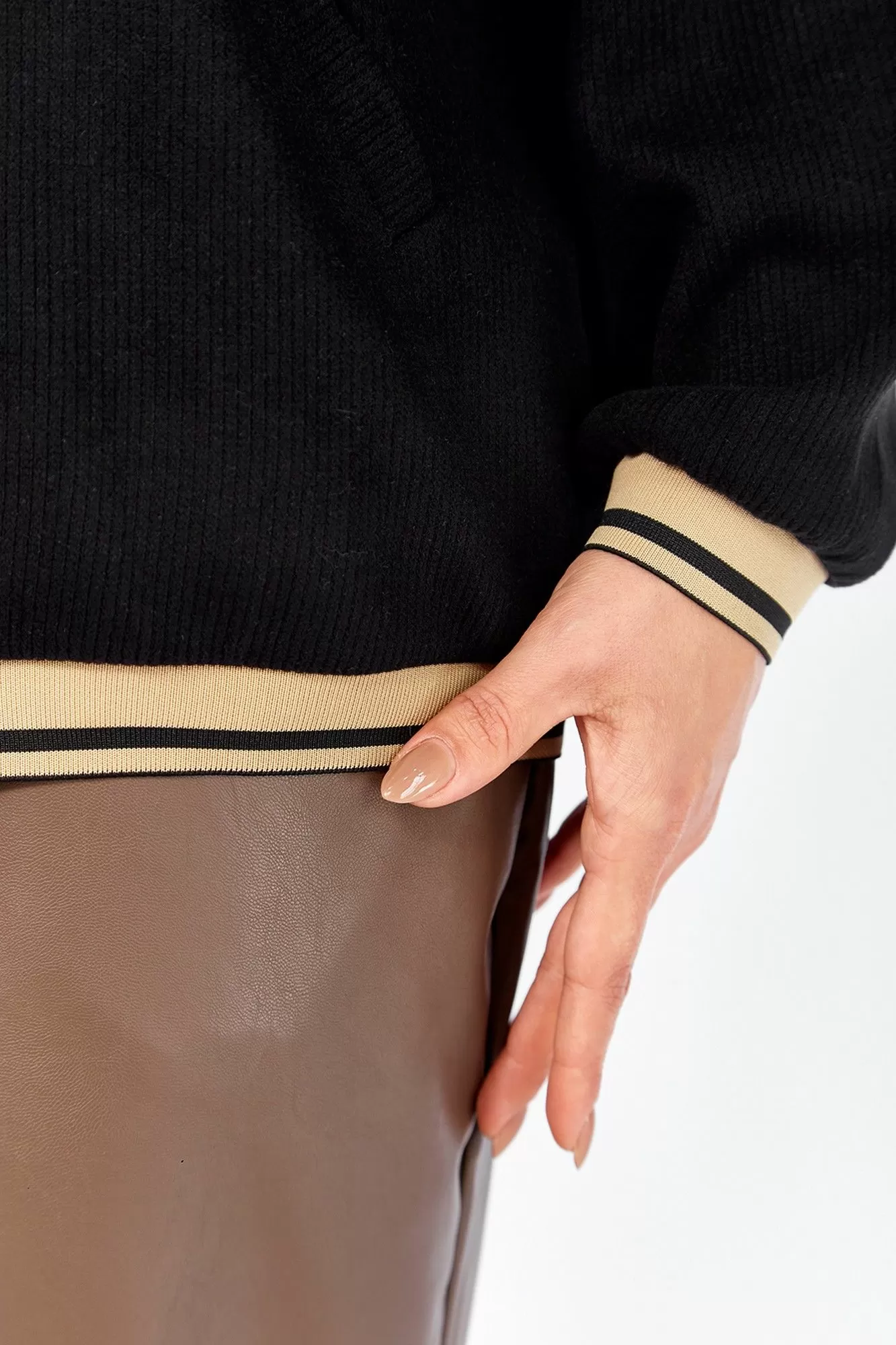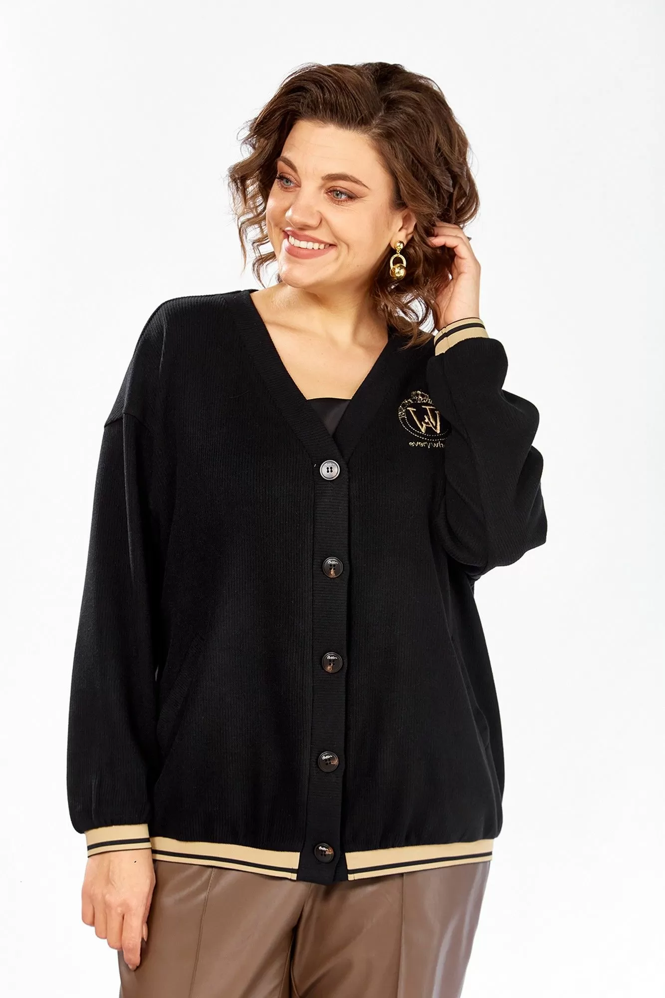Кардиган женский, изготовлен из трикотажного полотна. Горловина V-образной формы, застежка отрезная планка на петли и пуговицы. Карманы с листочками. По низу изделия и низу рукавов-декоративные довязы. Спинка цельнокроенная. Рукава спущенные длинные. Отделочный элемент — вышивка на детали переда.