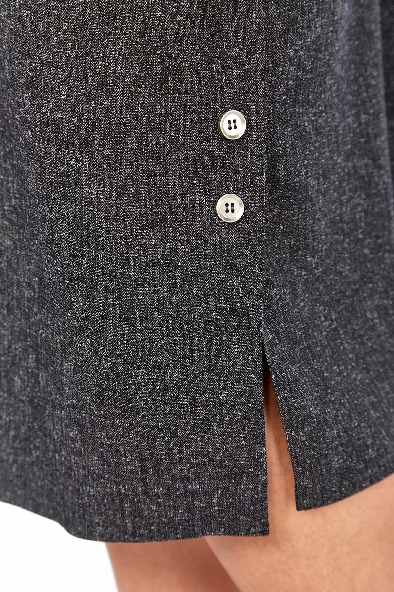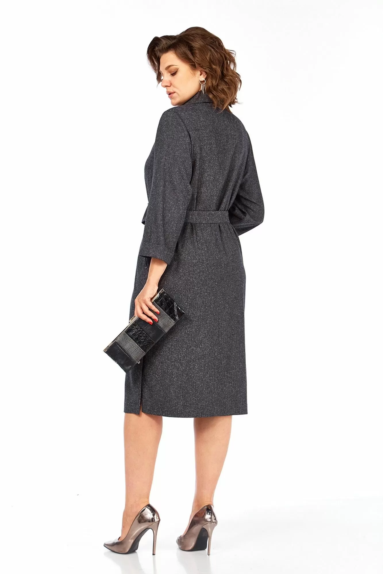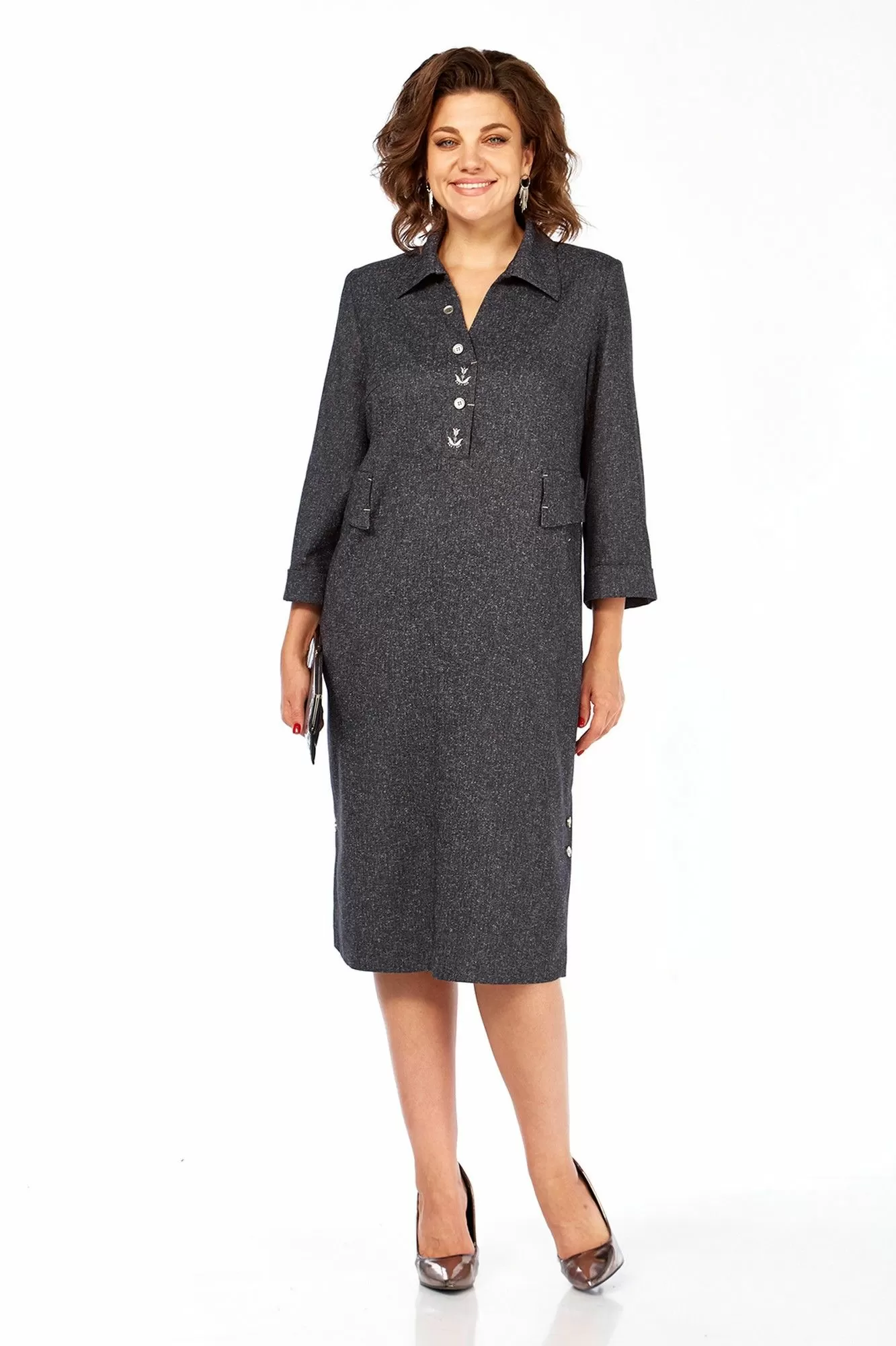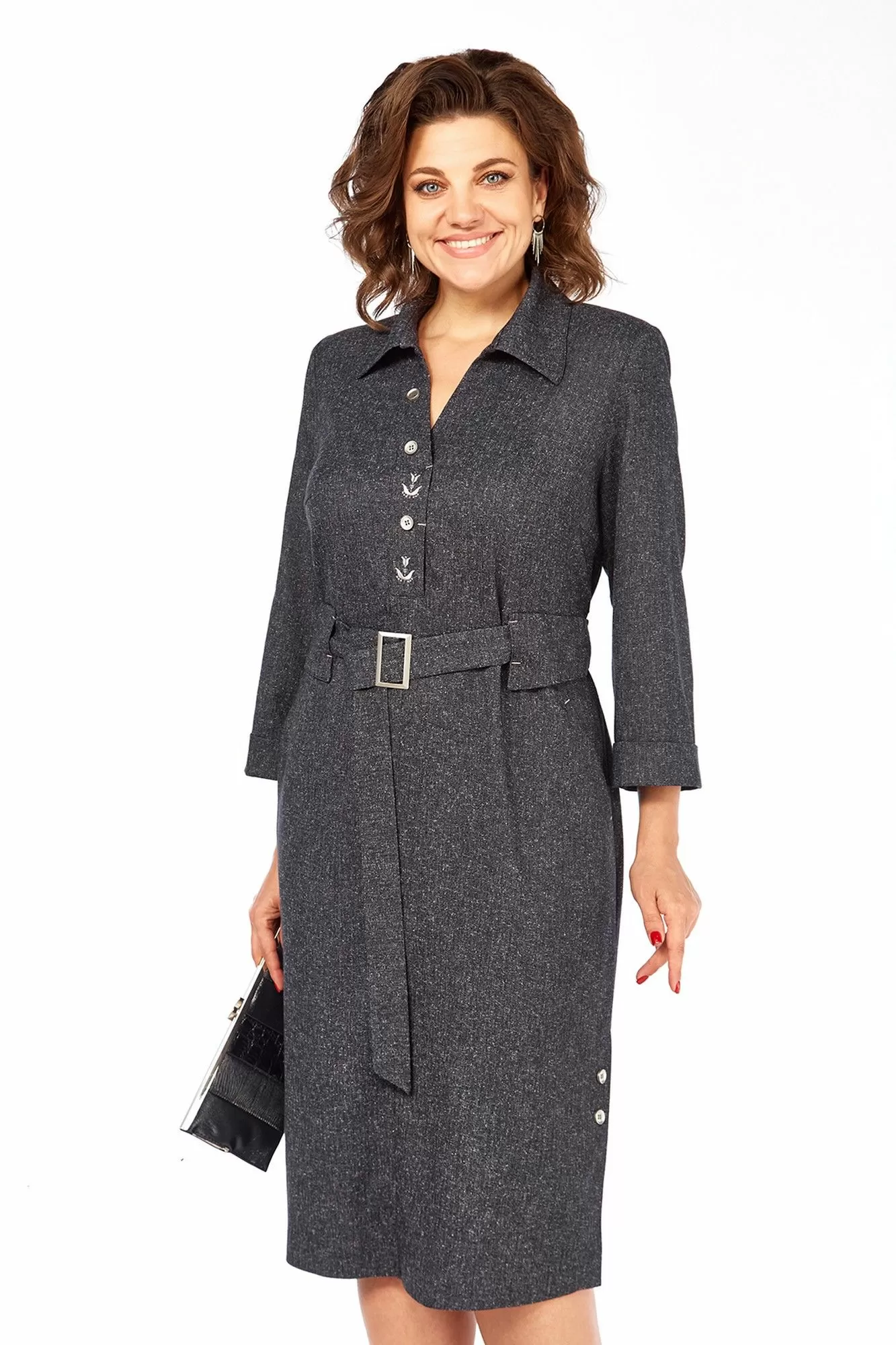 Платье женское прямого силуэта, изготовлено из плательной ткани. По переду нагрудные вытачки и фигурные подрезы с карманами в швах. Горловина оформлена планками с декоративной вышивкой и пуговицами, воротник стояче-отложной. На талии декоративные шлевки и съемный пояс с пряжкой. По спинке кокетка и средний шов. В боковых швах внизу обработаны шлицы декорированы пуговицами.