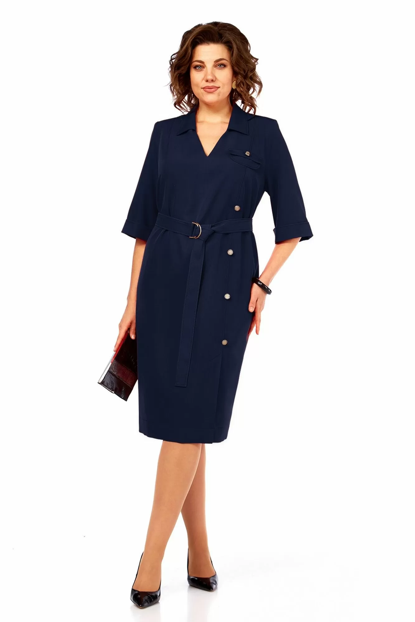 Платье женское прямого силуэта, выполнено из костюмно-плательной ткани. Вырез V-образной формы с отложным воротником. По переду обработан ассиметричный рельеф со шлицей по низу и декоративный клапан на груди. Спинка с кокеткой и средним швом. Рукава втачные, по низу отложные манжеты. Платье дополнено съемным поясом из основной ткани с полукольцами и декоративными пуговицами.