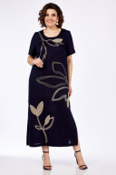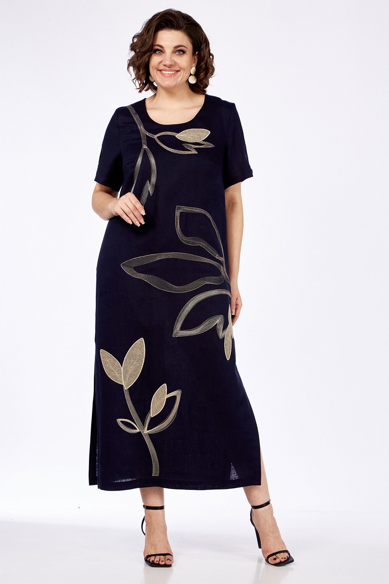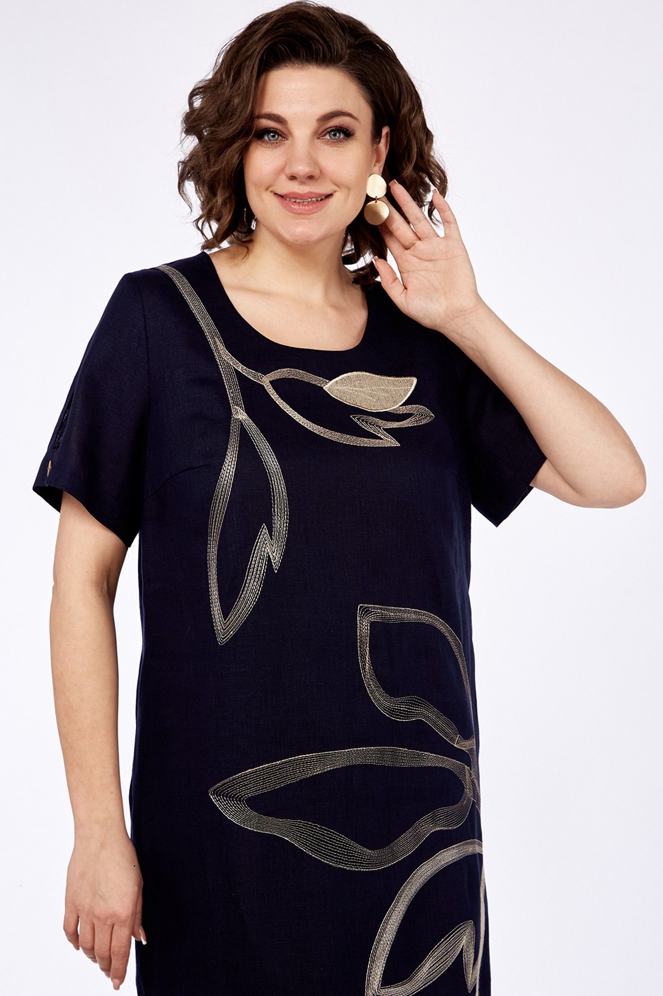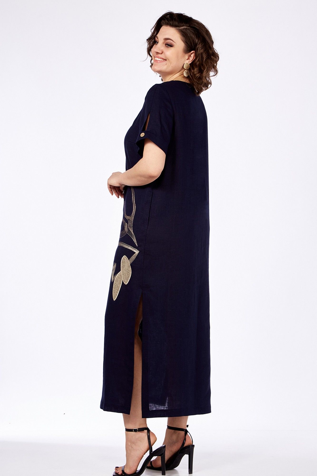 Платье женское прямого силуэта, изготовлено из натуральной ткани. Горловина круглой формы. По переду нагрудные вытачки. На спинке средний шов. В боковых швах обработаны карманы, внизу разрезы. Рукава втачные, разрезные с фигурным вырезом. Платье декорировано дизайнерской вышивкой. Длина платья по спинке — 129 см. р.50 — ПОГ 55 см, ПОБ 58 см. р.52 — ПОГ 57 см, ПОБ 60 см, р.54 — ПОГ 59 см, ПОБ 62 см, р.56 — ПОГ 61 см, ПОБ 64 см, р.58 — ПОГ 63 см, ПОБ 66 см, р.60 — ПОГ 65 см, ПОБ 68 см.