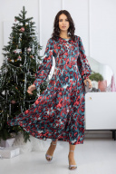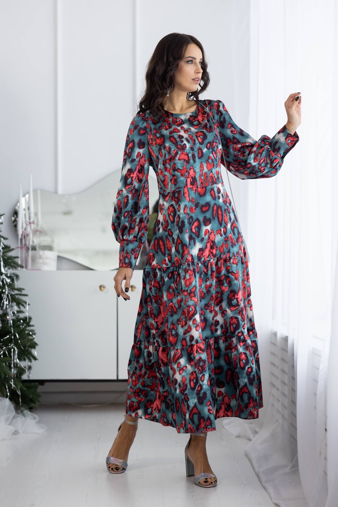 Платье миди с длинными объемными рукавами и абстрактным узором в красно-голубой гамме. Платье имеет круглый вырез и свободный крой в верхней части, переходящий в расклешенную юбку с оборкой по низу. Узор на платье создает эффект акварельных разводов, придавая ему живописность. Длина миди делает платье подходящим для различных мероприятий, а длинные рукава обеспечивают комфорт в прохладную погоду. Длина изделия-124 см, длина рукава-56 см