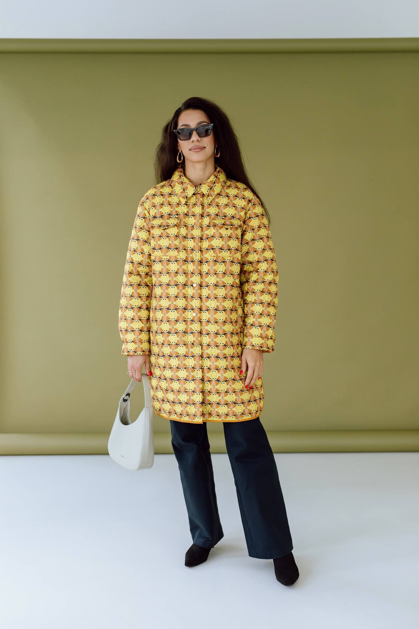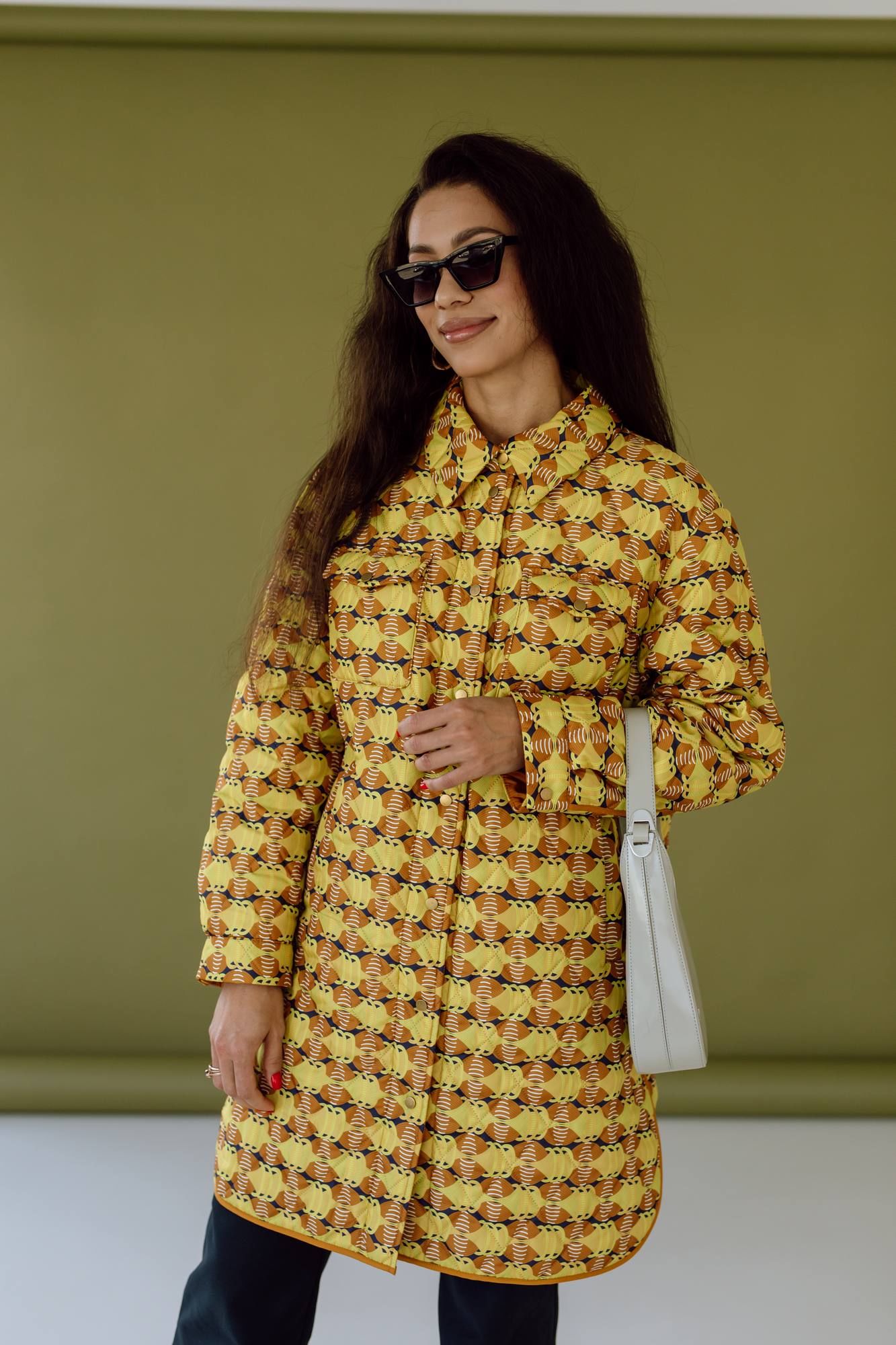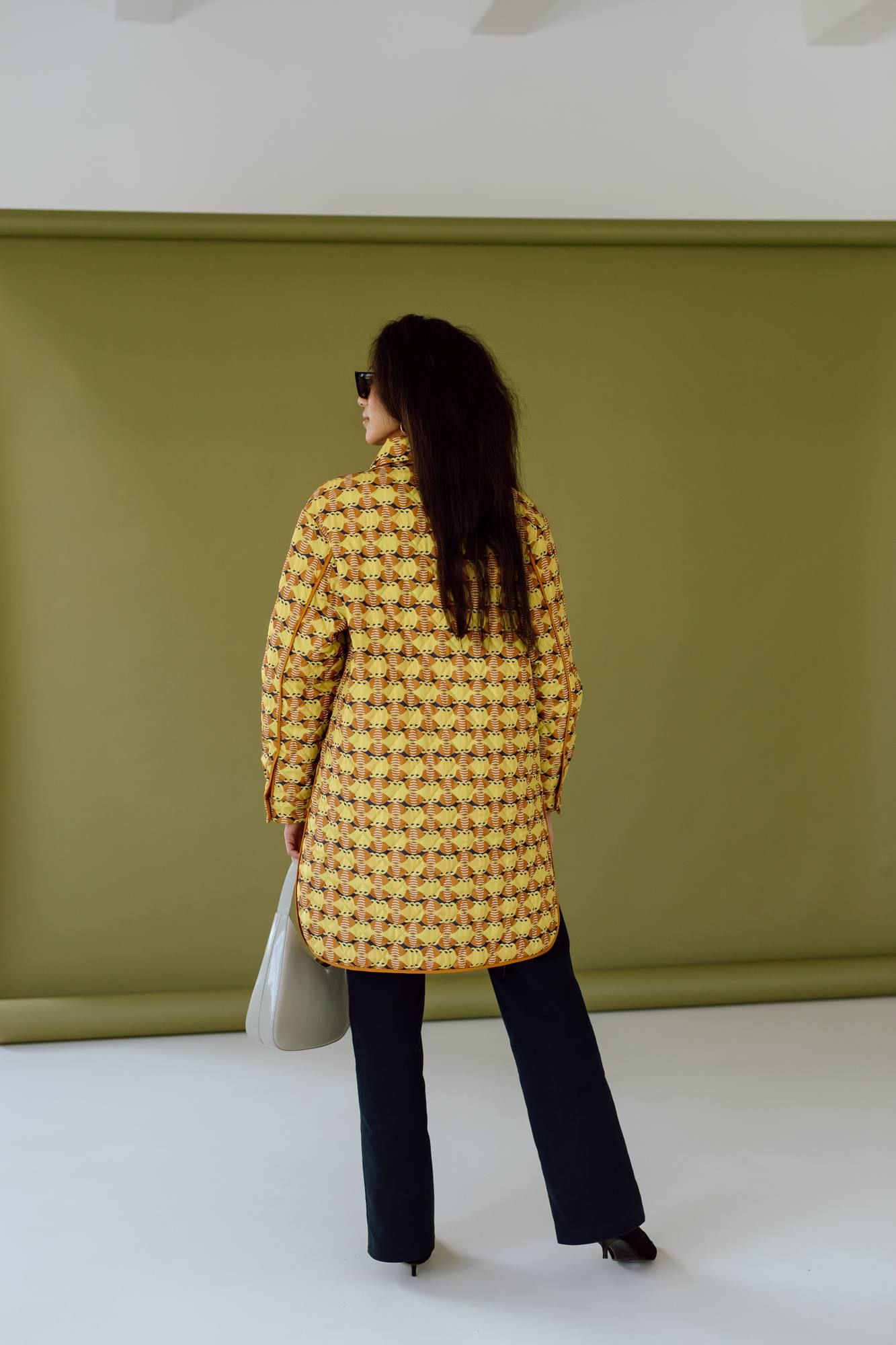 Яркая жёлтая стёганая куртка мгновенно привлекает внимание своим необычным узором. Куртка имеет прямой силуэт и длину до середины бедра, что делает её удобной и практичной. Отложной воротник и застежка на пуговицы придают куртке классический вид, а стеганый узор добавляет ей текстуры и объема. Накладные карманы на груди добавляют функциональности и стиля. Эта куртка идеально подойдет для тех, кто любит выделяться из толпы и создавать яркие образы.Длина изделия-91см, длина рукава-49 см