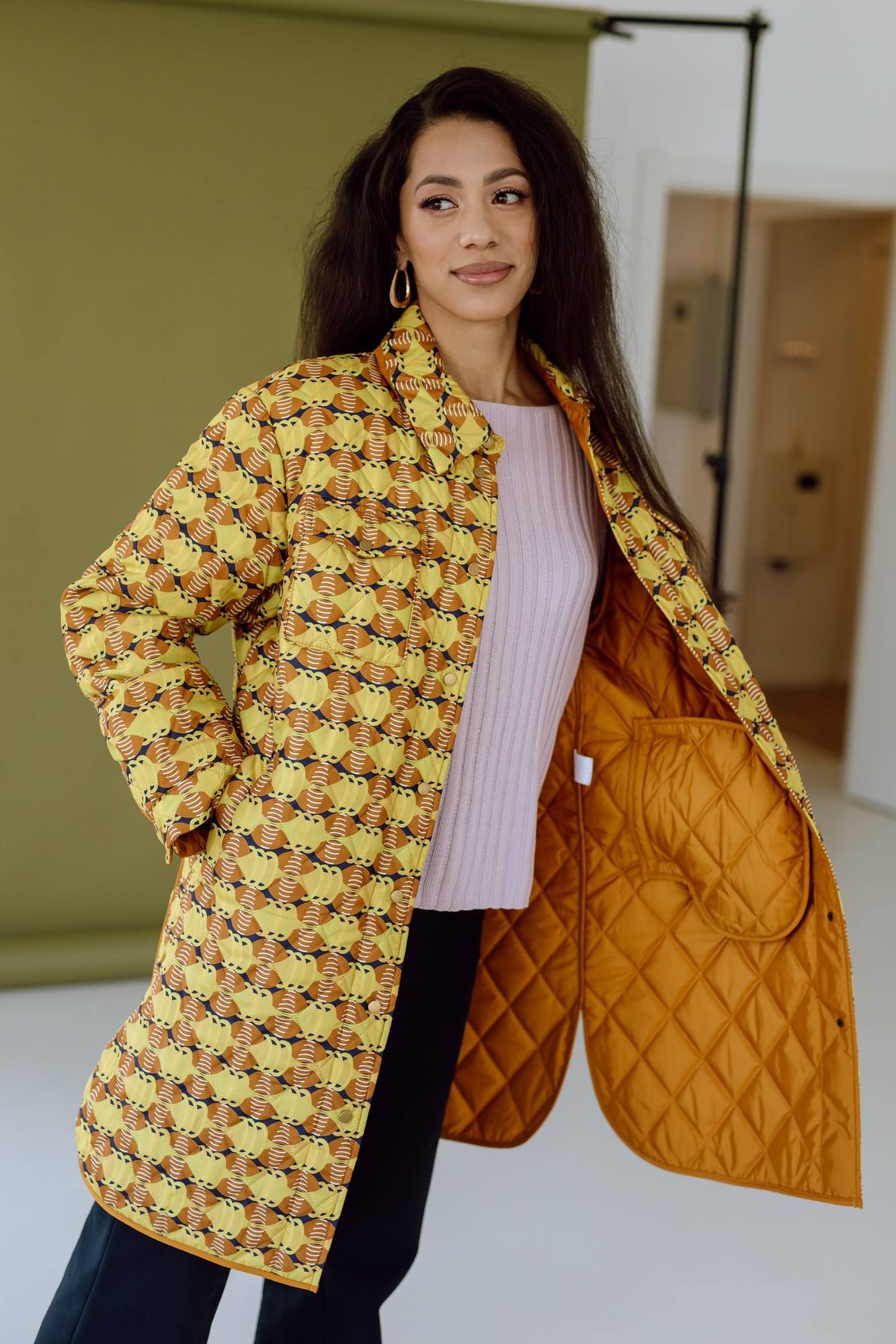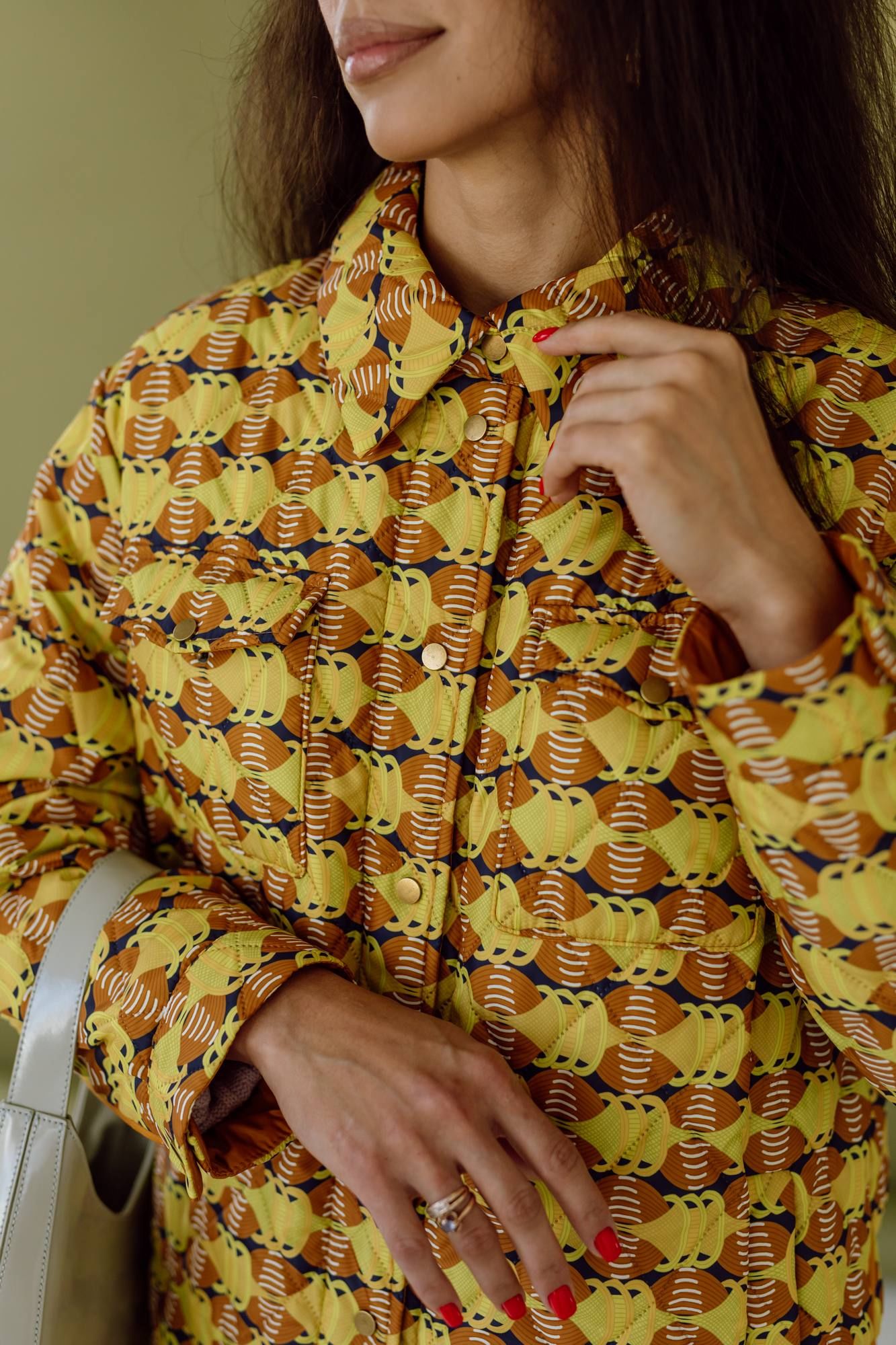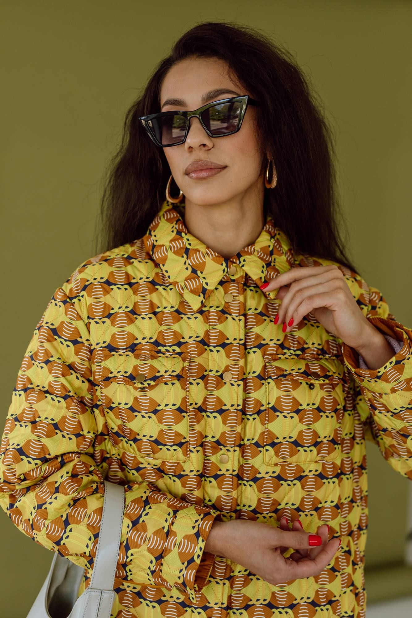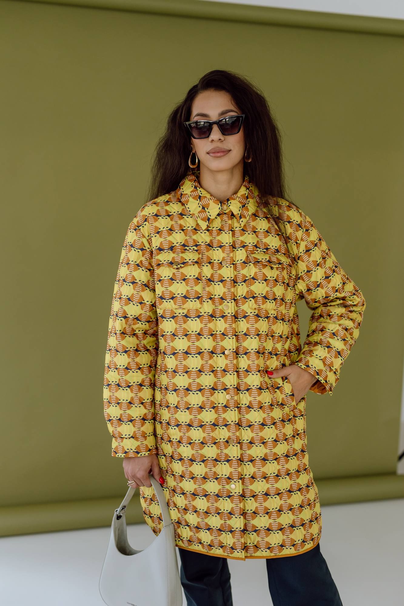 Яркая жёлтая стёганая куртка мгновенно привлекает внимание своим необычным узором. Куртка имеет прямой силуэт и длину до середины бедра, что делает её удобной и практичной. Отложной воротник и застежка на пуговицы придают куртке классический вид, а стеганый узор добавляет ей текстуры и объема. Накладные карманы на груди добавляют функциональности и стиля. Эта куртка идеально подойдет для тех, кто любит выделяться из толпы и создавать яркие образы.Длина изделия-91см, длина рукава-49 см