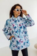 Эта куртка выделяется своим ярким и оригинальным принтом в стиле тай-дай. Сочетание небесно-голубого, белого и вкраплений фуксии создаёт живописный и свежий образ. Куртка имеет прямой силуэт и длину до середины бедра, что делает её удобной для повседневной носки. Воротник-стойка добавляет куртке современности и защищает от ветра. Незаметные карманы по бокам делают ее практичной, а стеганая текстура придает дополнительный объем и тепло.Длина изделия-73см, длина рукава-52 см
