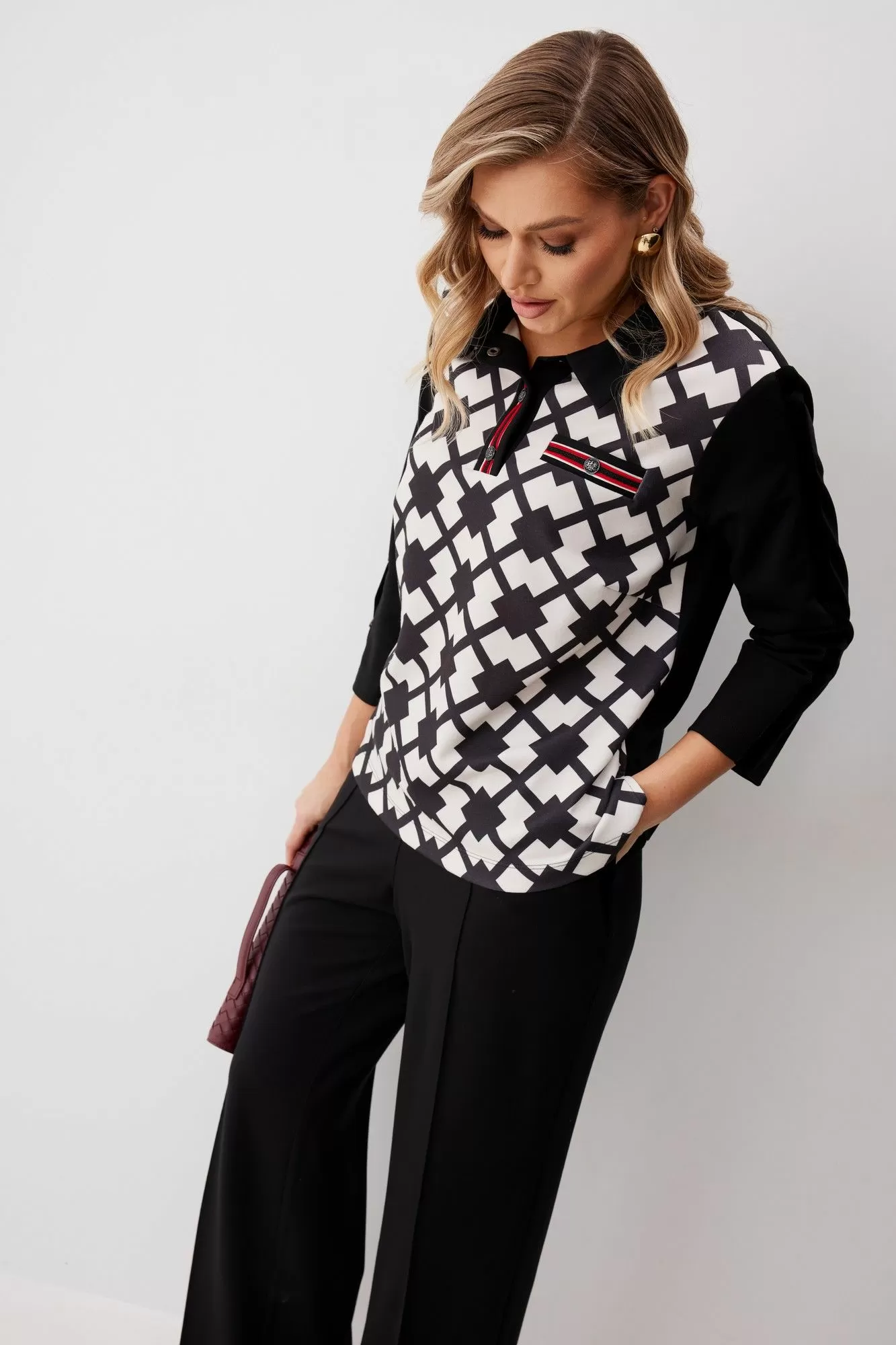 Костюм состоящий из блузы с брюками. Блуза по типу «поло» из трикотажной ткани длиной до середины бедра с застежкой до линии груди. Втачные планки обработаны декоративной тесьмой и застегиваются на кнопки. Перед выполнен из ткани с принтом. По левой половинке выполнен карман обманка с листочкой с декоративной тесьмой и кнопкой. Спинка прямая. Горловина обработана втачным воротником. Рукав ¾ прямой одношовный. На рукавах настрочена декоративная бархатная лента, на правом рукаве с тремя полукольцами. Брюки прямого силуэта из трикотажной ткани с поясом на частичной резинке. По передним половинкам брюк застрочены стрелки и выполнены наклонные карманы с отрезным бочком. Верх кармана декорирован бархатной тесьмой. По передним половинкам отстрочен гульфик (имитация). По спинке брюк застрочены вытачки. Длина спинки изделия 63,5 см, длина руква 50 см, длина брюк по боковому шву с поясом 115 см.