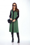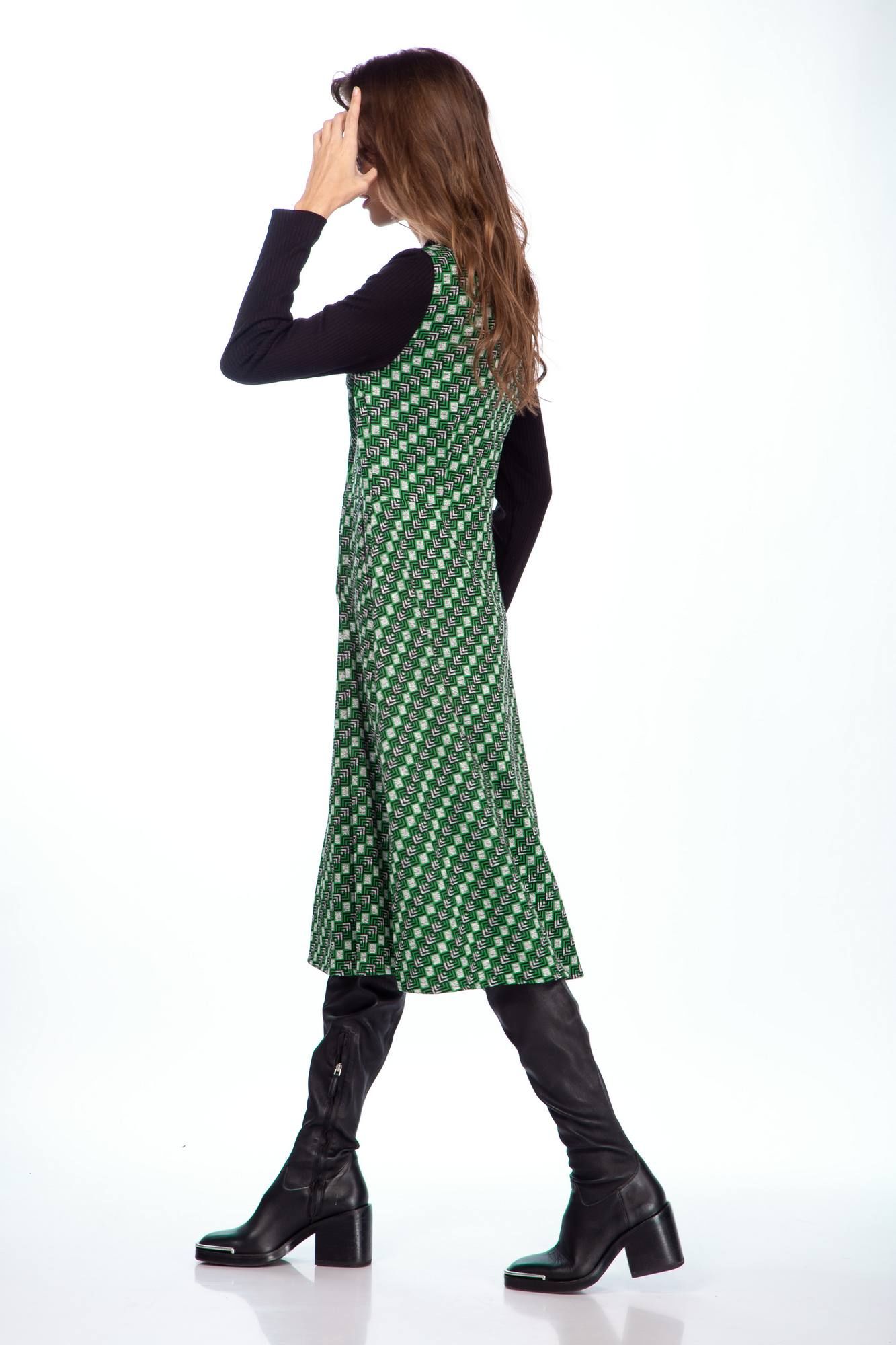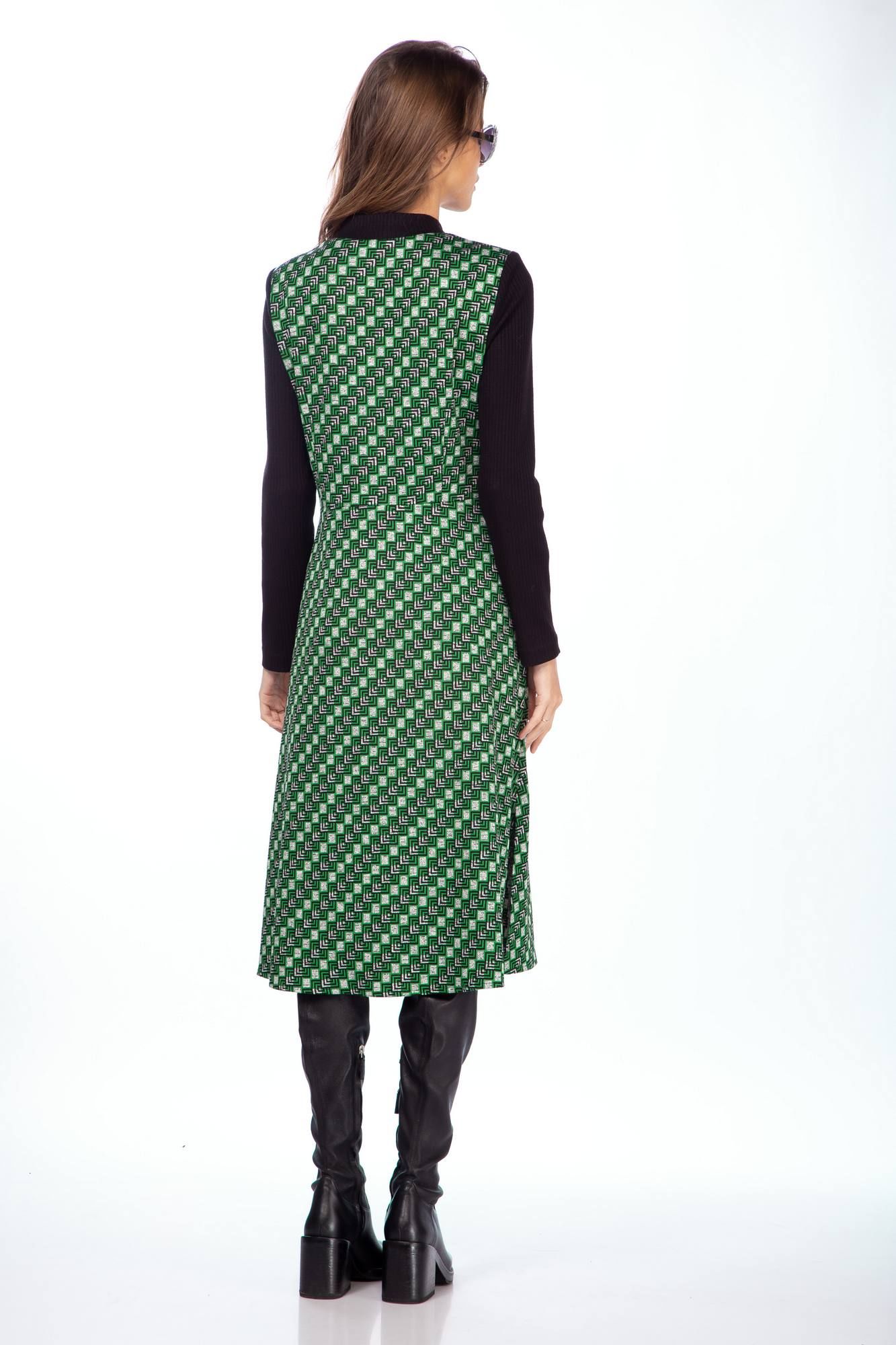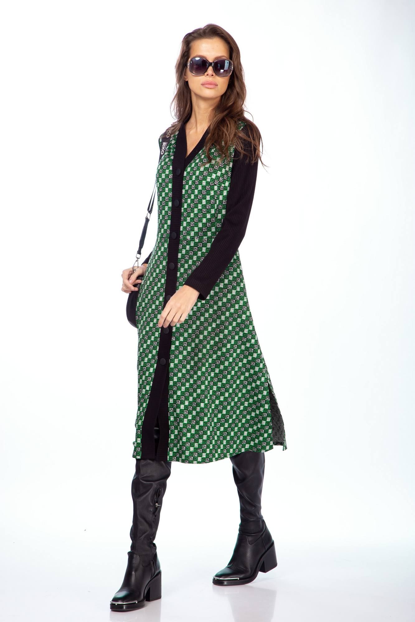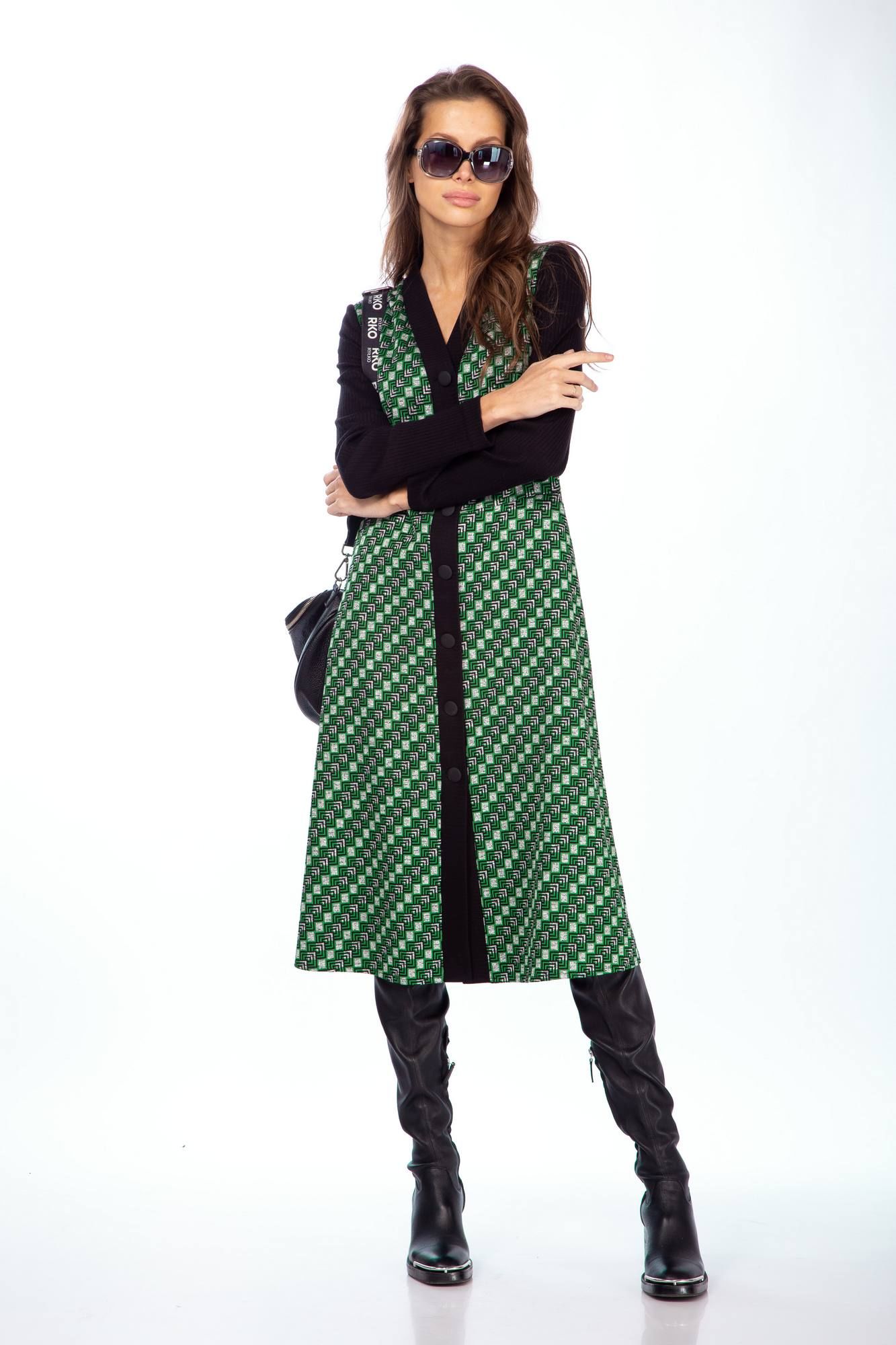 Платье женское полуприлегающего силуэта из трикотажной ткани длины миди. Вырез V образный с центральной бортовой застежкой на петли пуговицы . Рукав втачной длинный . В боковых швах обработаны карманы . Длина платья 108 см , длина рукава 62 см