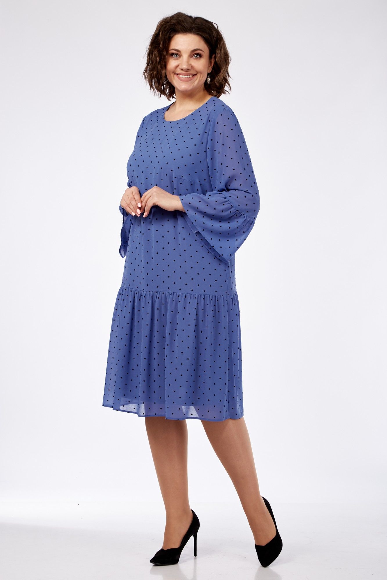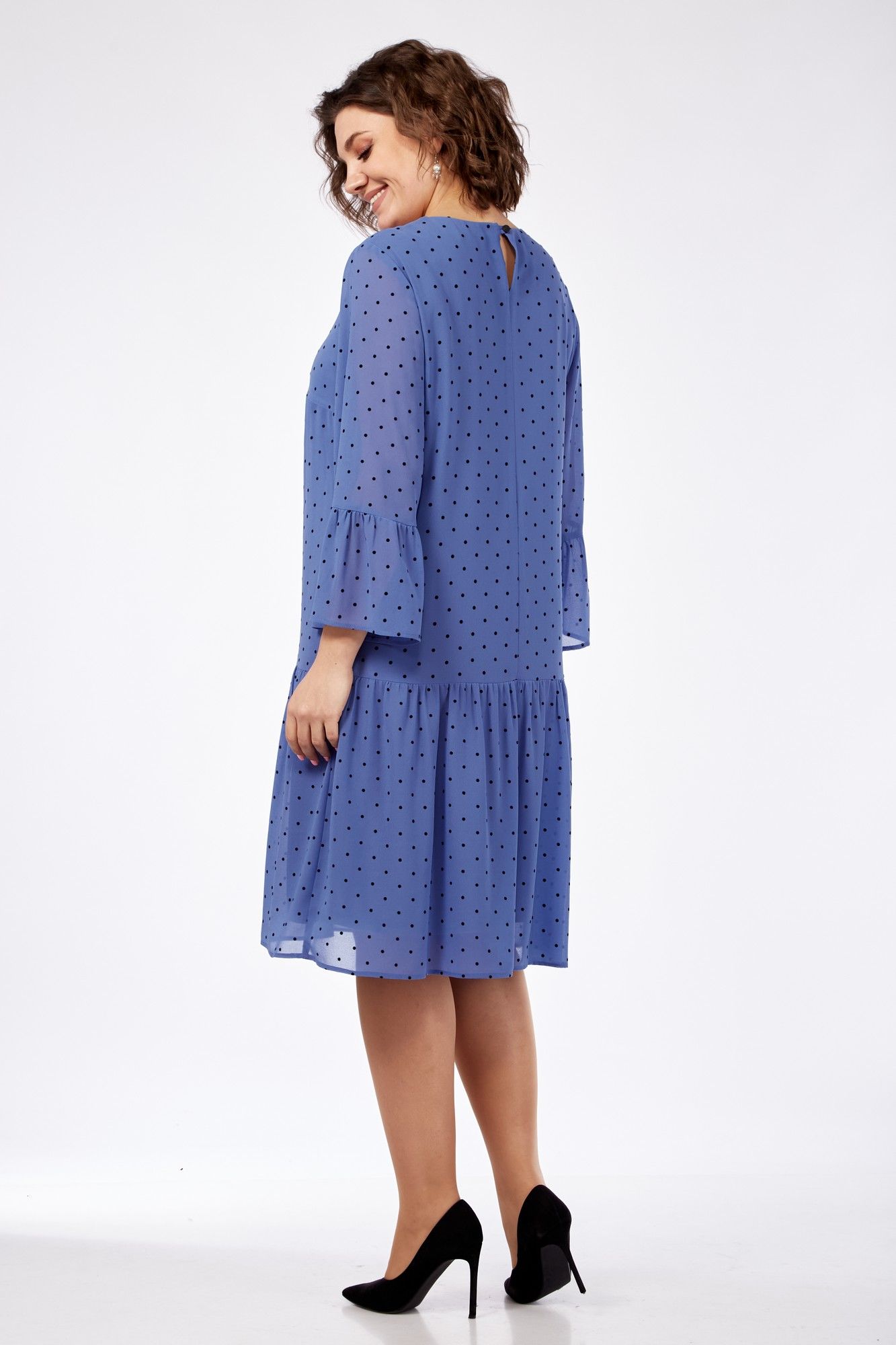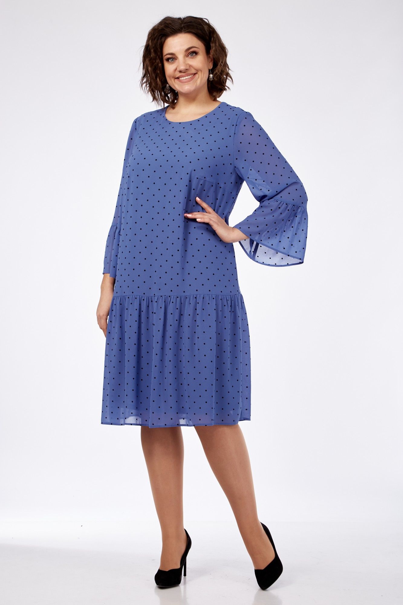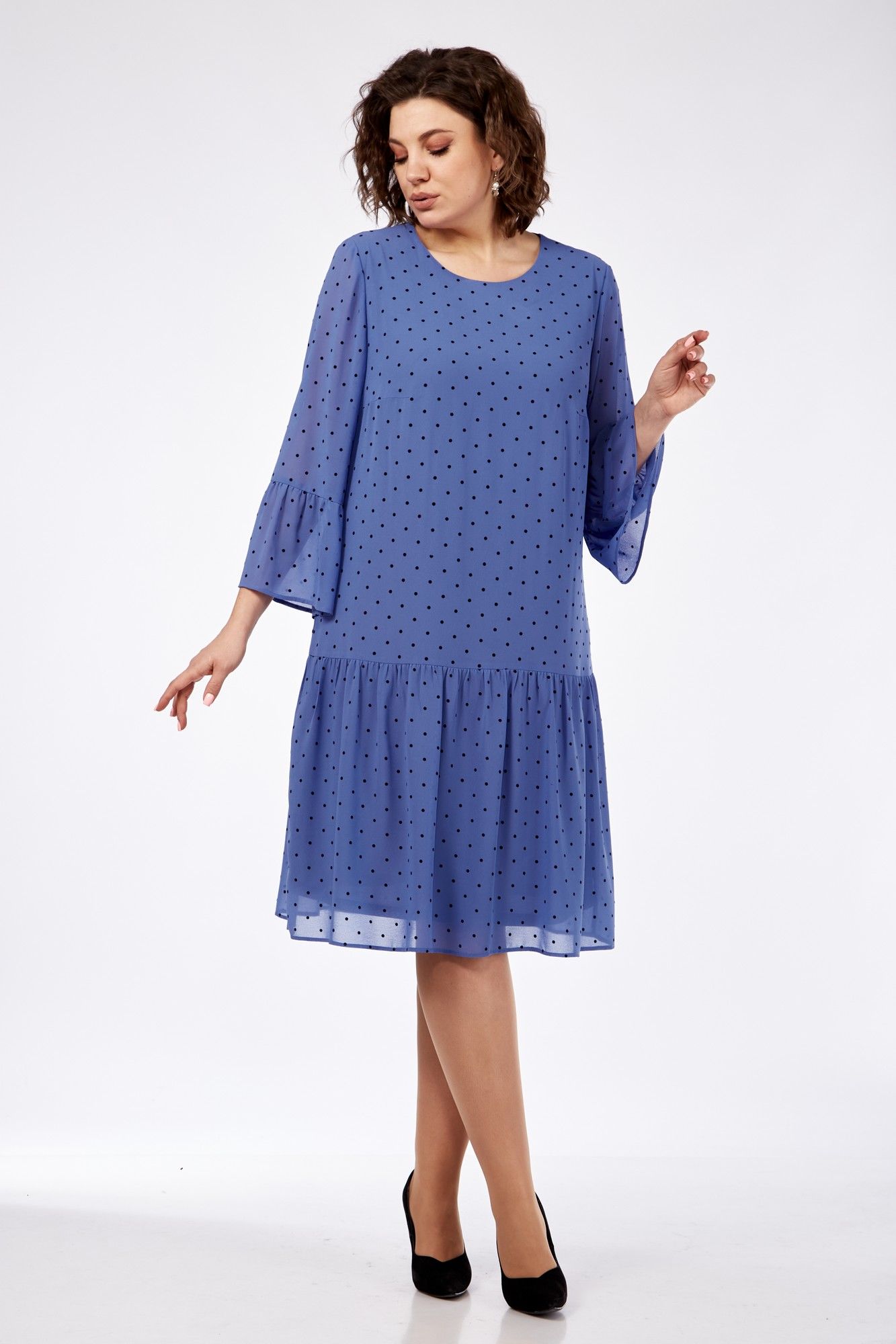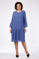 Платье женское полуприлегающего силуэта слегка расширенное к низу. Округлый вырез горловины, рукав втачной 3/4. По низу платья и рукаву притачные воланы. Застежка сзади на пуговицу. Длина платья 103 см, длина рукава 52 см.