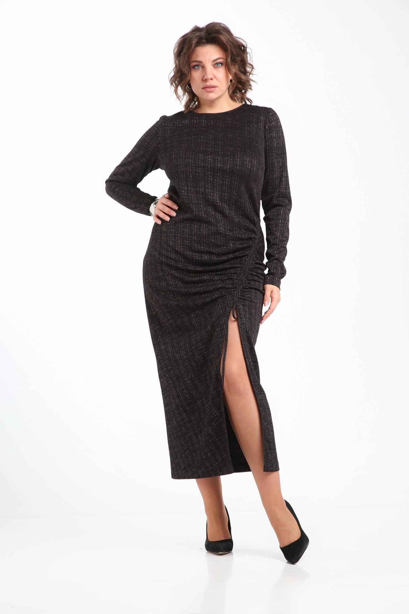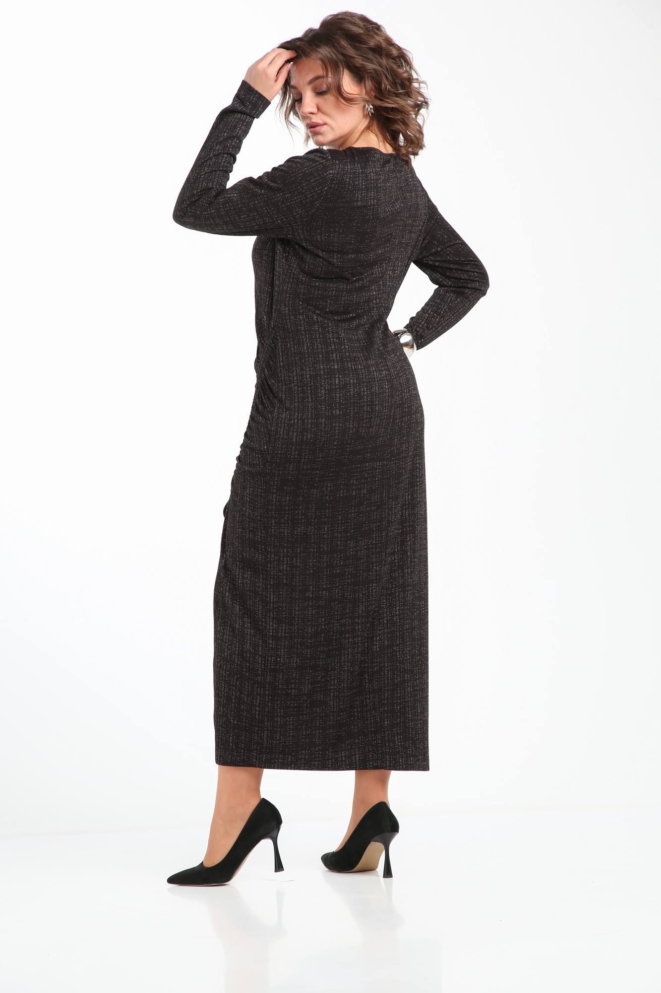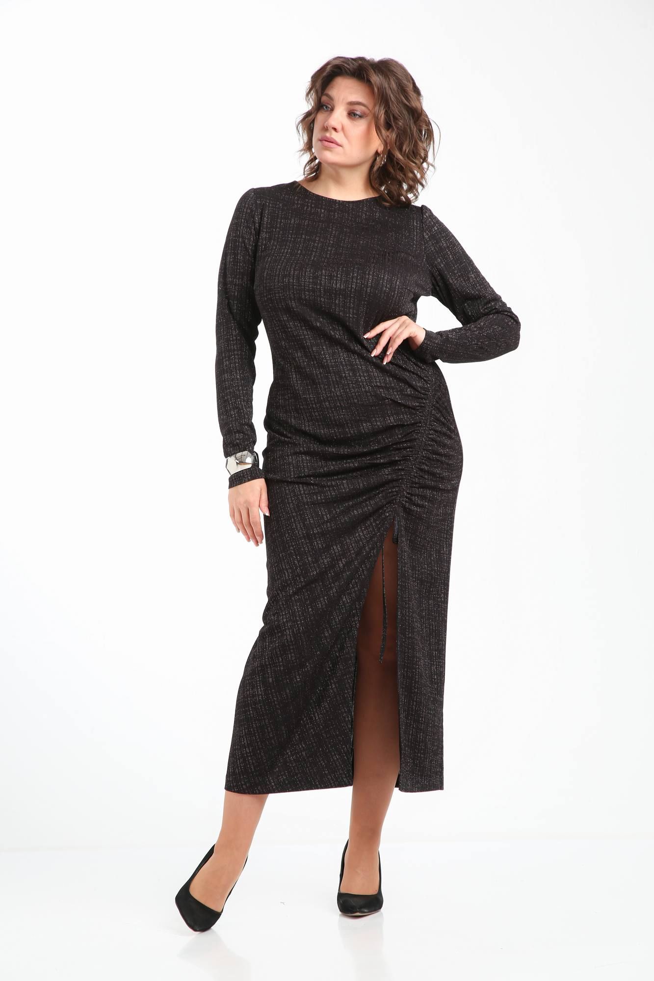 Женское платье выполнено из трикотажа с ненавязчивым блеском. Покрой рукава втачной. Горловина ""лодочкой "". Нагрудные вытачки. По переду в выполненена сборка на кулиску с 2-мя шнурами из основной ткани. С помощью кулиски можно регулировать высоту разреза и величину сборки платья по ширине. Спинка со средним швом без особенностей. Платье без подкладки и без застёжки.