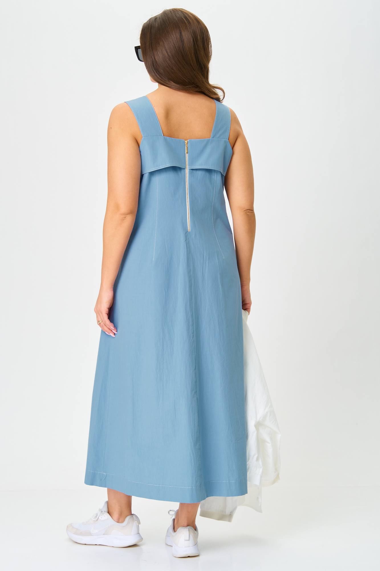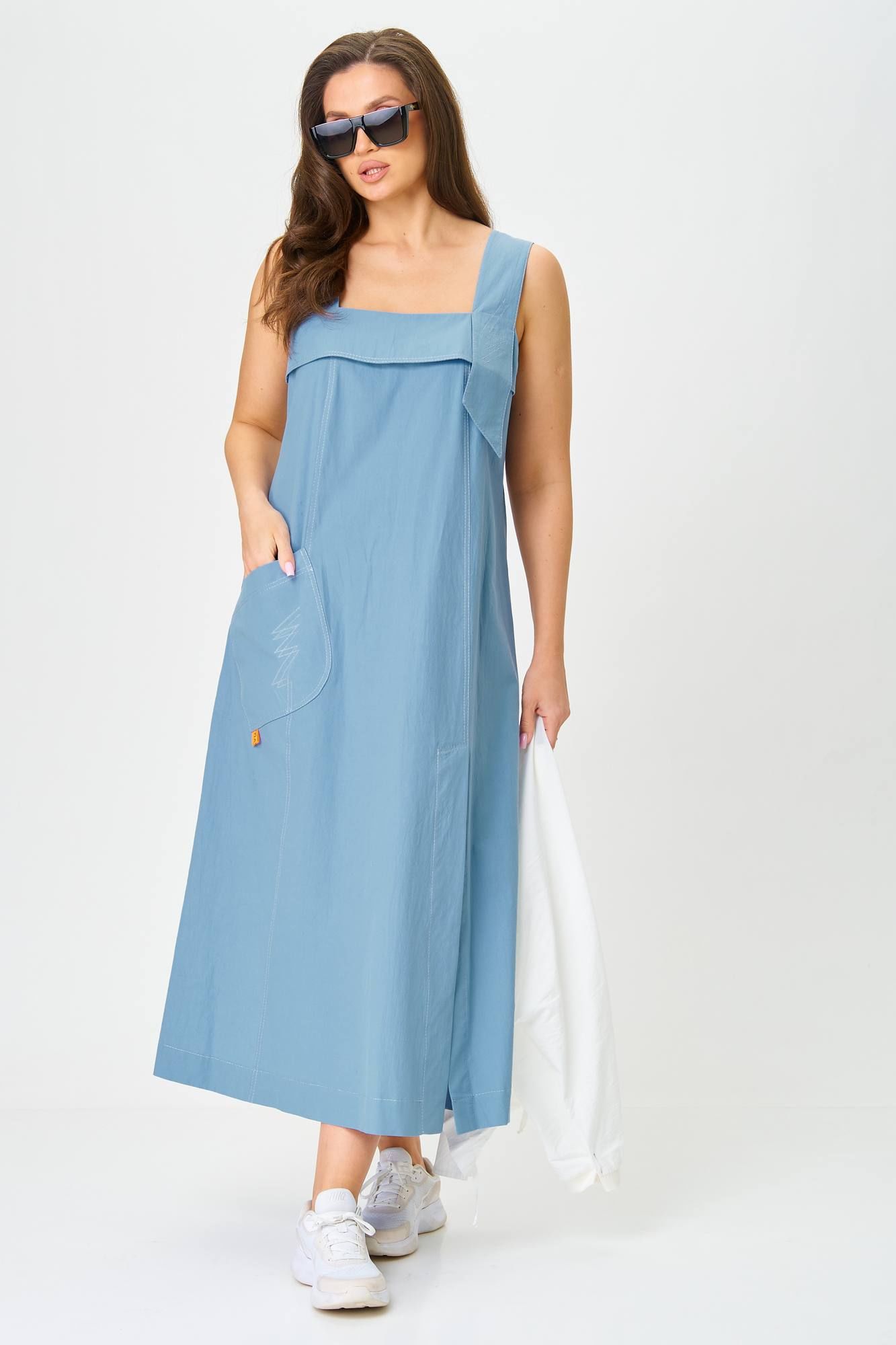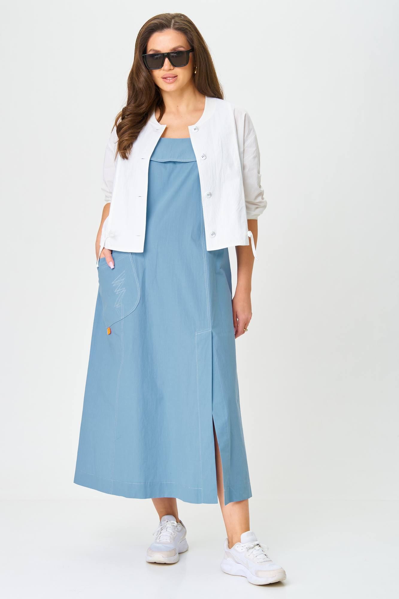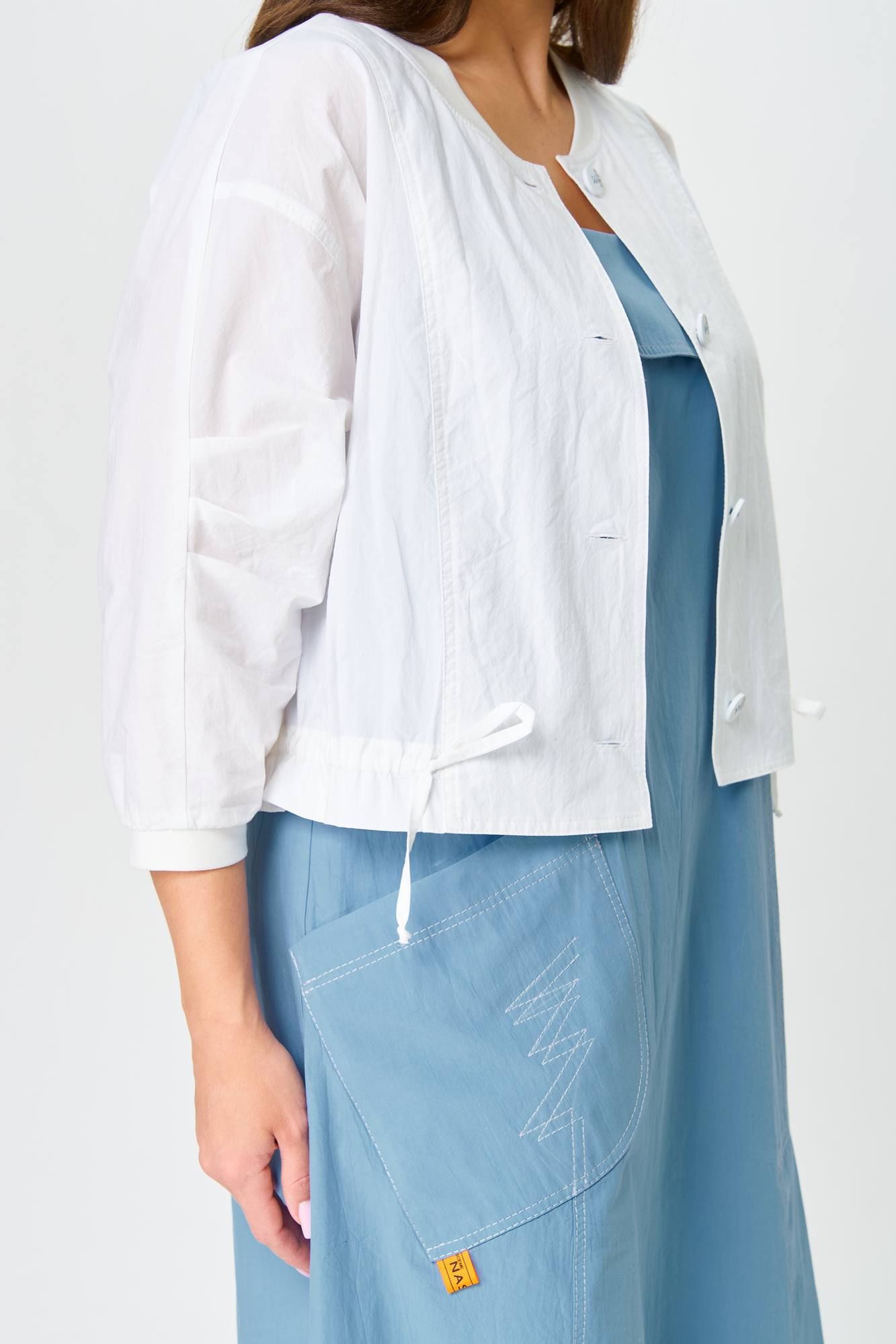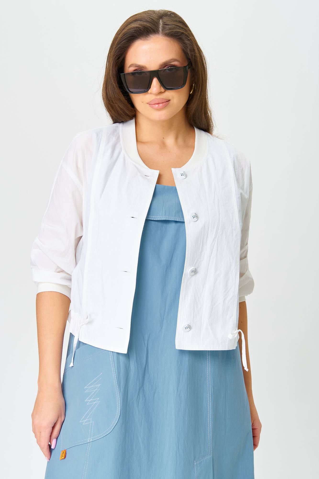 Комплект: бомбер, сарафан. Бомбер выполнен из хлопкового полотна, без подкладки, прямого силуэта, линия плеча спущена. По горловине и по низу рукава трикотажный довяз. На передней половине рукава 2 неглубоких декоративных защипа. Застежка центральная на петли и пуговицы. По низу кулиска. Спинка прямая, цельная, декорирована нашивкой. Сарафан выполнен из хлопкового полотна, без подкладки, трапециевидного силуэта на широких бретелях. С левой стороны бретель более длинная декорирована обстрактной вышивкой. Рельеф, заканчивается высокой шлицей. С правой стороны переда накладной карман, декорирован обстрактной вышивкой и нашивкой. Спинка со средним швом, в шве золотая металлическая молния.