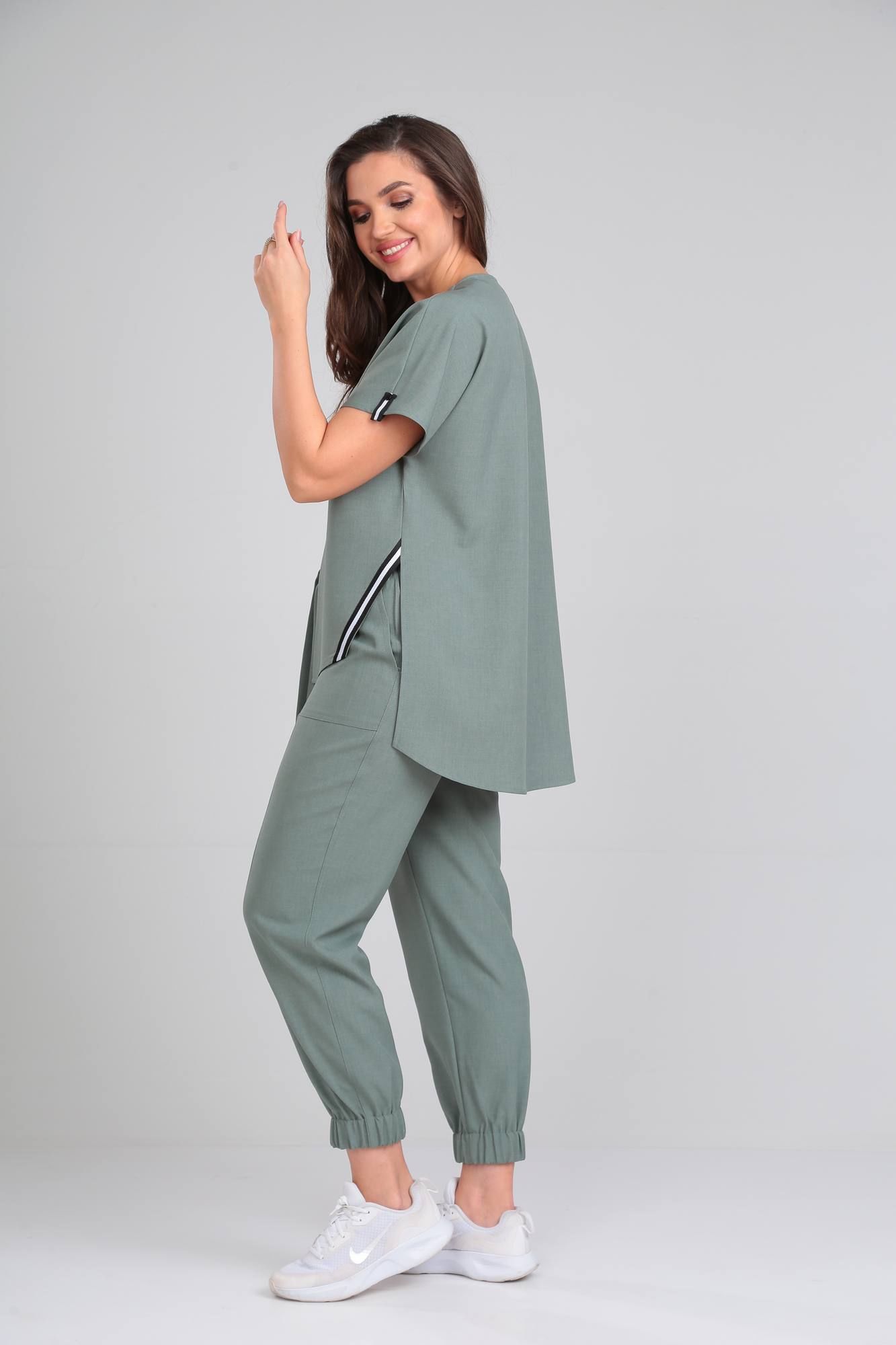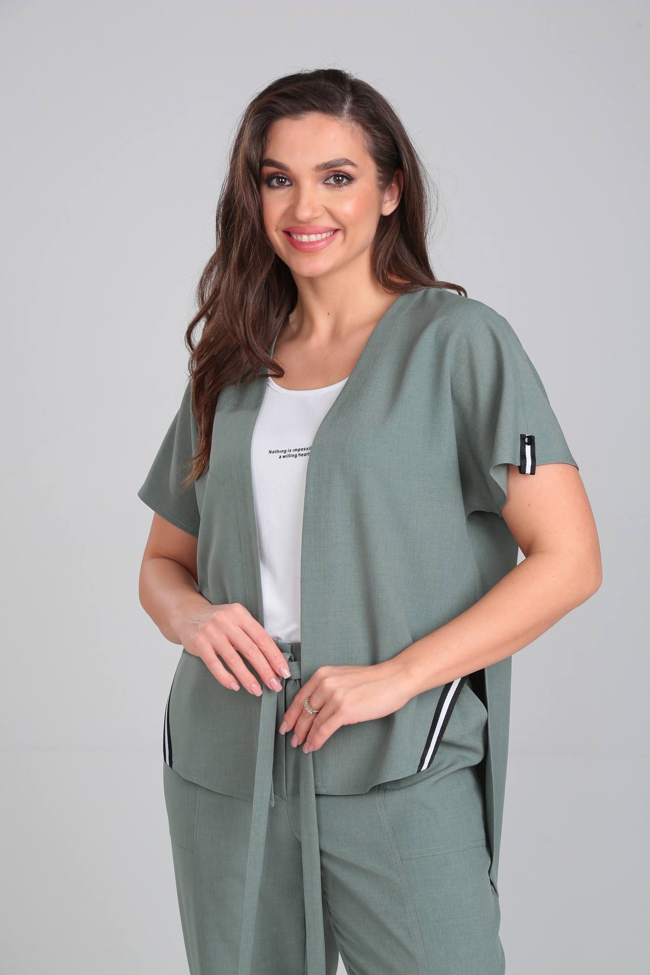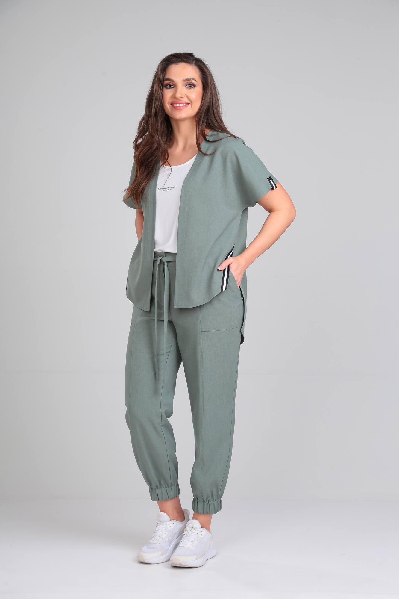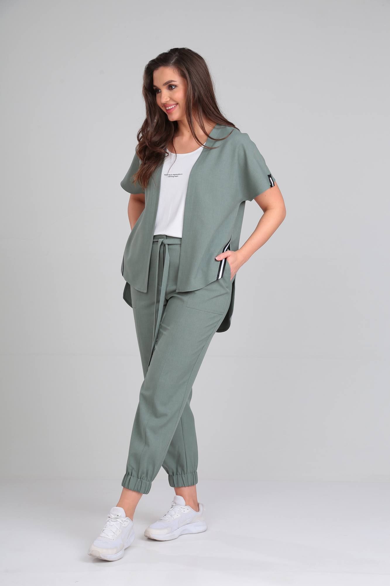 Комплект женский трехпредметный. Состоит из накидки, брюк и топа. Накидка свободного покроя, без застежки. По боковым швам разрезы, декорированы отделочной тесьмой. Линия плеча спущена. Рукав с манжетой и патой по низу. Топ с круглым вырезом горловины без рукавов, по переду декорирован принтом. Брюки свободного покроя с карманами по переду. Верх брюк обработан поясом с эластичной резинкой и втачным декоративным поясом. По низу брюк эластичная резинка