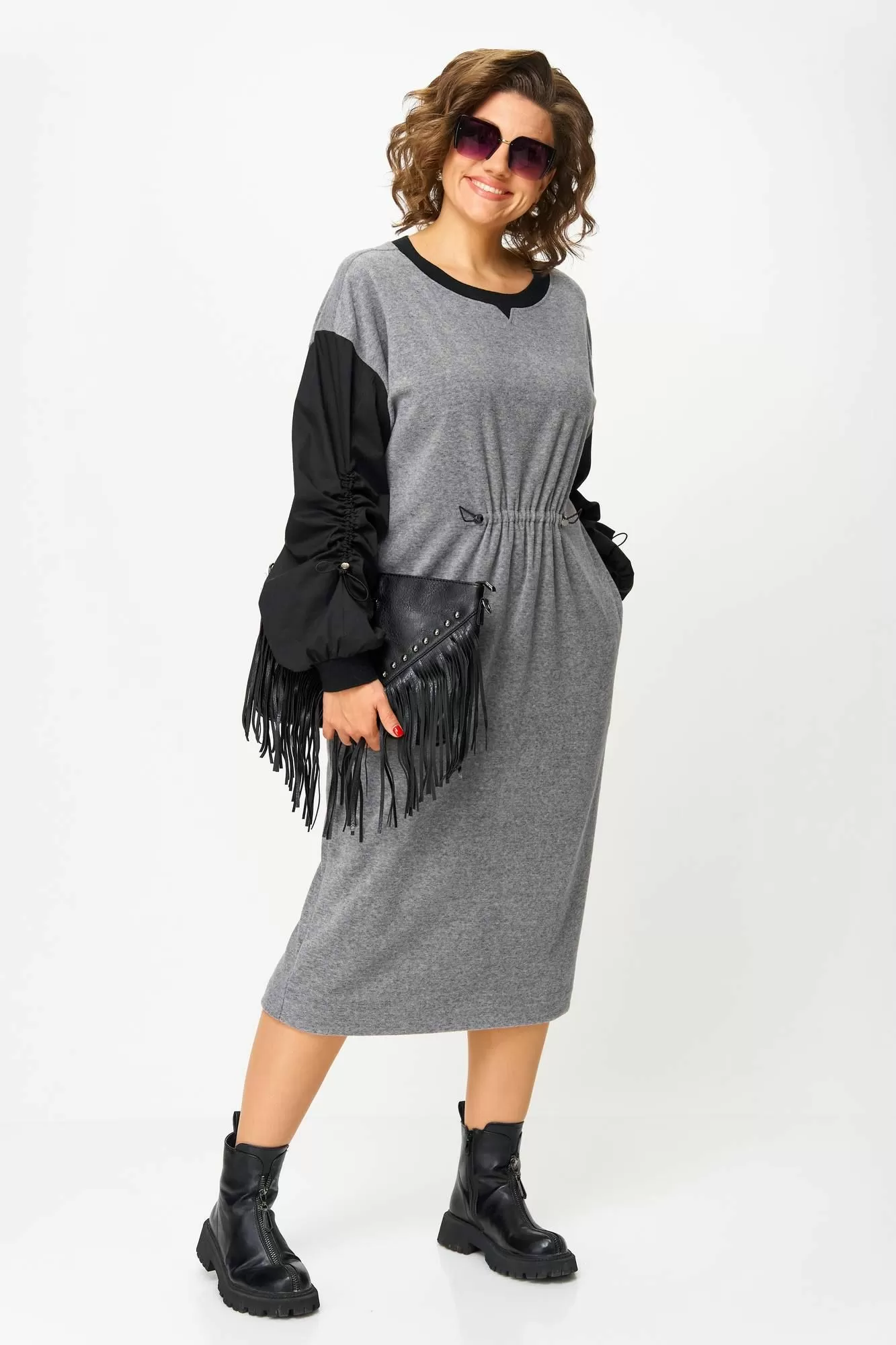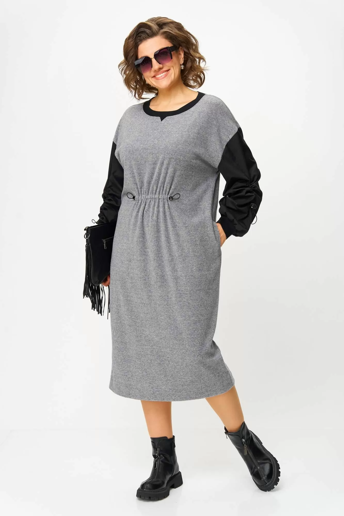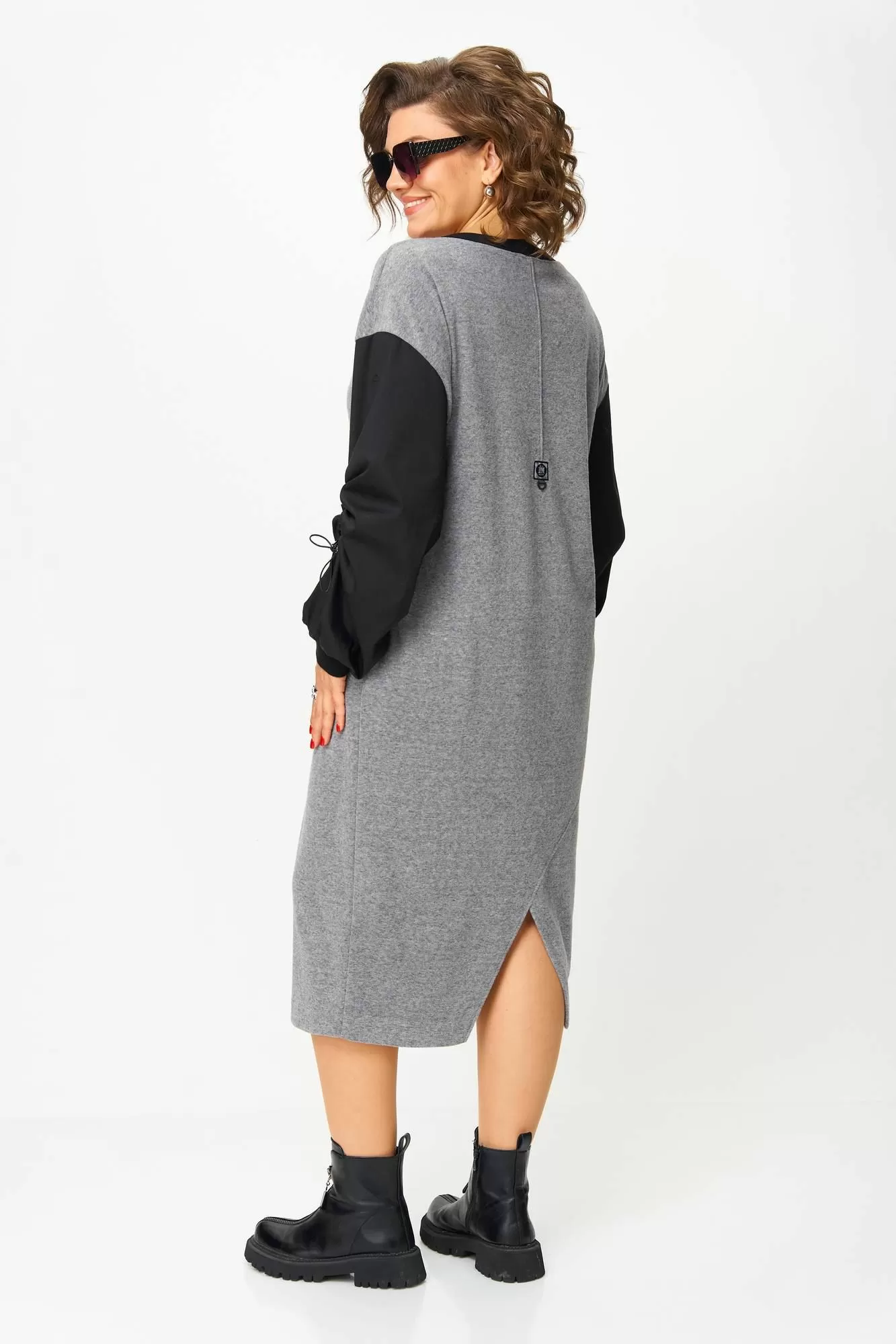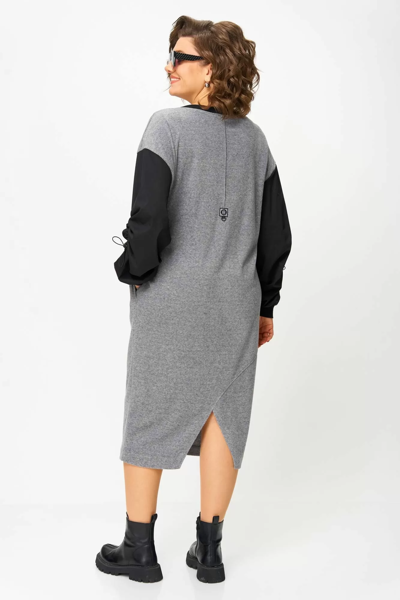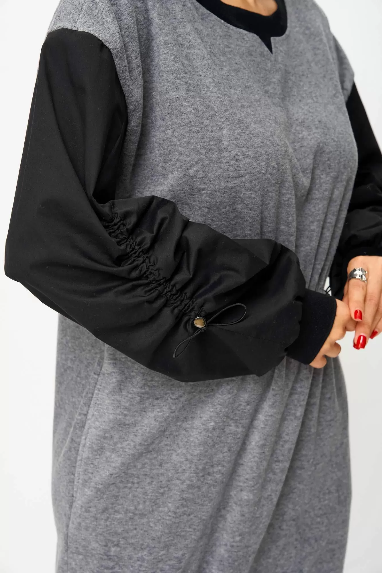 Рукава платья выполнены из рубашечной ткани, широкие. Низ рукава на манжете из довяза. В шве рукава кулиса со стоппером и эластичным шнуром. Платье без застёжки, без подкладки.