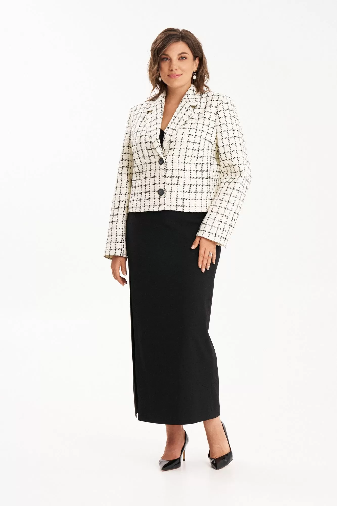 Укороченный жакет прямого силуэта длиной ниже линии талии. Воротник и лацкан классические. Застежка на две пуговицы. На рукавах шлицы с пуговицой. _x000D_