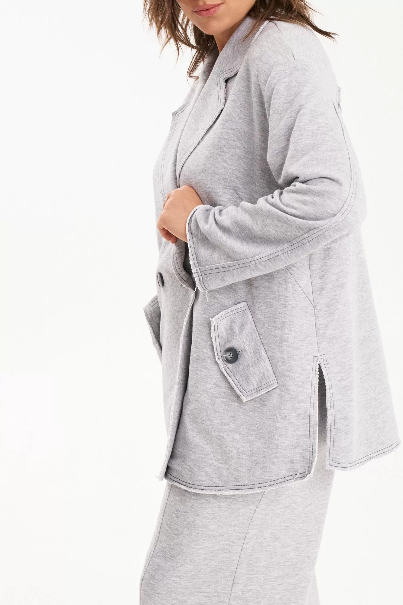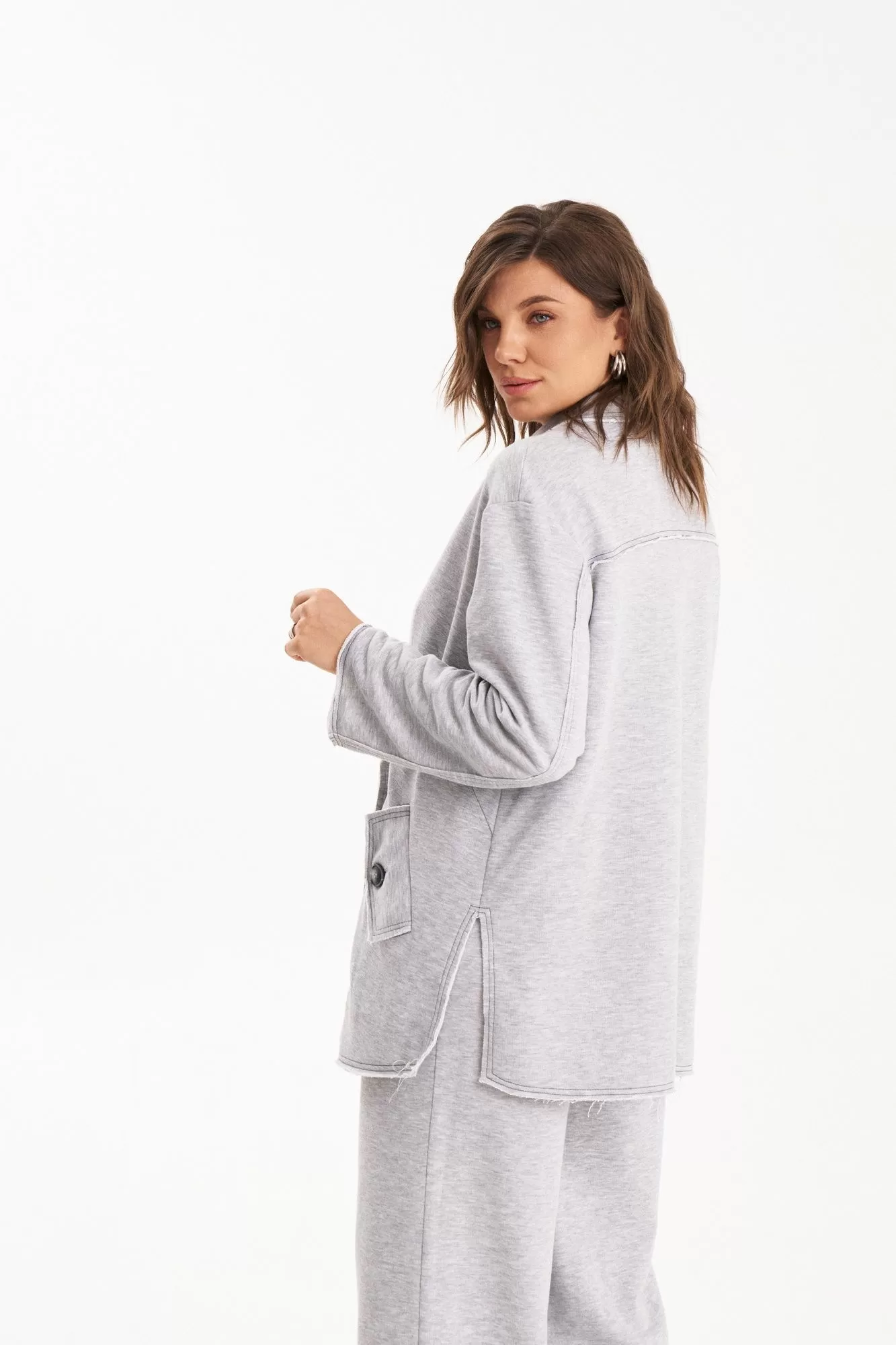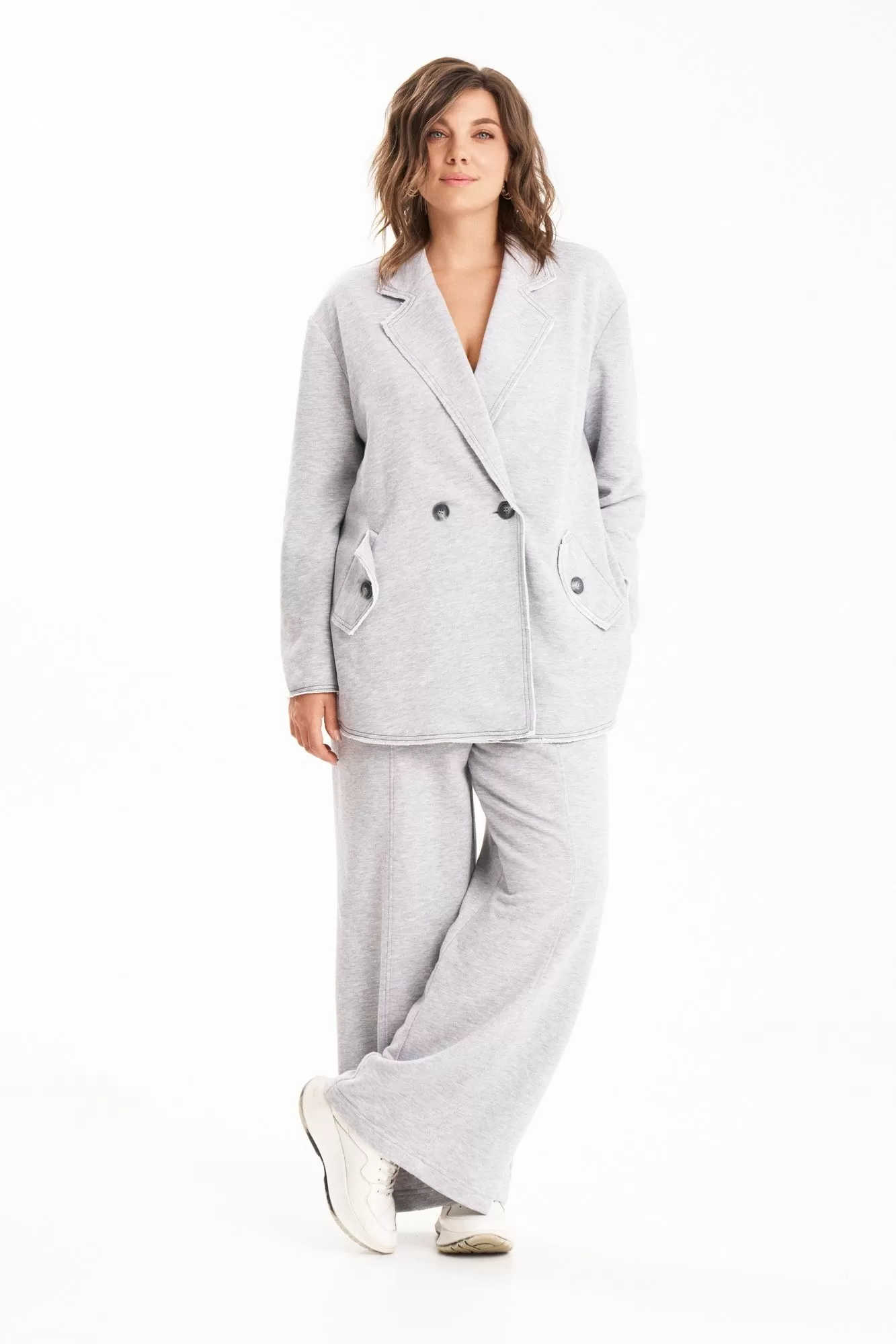Костюм состоящий из жакета и брюк. Жакет прямого силуэта со спущенной линией плеча и двубортной застёжкой. Все края жакета с сырыми срезами, которые отстрочены контрастной ниткой. Спереди два кармана с клапанами. Брюки прямые от бедра на резинке по талии с карманами по бокам._x000D_