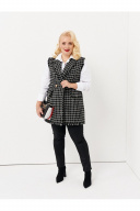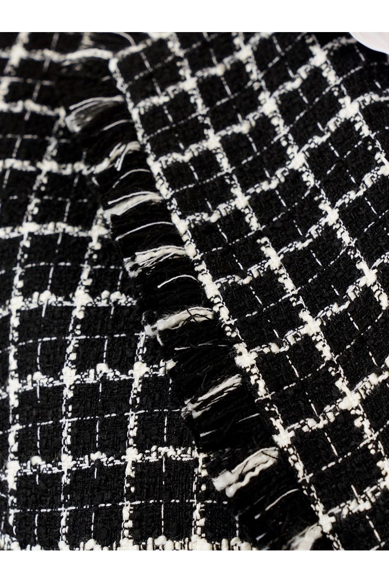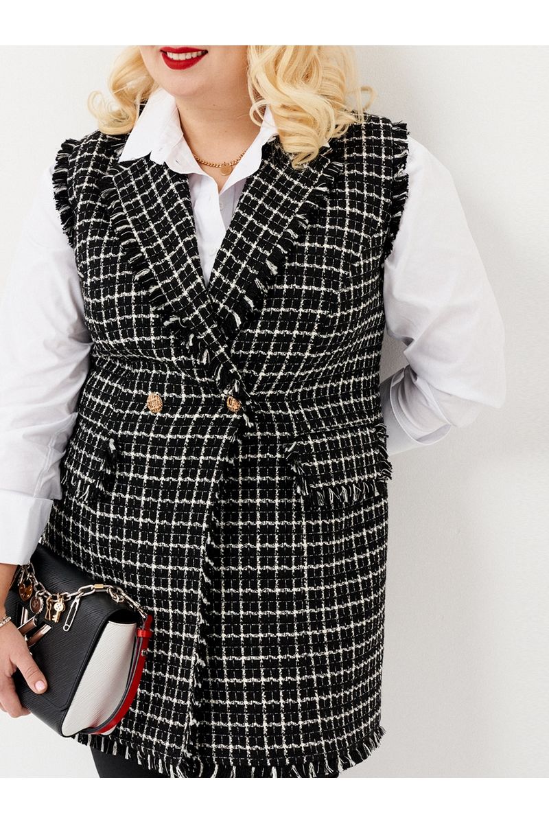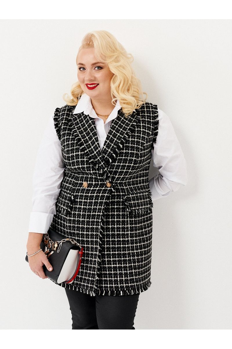 Стильная жилетка полуприлегающего силуэта бренда Ketty из твидовой ткани в клетку. Жилетка удлиненная с английским воротником. Перед дополнен двумя прорезными карманами с клапанами. Клапаны дополнены бахромой из основной ткани. По низу жилетки, воротнику и по проймам имеется отделка бахрома из основной ткани. Изделие на подкладке. Такая жилетка отлично сочетается с различными джемперами или рубашками, создавая стильный образ. Модель построена на сочетании черного и белого цветов в расслабленном стиле создает современный образ в сочетании с джинсами, футболками, костюмными палаццо и юбками. Для этого жилета характерна женственность, утонченность и комфорт - модель идеально дополнит повседневные и праздничные образы.