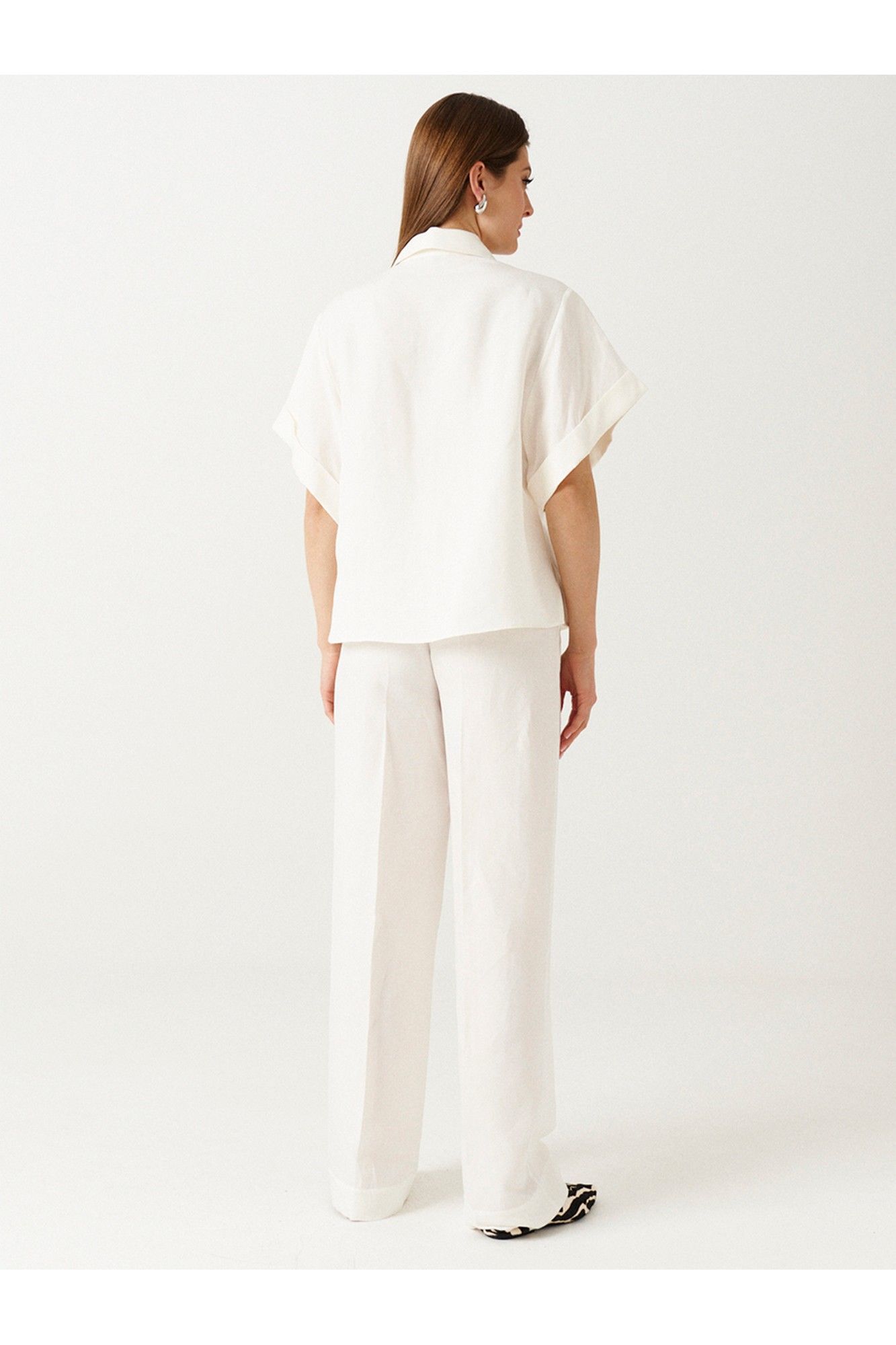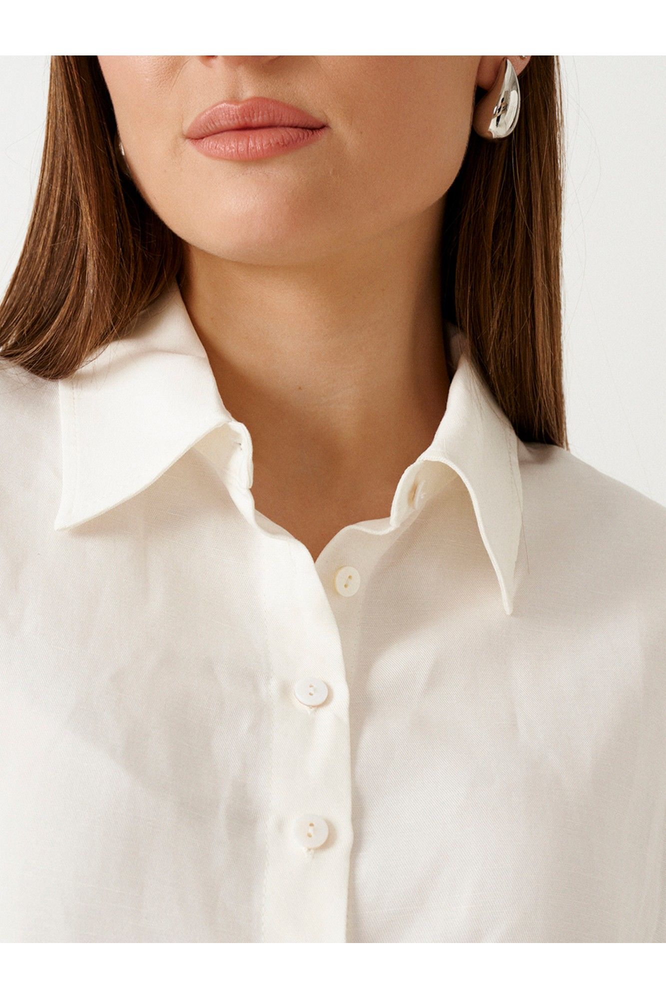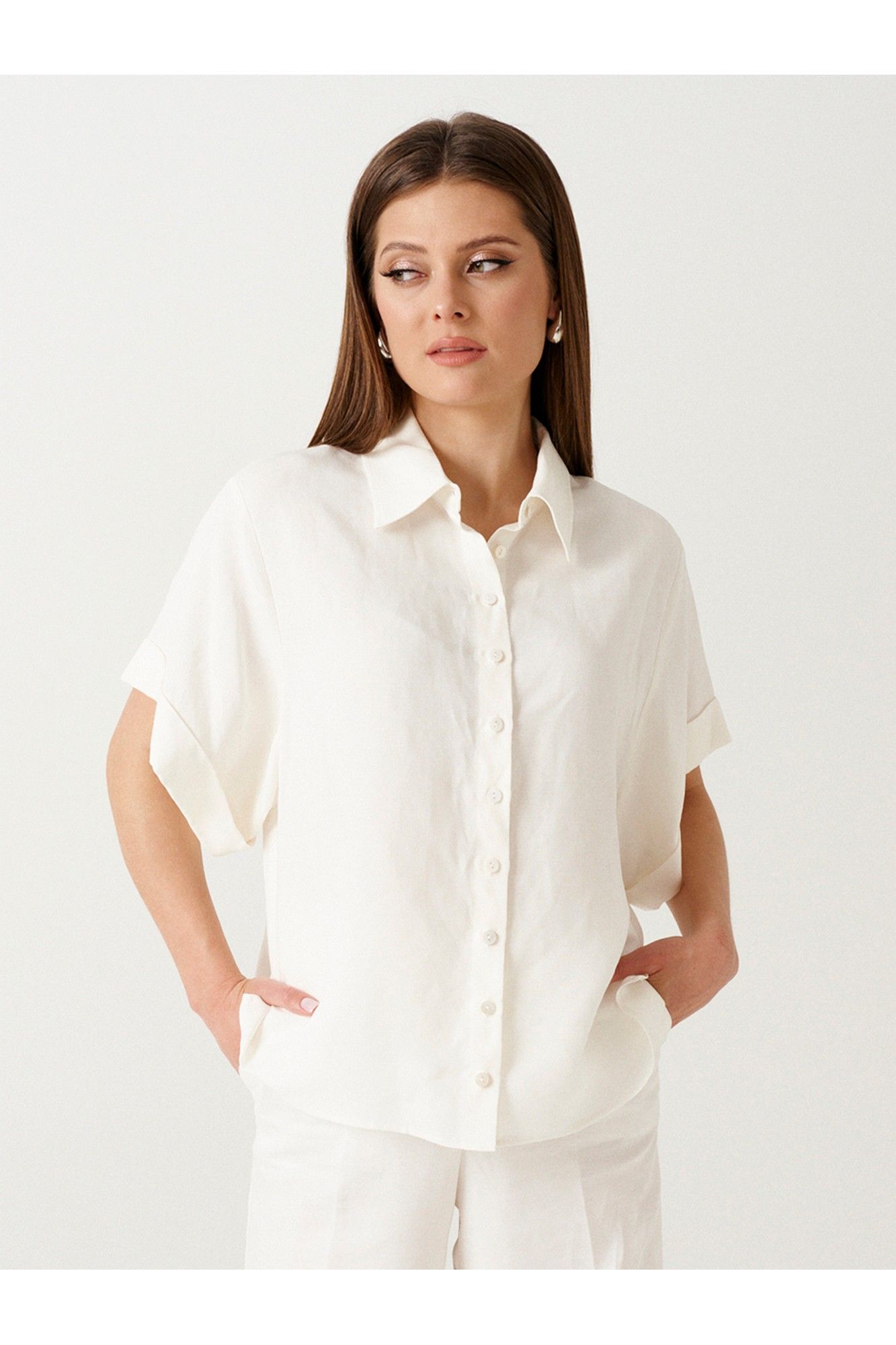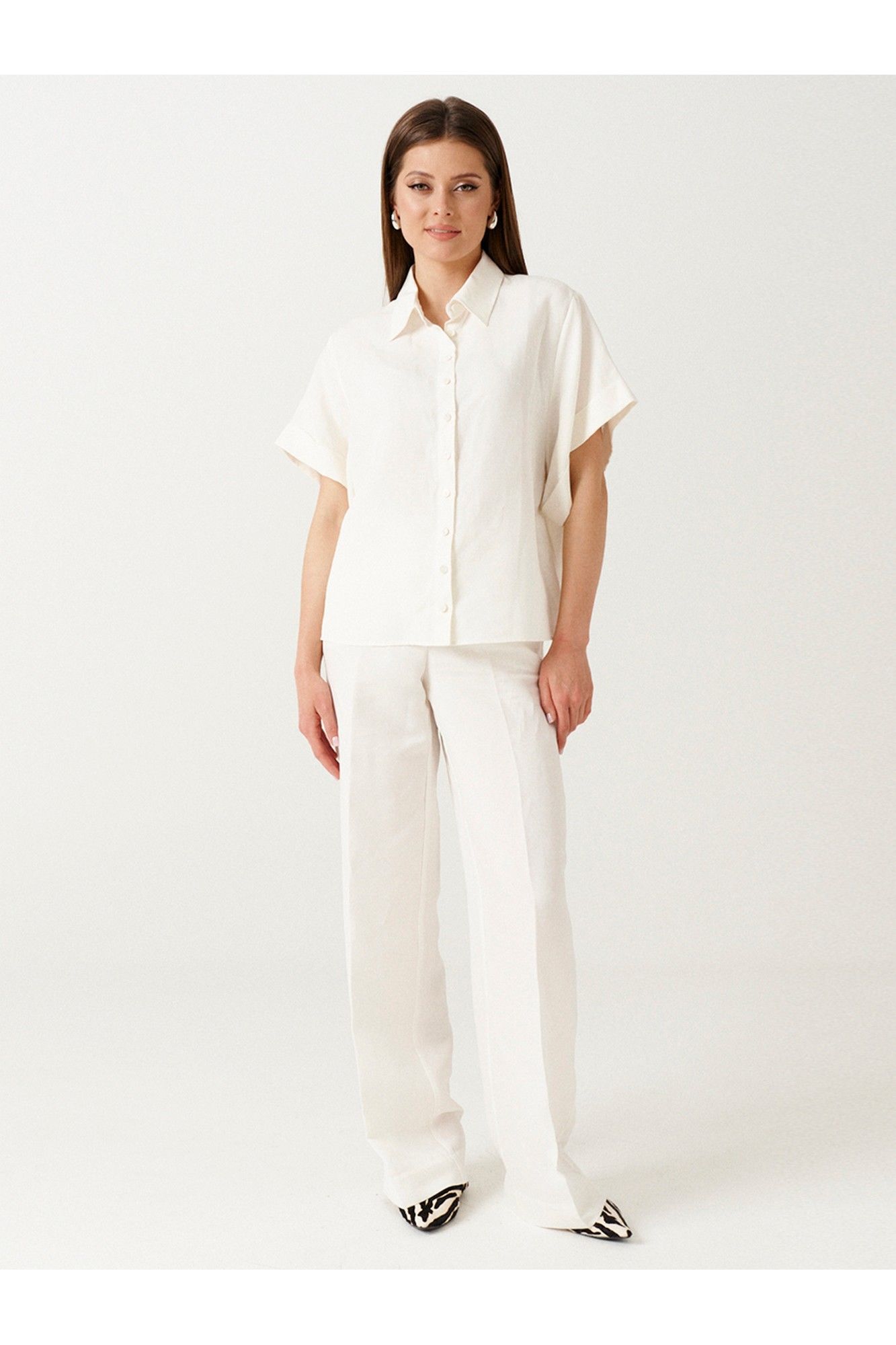 Блузка женская из смесовой ткани с добавлением льна для повседневной носки. Блузка прямого силуэта. Застежка в блузке центральная бортовая на обметанные петли и пуговицы. Горловина обработана рубашечным воротником с отрезной стойкой. Линия плеча чуть спущена. Рукава втачные длинной чуть выше локтя, низ рукава обработан отлётной манжетой. Легкая и очень стильная блузка, которая будет давать настроение на каждый день. Данная блузка станет не заменимой вещью в вашем гардеробе, она обязательно покорит вас своей чудесной посадкой.