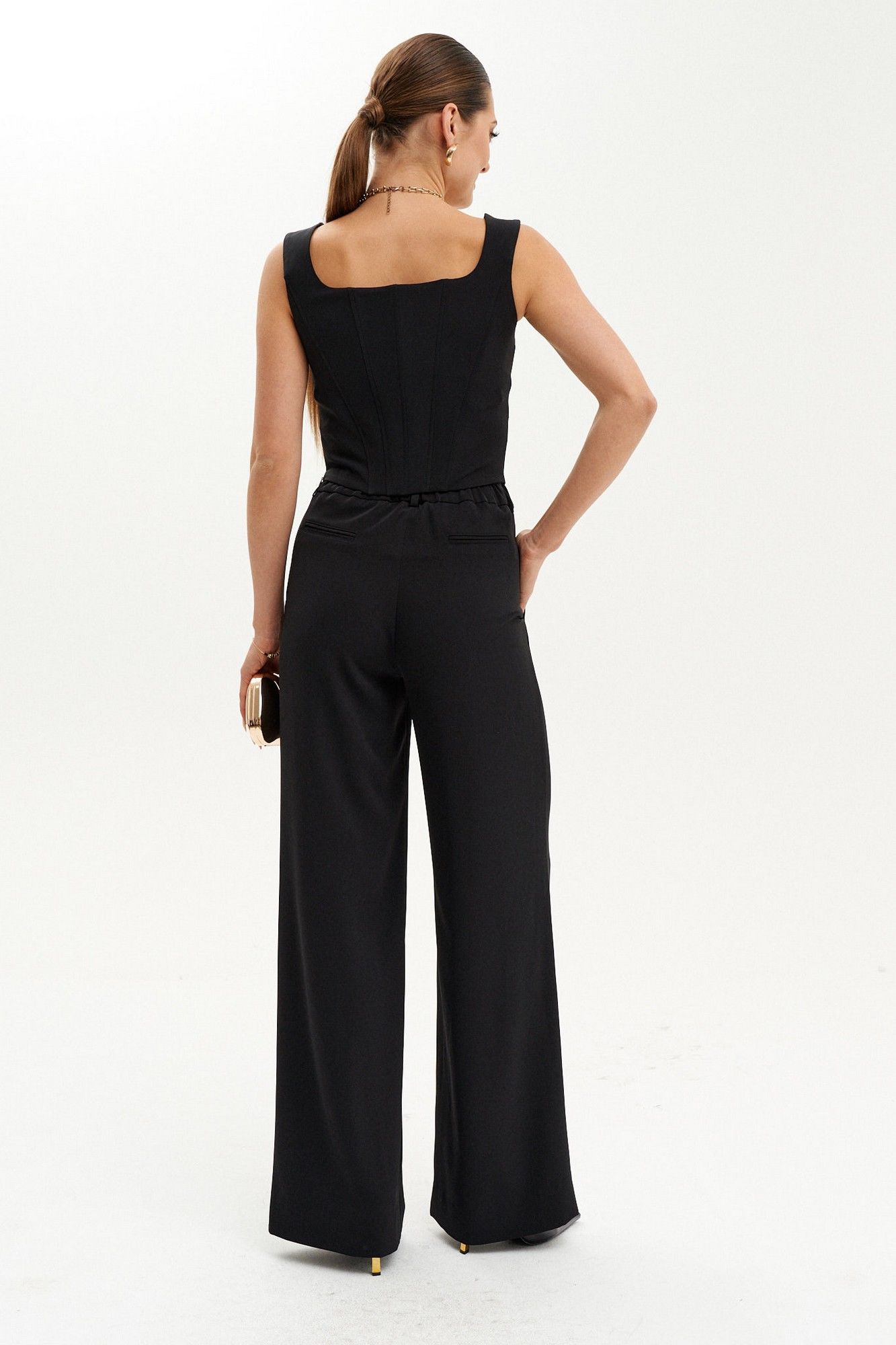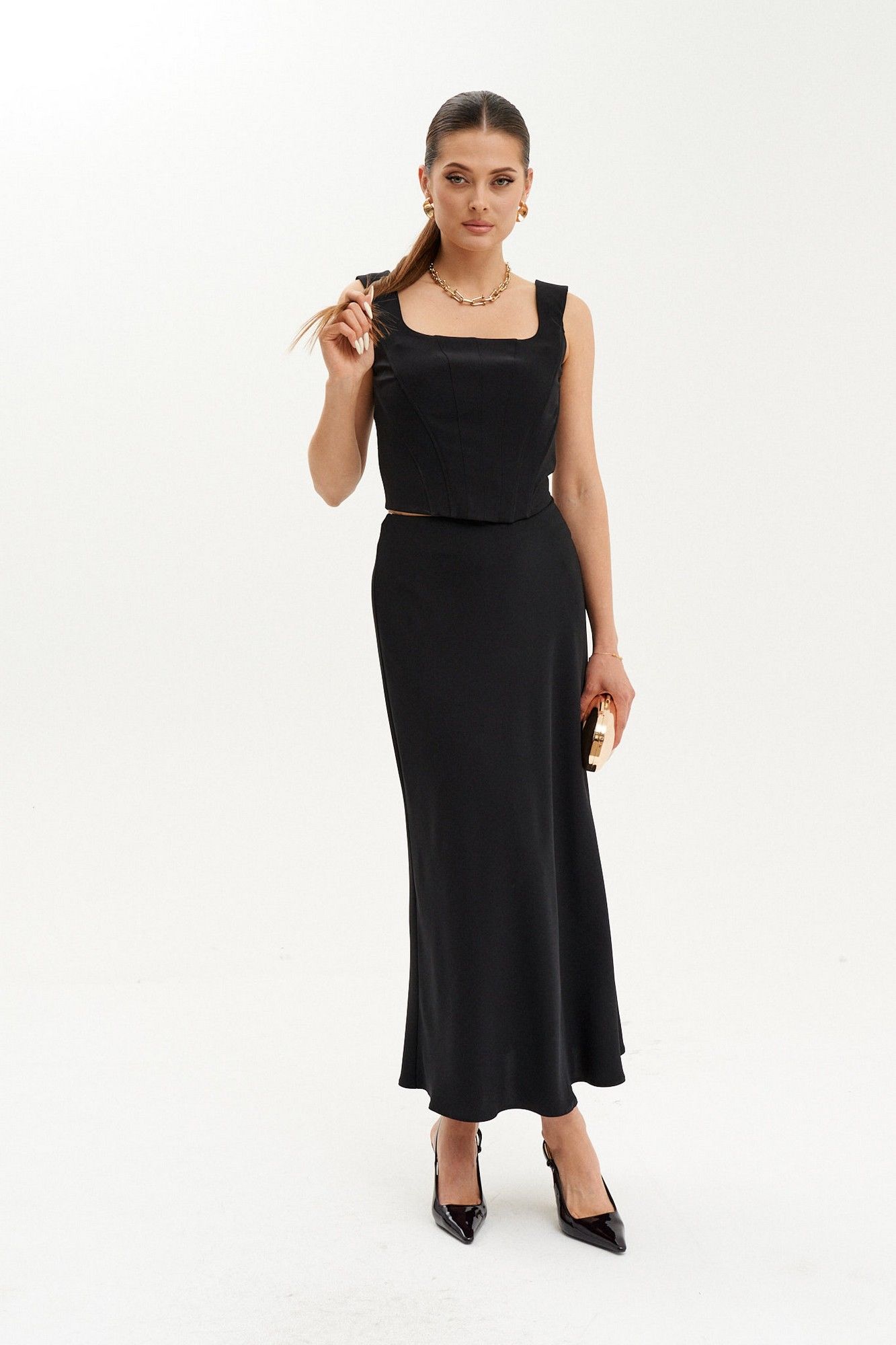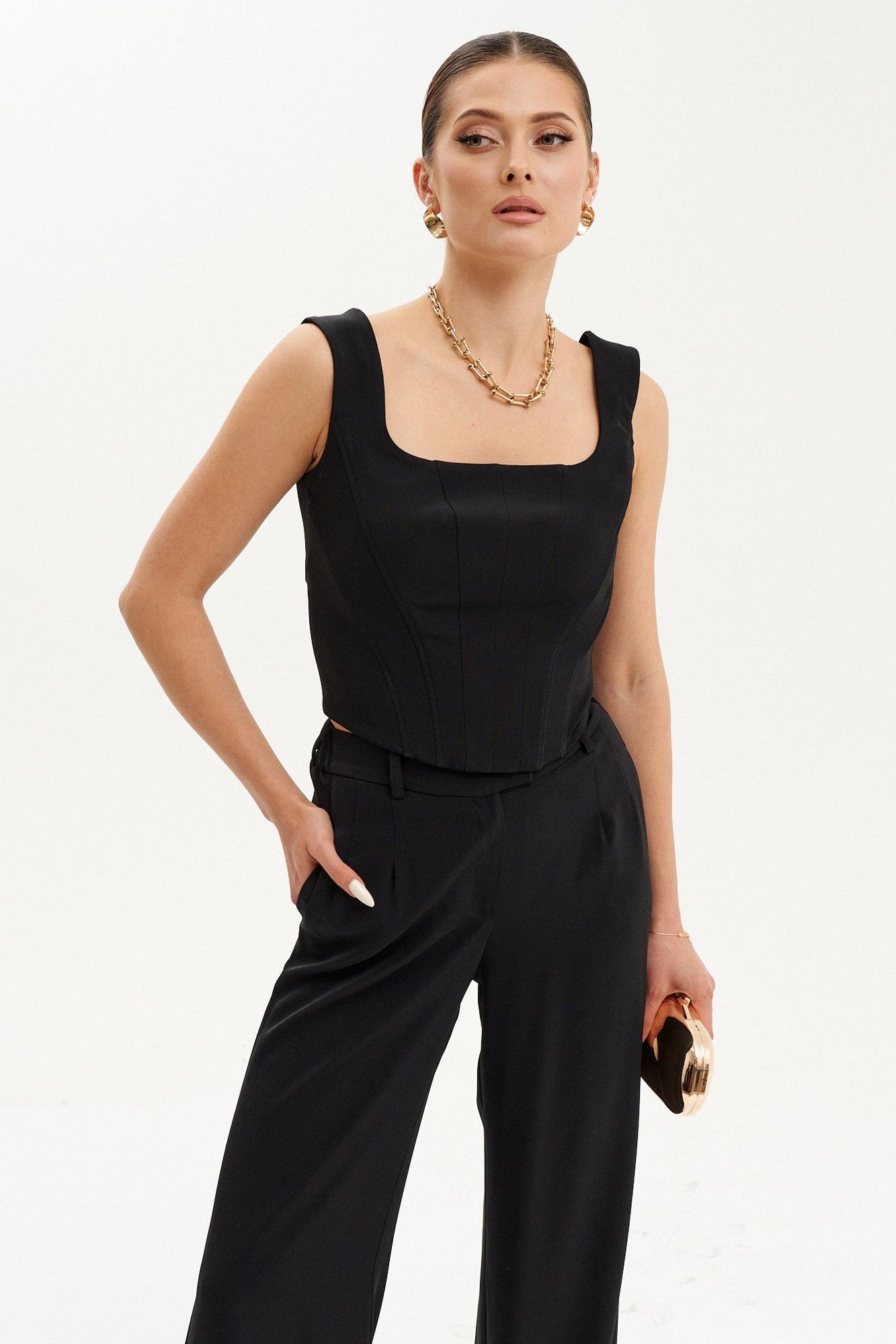 Элегантный женский корсет из костюмной ткани — идеальный выбор как для повседневных образов, так и для торжественных выходов. Приталенный силуэт корсета подчёркивает фигуру, а укрепляющий регилин "китовый ус" помогает сохранять идеальную форму. Спереди и на спинке расположены вертикальные рельефы с вставками для дополнительного комфорта и поддержки. V-образная горловина добавляет изящности, а удобные бретели и потайная застёжка-молния обеспечивают удобную посадку. Этот стильный и утончённый корсет станет прекрасным акцентом, подходящим для создания модных и женственных образов на каждый день и для особых случаев.