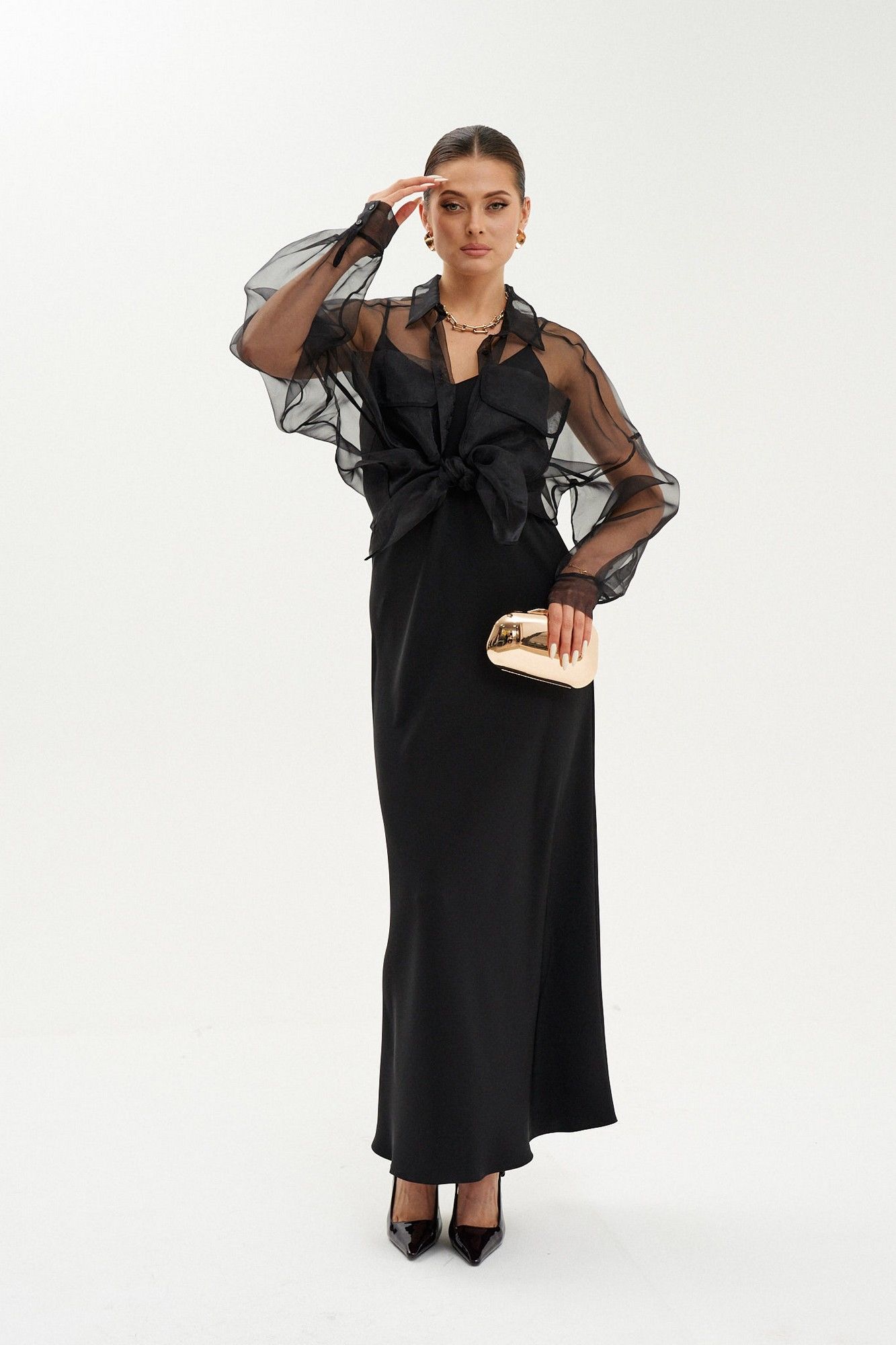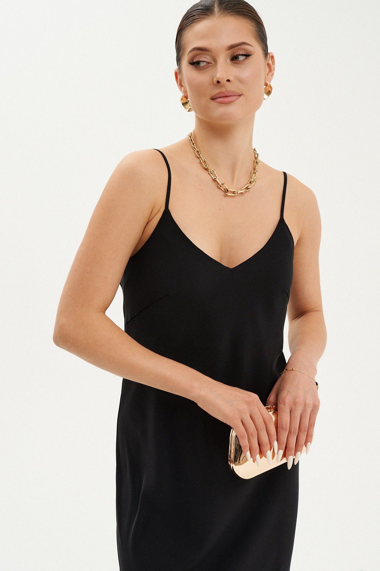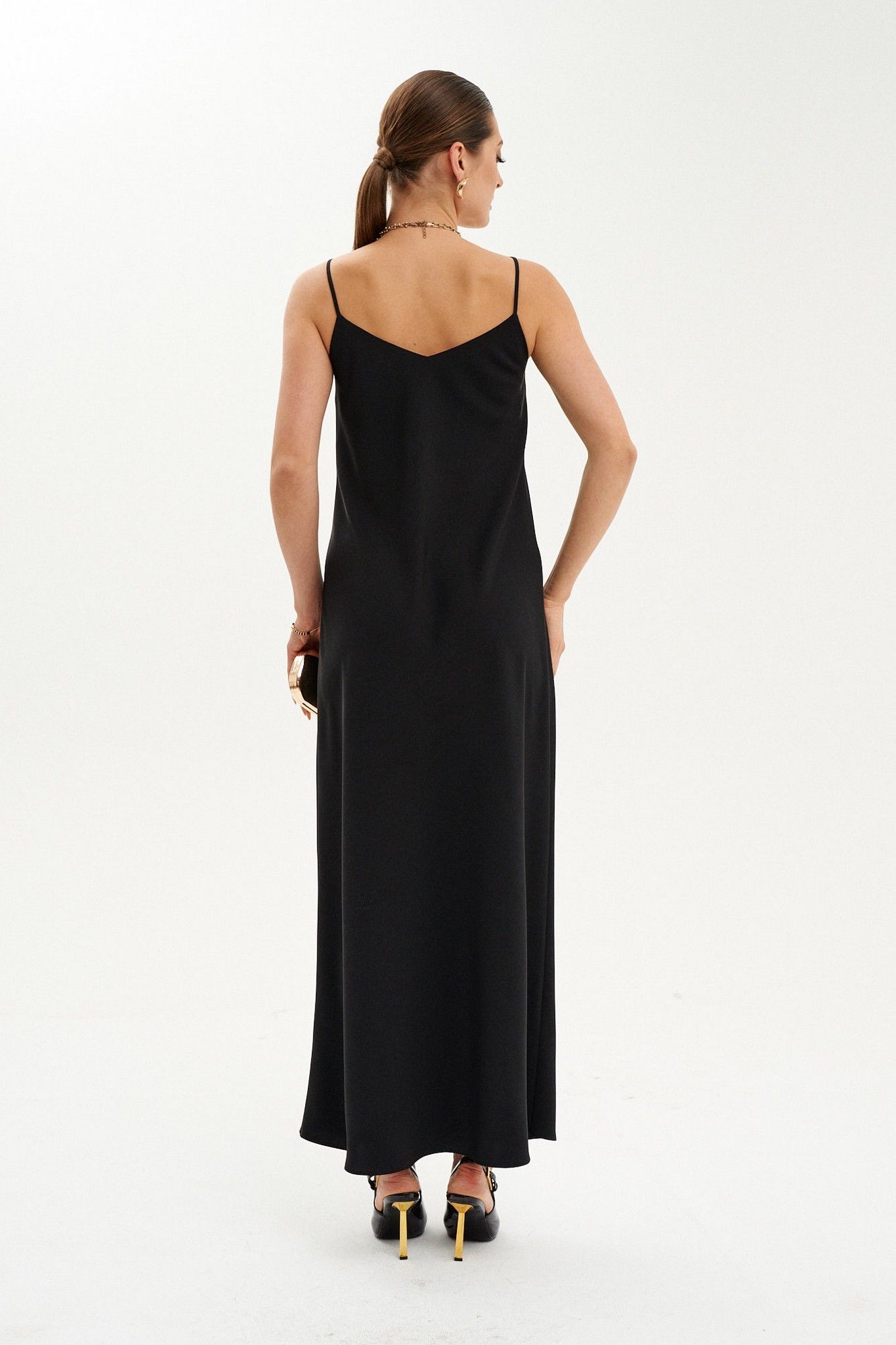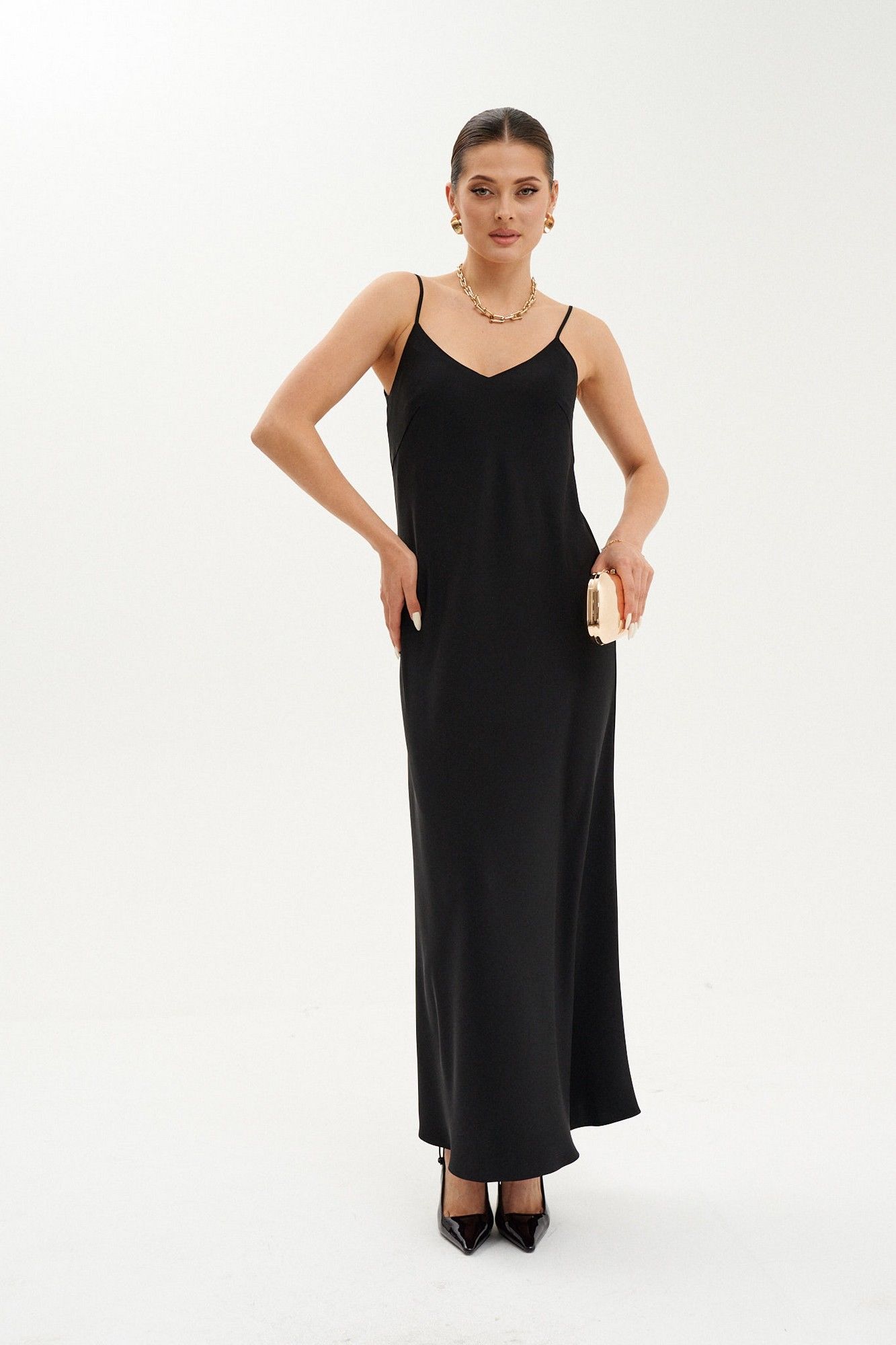 Элегантное платье макси из струящейся ткани станет прекрасным выбором как для повседневной носки, так и для особых случаев. Свободный крой, слегка расширяющийся к низу, создаёт нежный и женственный силуэт, подчеркивая фигуру. V-образный вырез на спинке и передней части придает изысканности, делая образ легким и привлекательным. Платье на бретелях открывает плечи, добавляя нотку романтичности. Оно идеально сочетается с аксессуарами и верхней одеждой, что делает его универсальным элементом гардероба для создания как повседневных, так и праздничных образов.