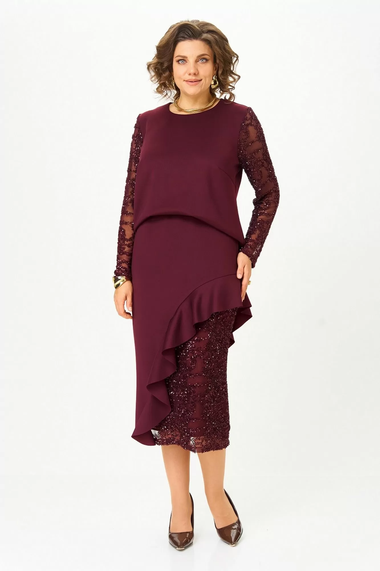 Нарядный женский комплект. Состоящий из блузона и юбки. Комплект выполнен из трикотажного полотна с добавлением хлопка. Блузон укороченный, свободного облегания, вырез горловины круглый, с застежкой на навесную петлю с пуговицей по спинке, рукав из трикотажной сетки с паетками. Юбка удлиненная, прямая, на подкладке, сбоку по низу переда и спинки фигурная вставка из трикотажной сетки с паетками и воланом.