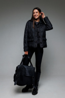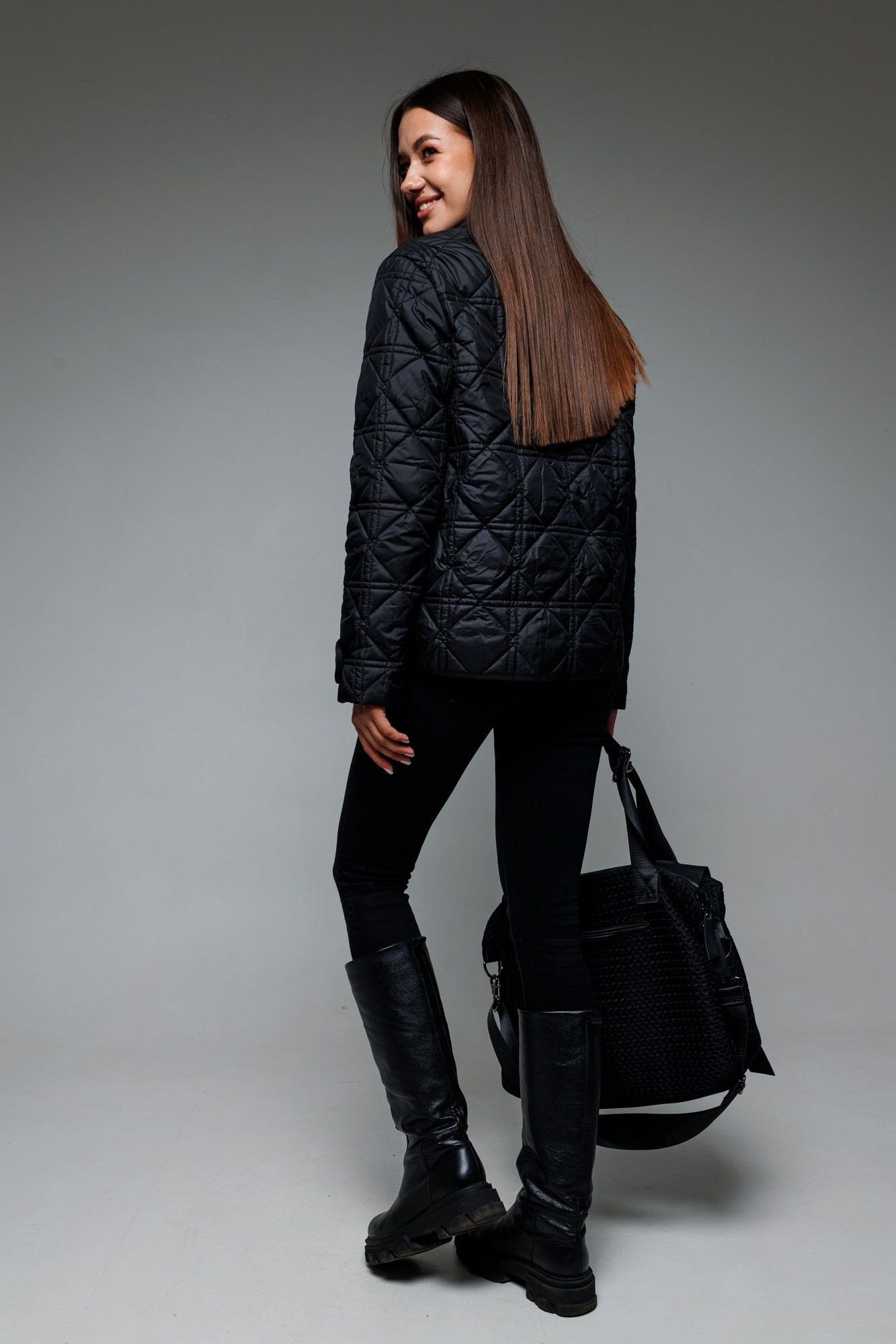 Женская куртка из стеганной плащевой ткани на утеплителе (подходит на температуру до 0 градусов). Куртка на подкладке. Рукава втачные, по низу рукава пата-манжет. Застежка центральная на притачных планках, на петли и пуговицы. Воротник рубашечный. По полочкам накладные карманы с клапаном. Край планки, низ рукавов, пата, воротник, карманы и клапаны окантованы тесьмой.