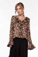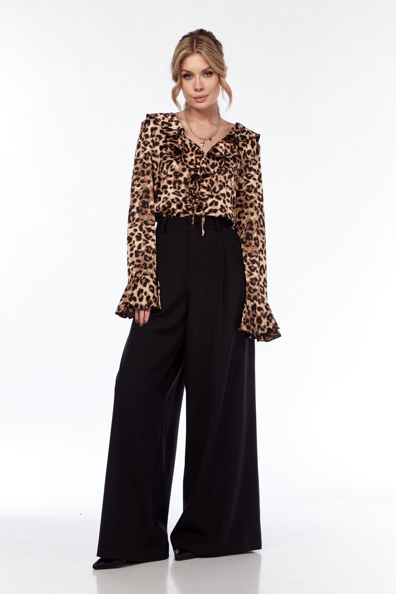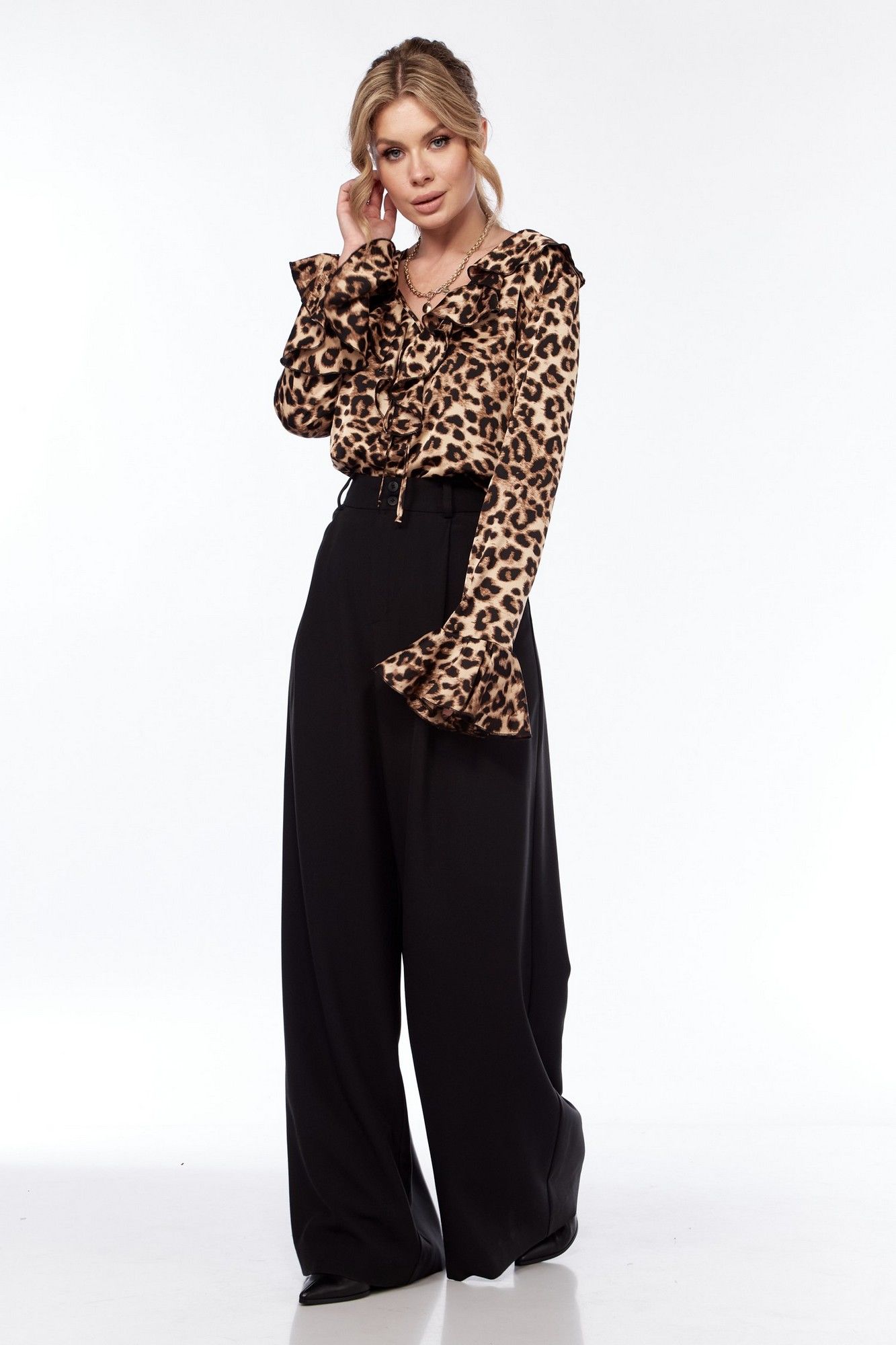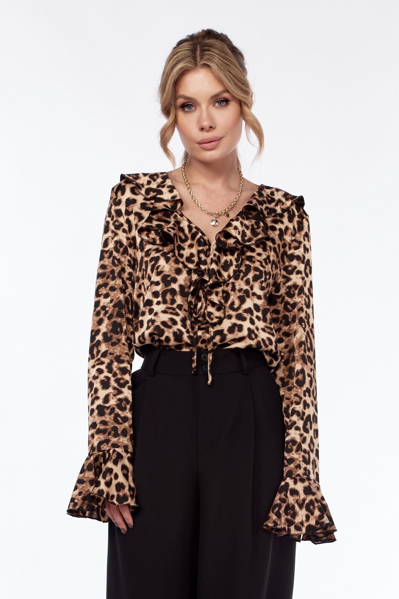 Женская молодежная блузка с леопардовым принтом. Блуза прямого силуэта. Горловина V-образная по полочке, округлая по спинке. Горловина украшена воланом со свободными концами, снизу выреза - завязки из основной ткани. Рукав втачной, одно шовный, снизу рукава свободный манжет - волан. Спинка прямая, без среднего шва.
