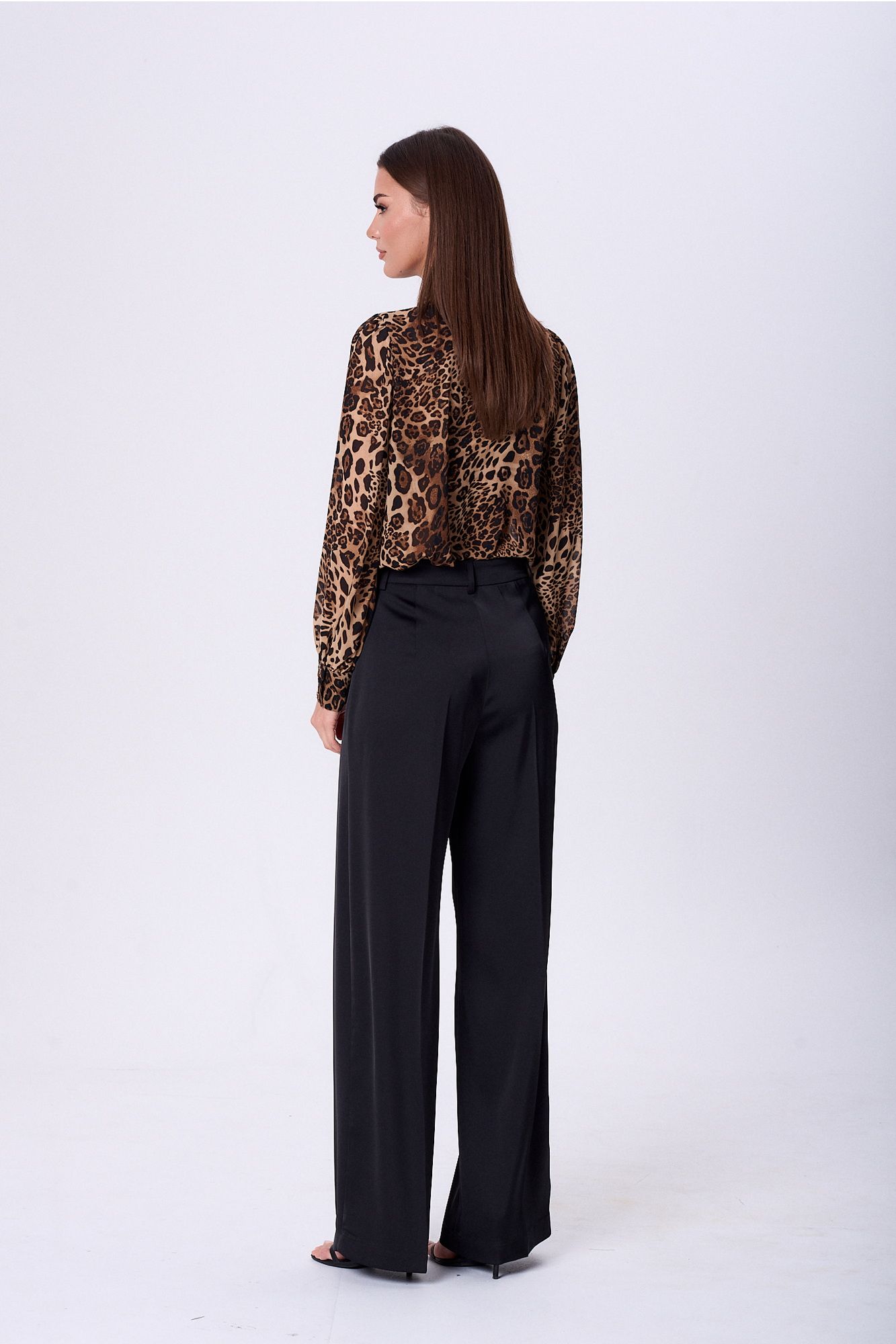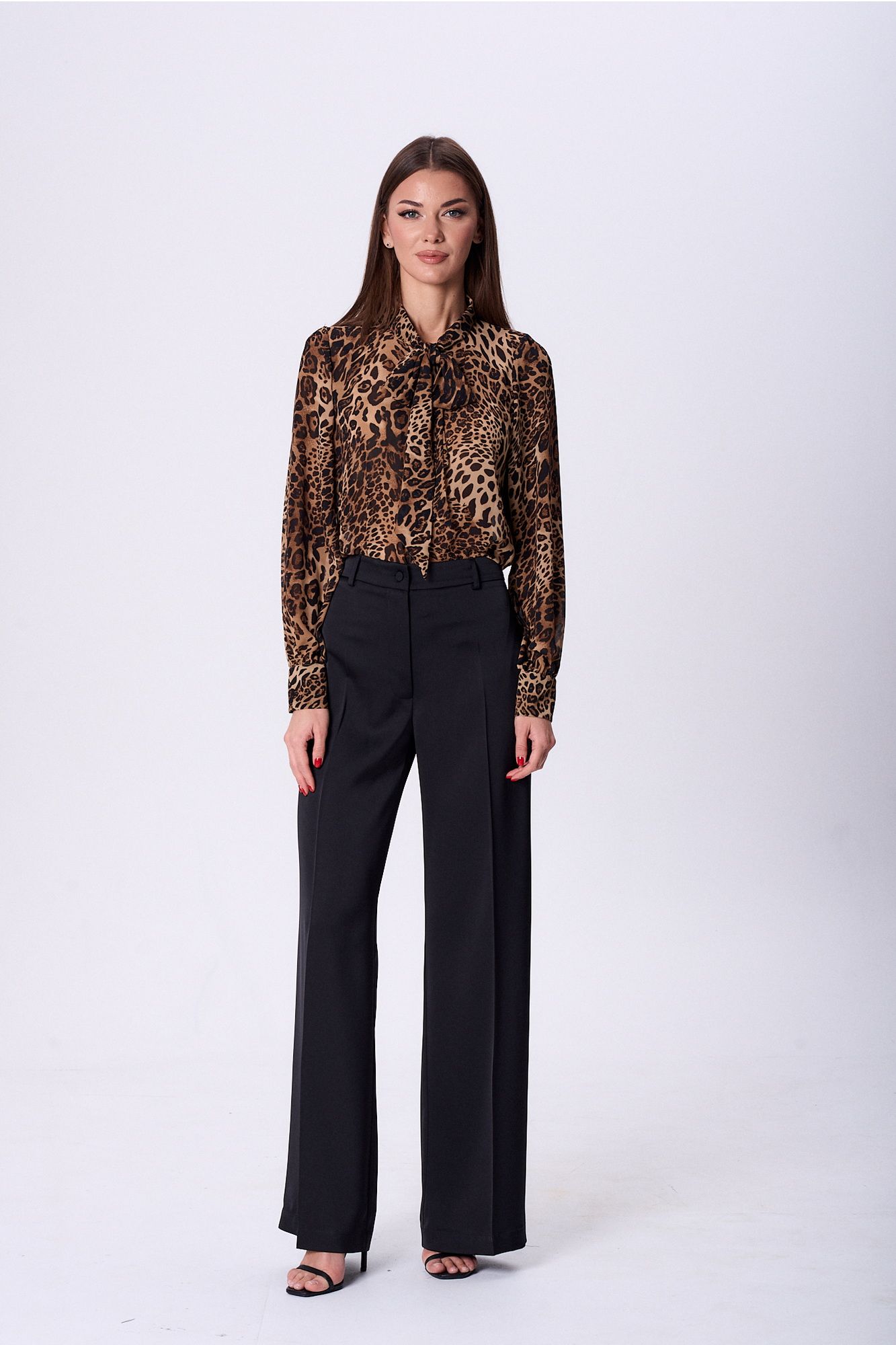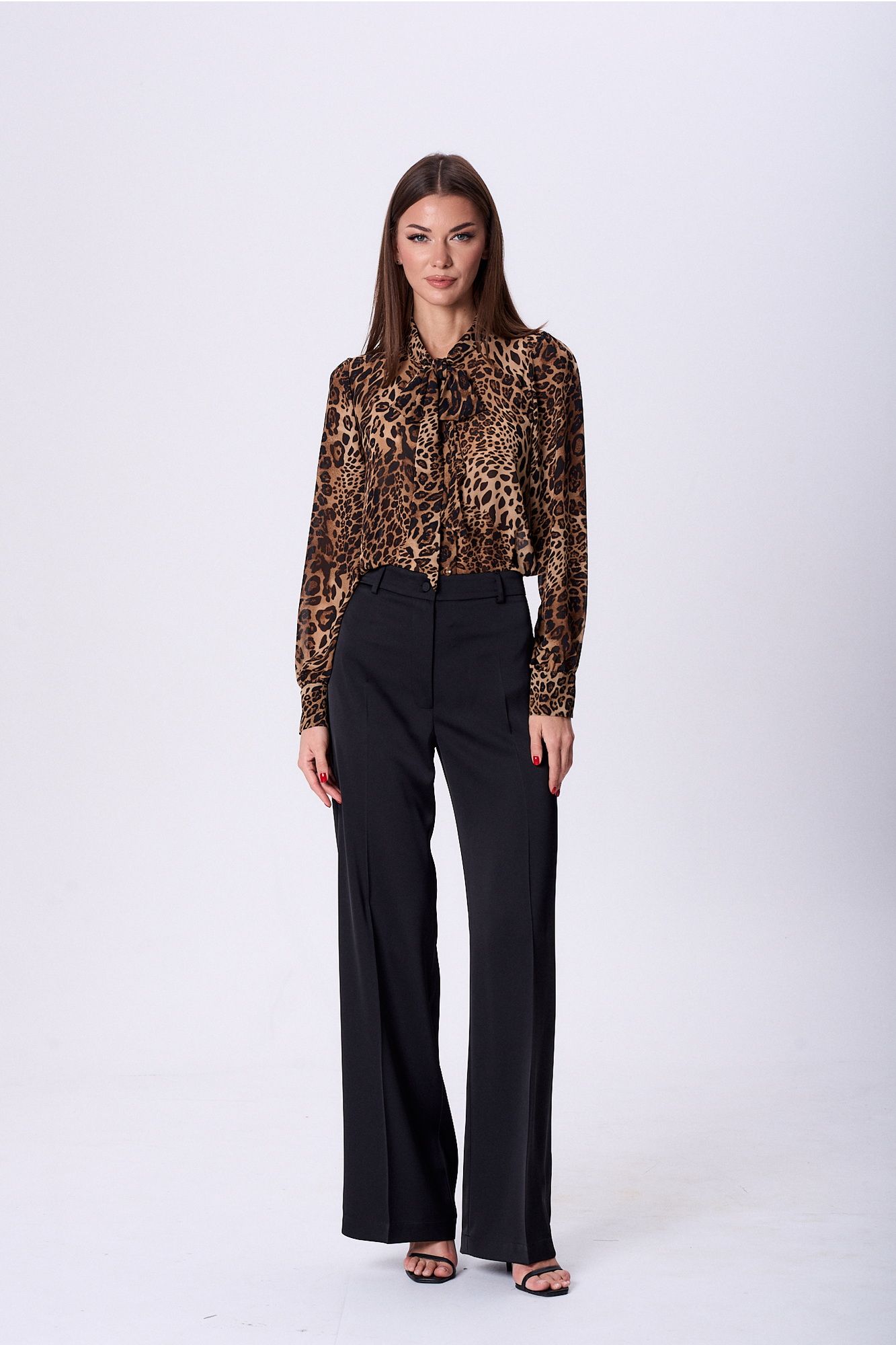 Блузка прямого силуэта. По переду застёжка на петли и пуговицы. Воротник-шаль с завязками в бант Рукав втачной. По окату не большая сборка и низ рукава на сборке. По низу рукава пришиты манжеты высотой 7см с застёжкой на три петли и пуговицы. По боковым швам выполнены разрезы. Длина блузки ок64см. Длина рукава ок 63см