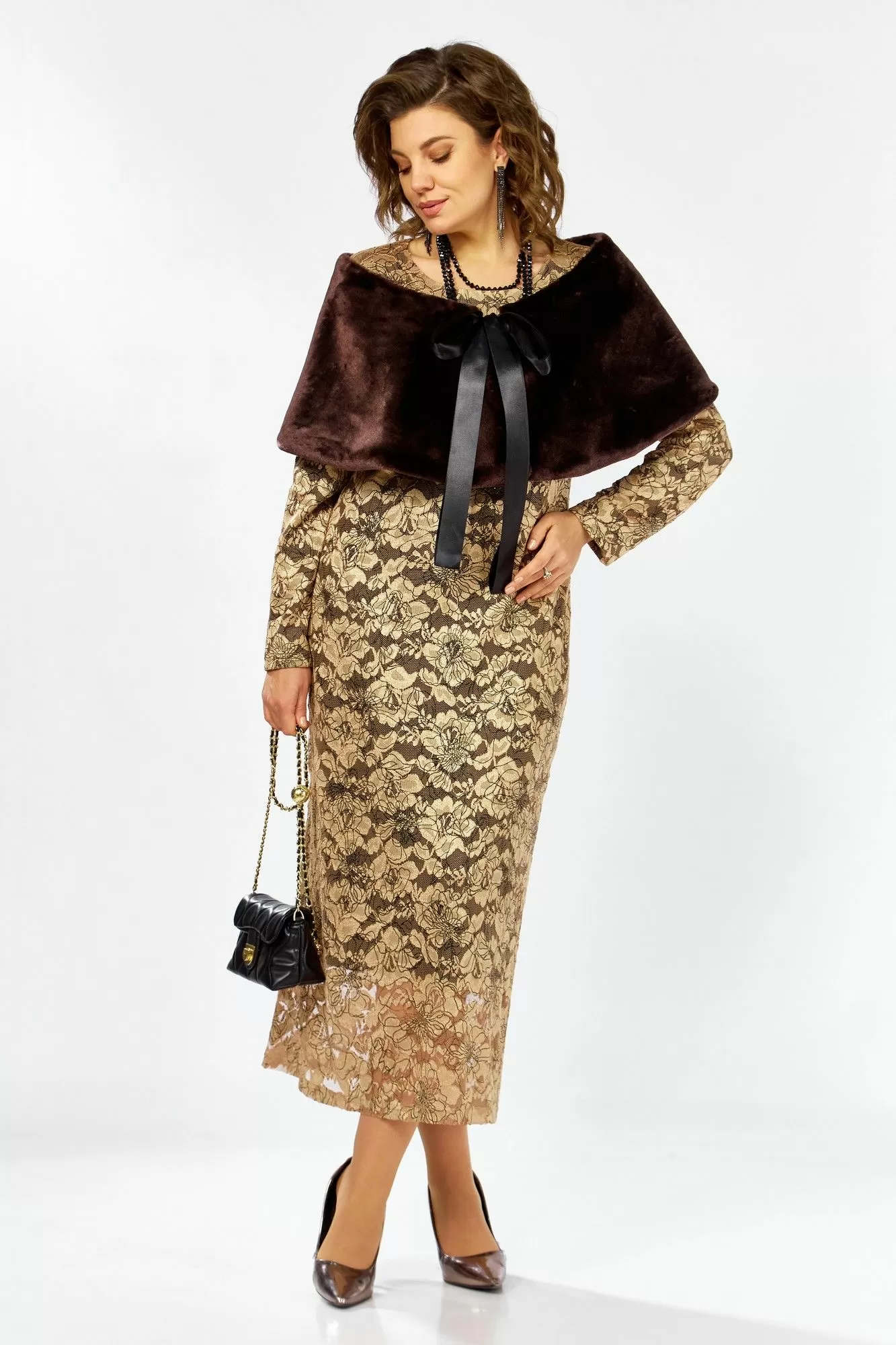 Элегантный и утонченный комплект с изящной меховой горжеткой, созданный для особых случаев в основе платье полуприлегающего силуэта на трикотажной подкладке из кружевного гипюра с контрастным рисунком в цветочной тематике, мягко драпируется , создавая воздушный легкий силуэт длинные рукава и свободный крой добавляют образу благородства и загадочности .
