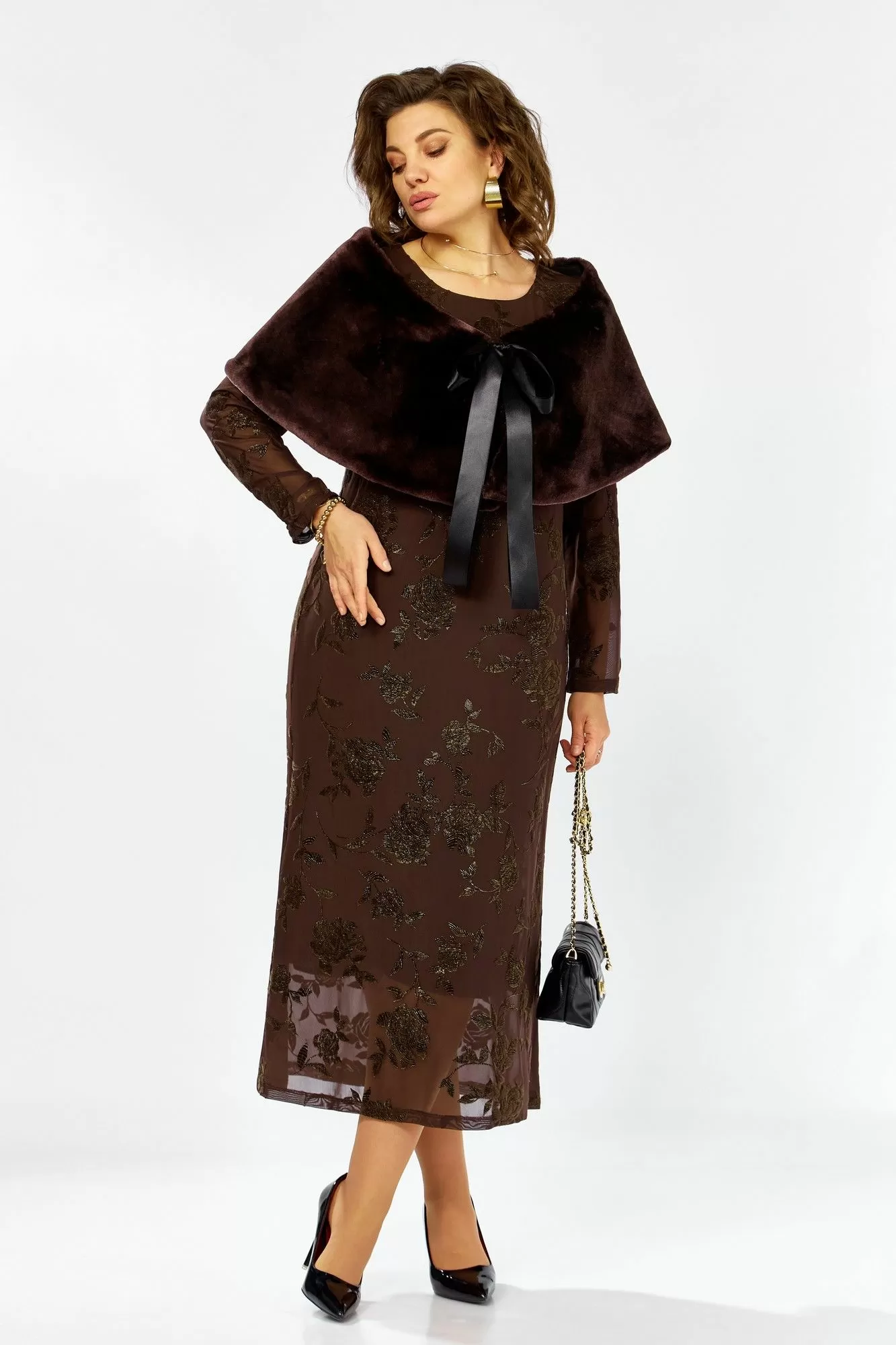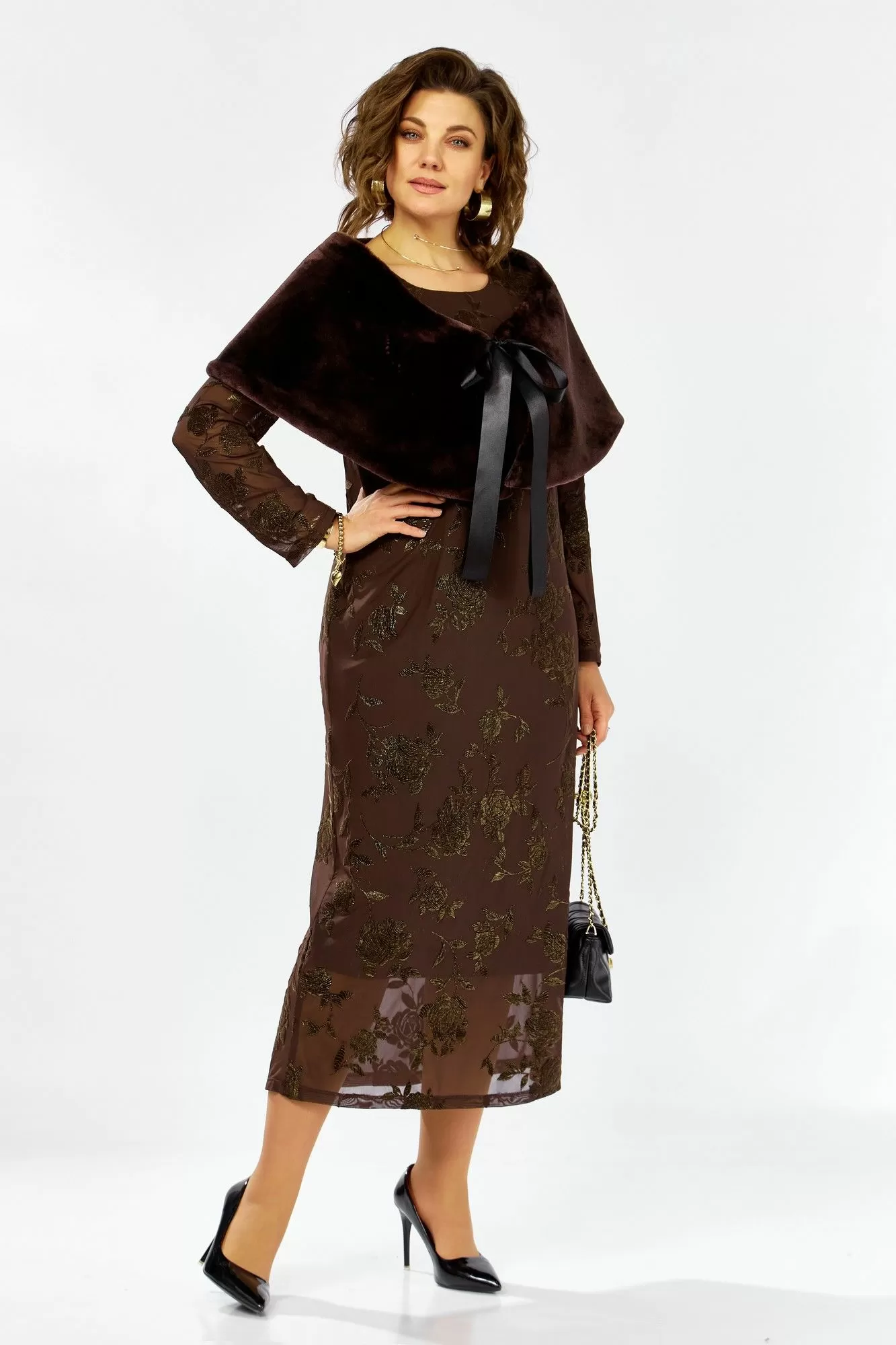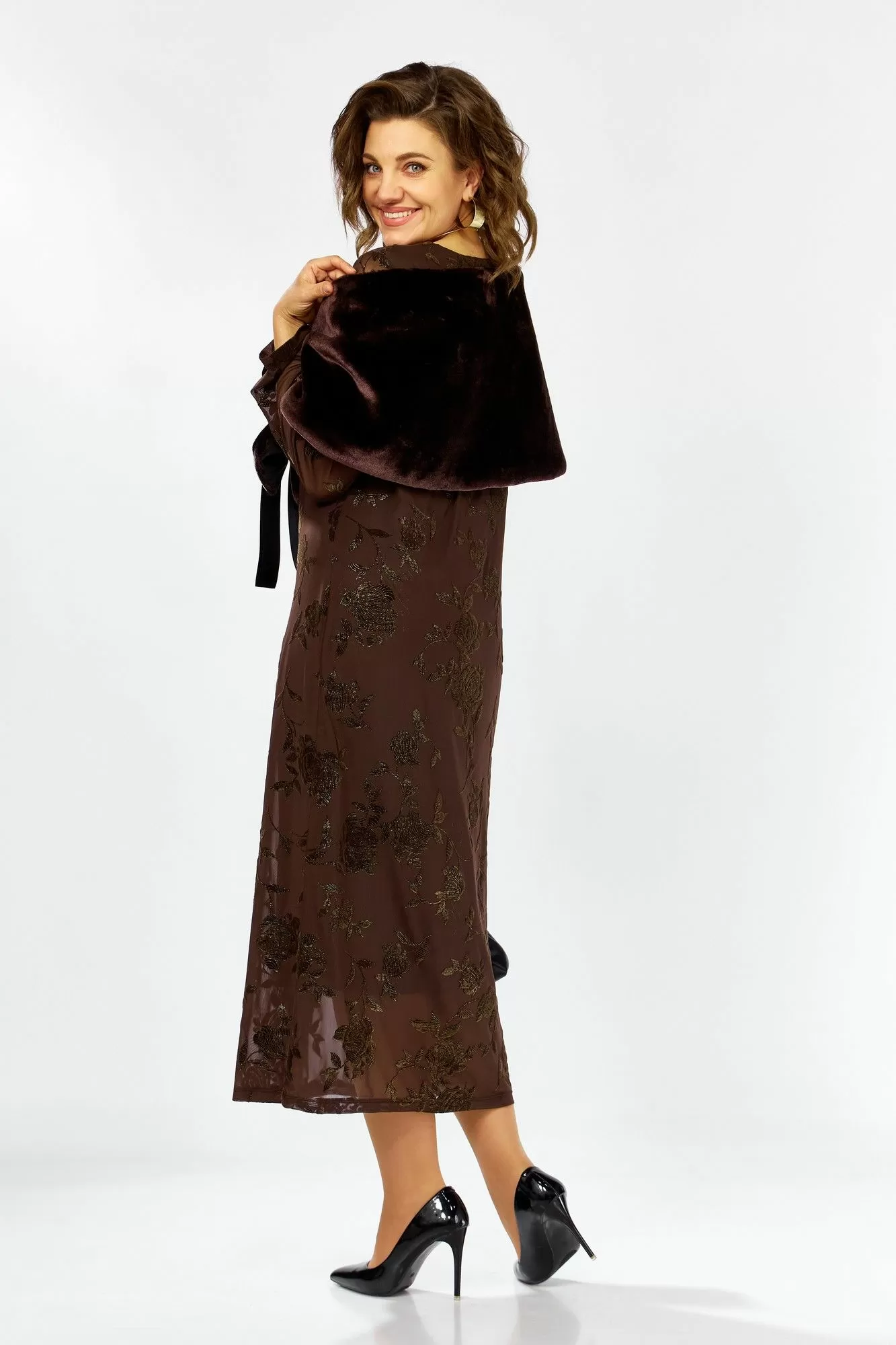 Роскошный плательный комплект с изящной меховой горжеткой . Платье на трикотажной подкладке полуприлегающего силуэта из мягкой стретч-сетки украшенной флоковым напылением с позолотой создает эффект дорогого кружевного орнамента. Образ дополняет роскошная