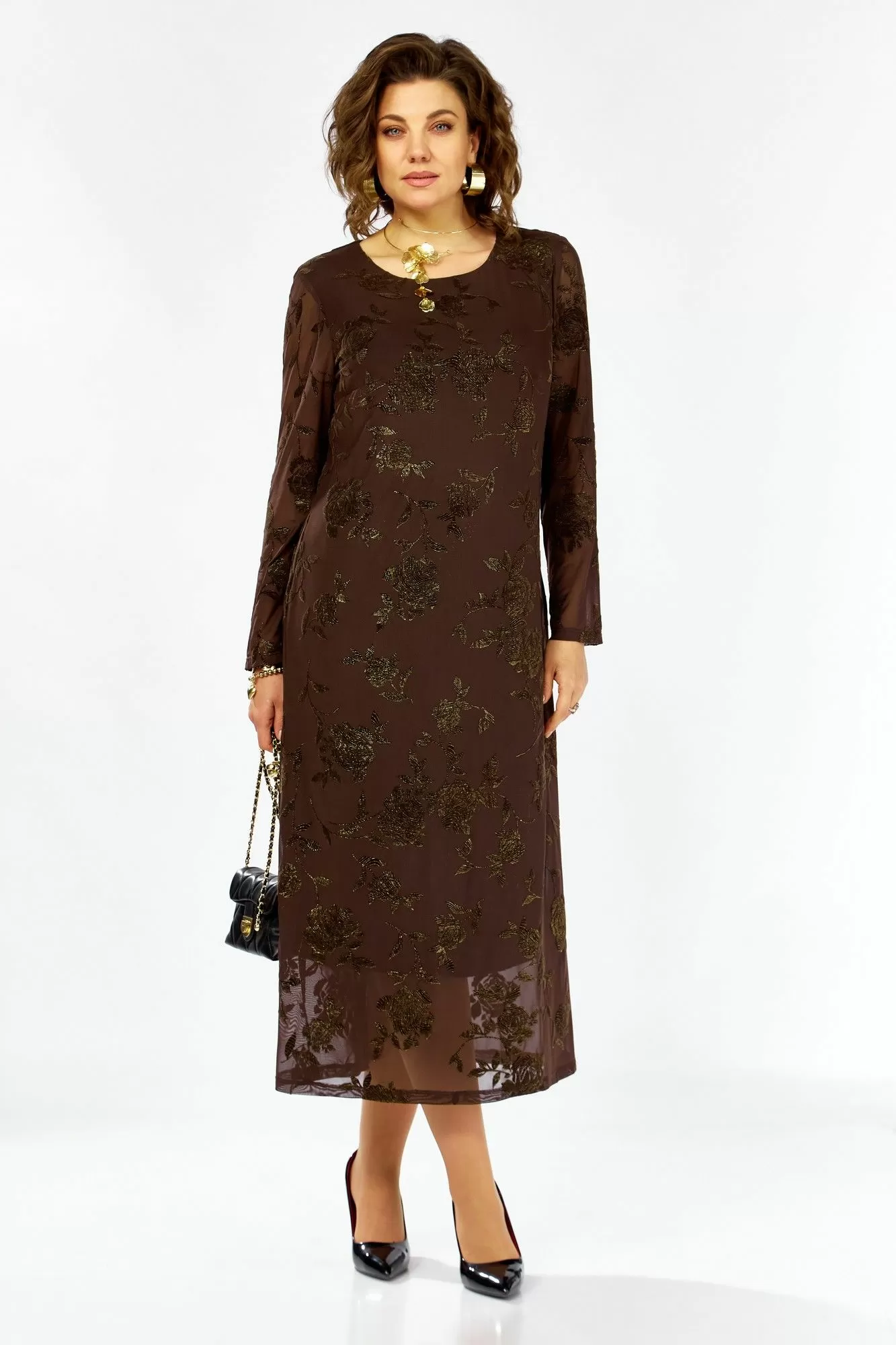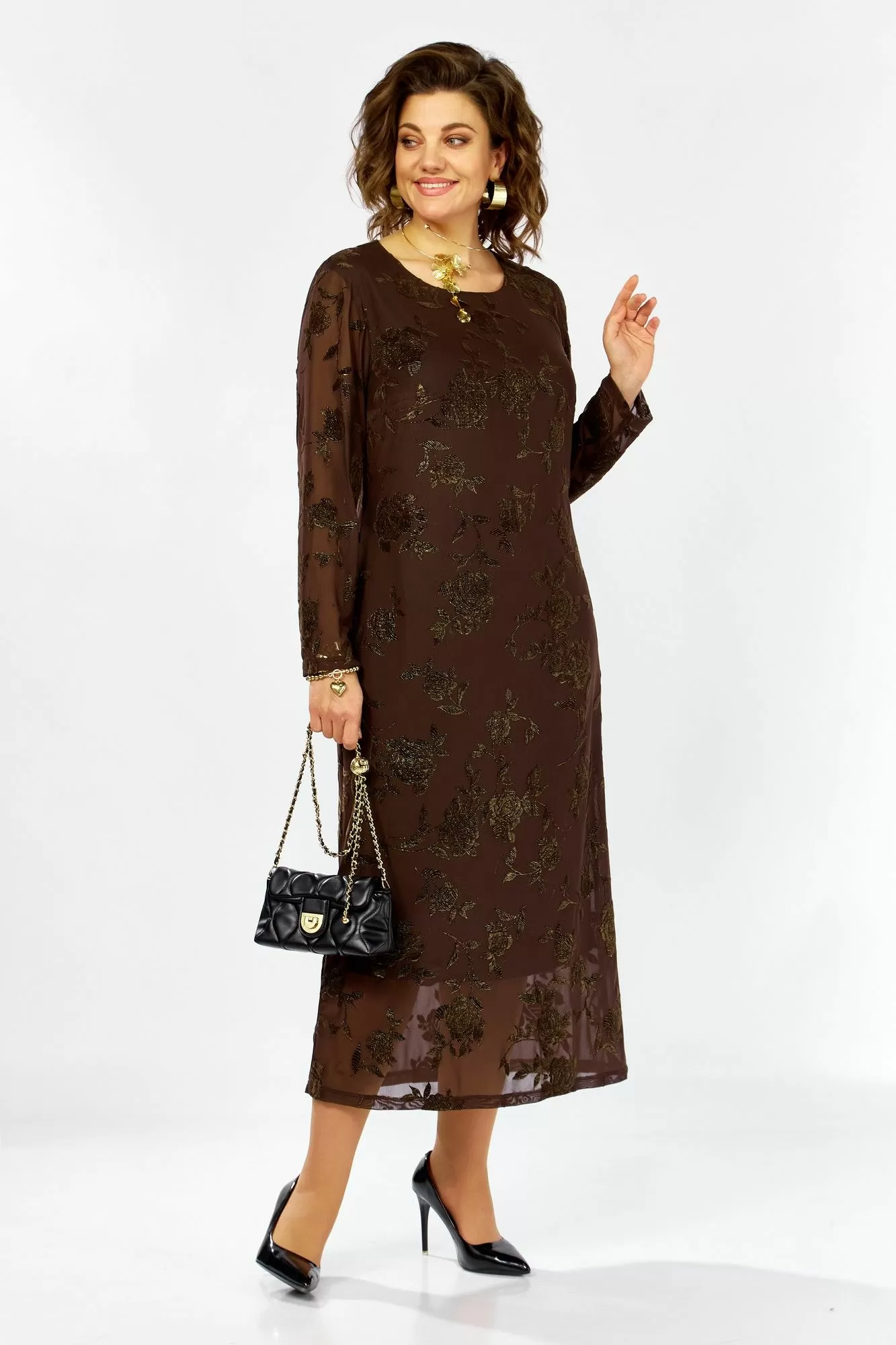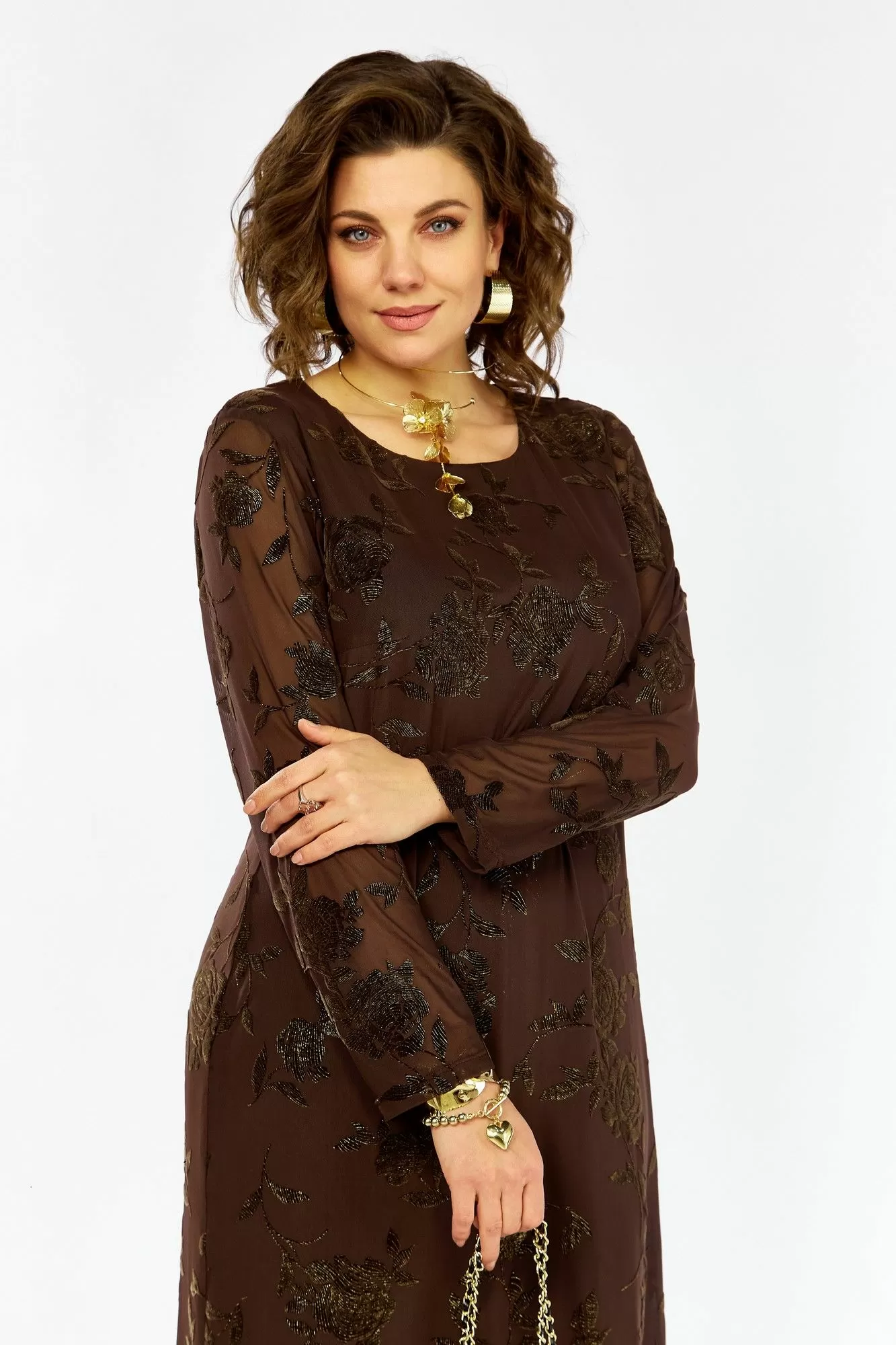 Роскошное платье на трикотажной подкладке полуприлегающего силуэта из мягкой стретч-сетки украшенной флоковым напылением с позолотой создает эффект дорогого кружевного орнамента.