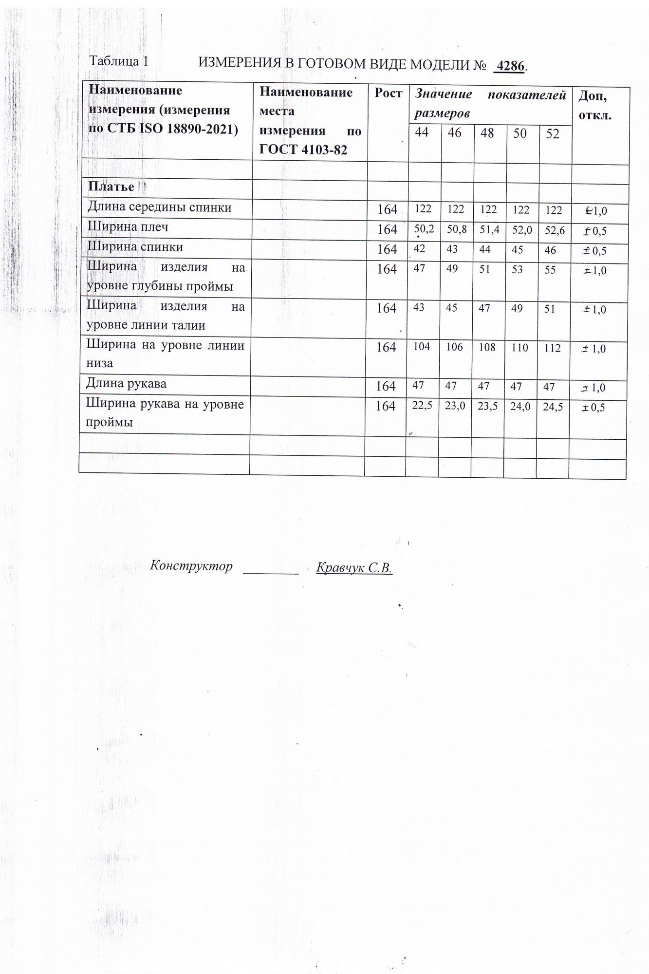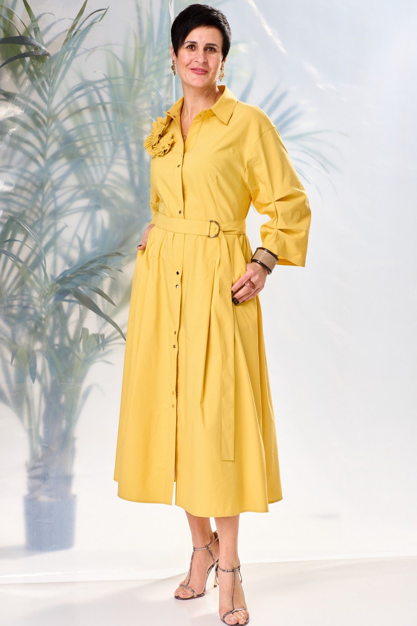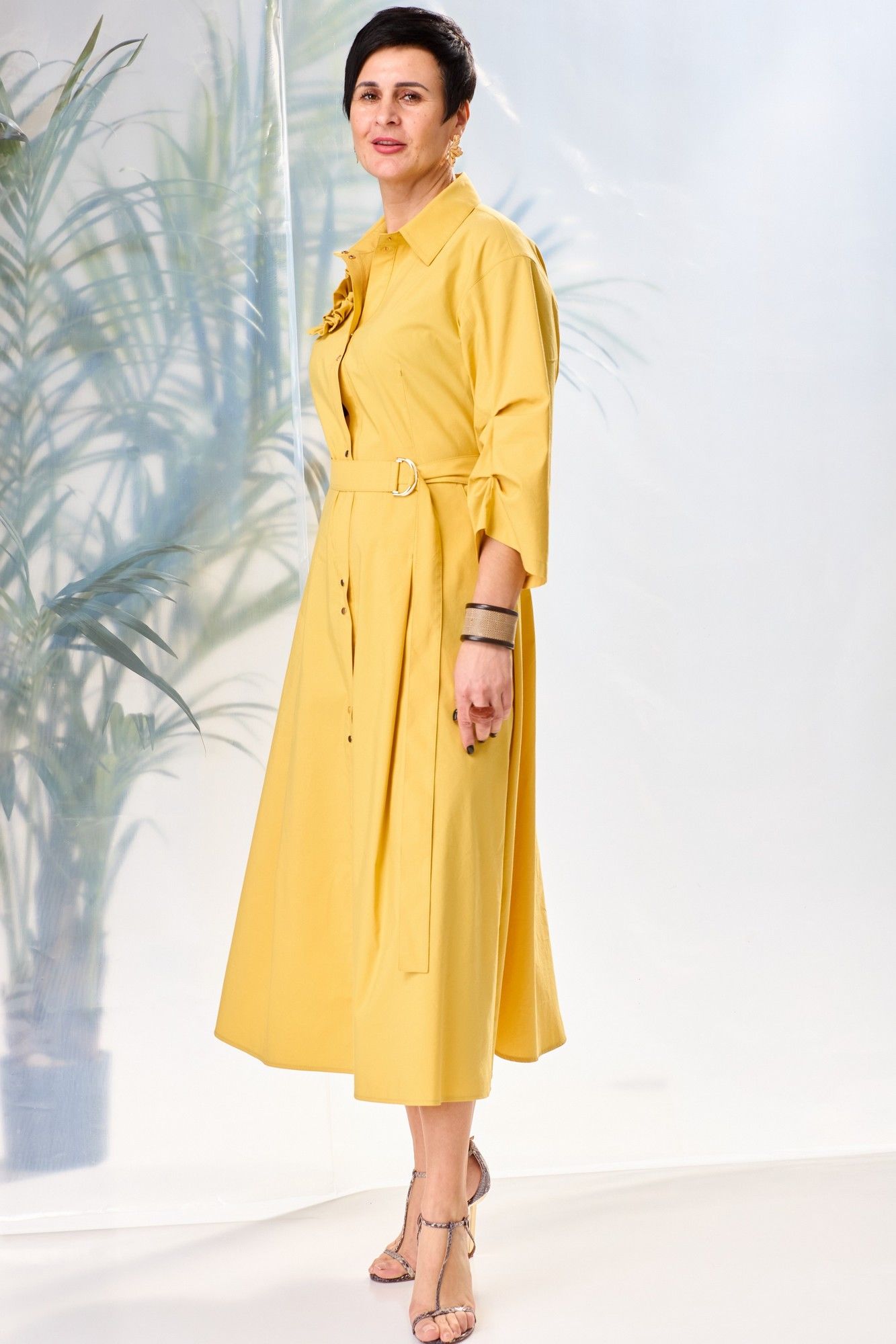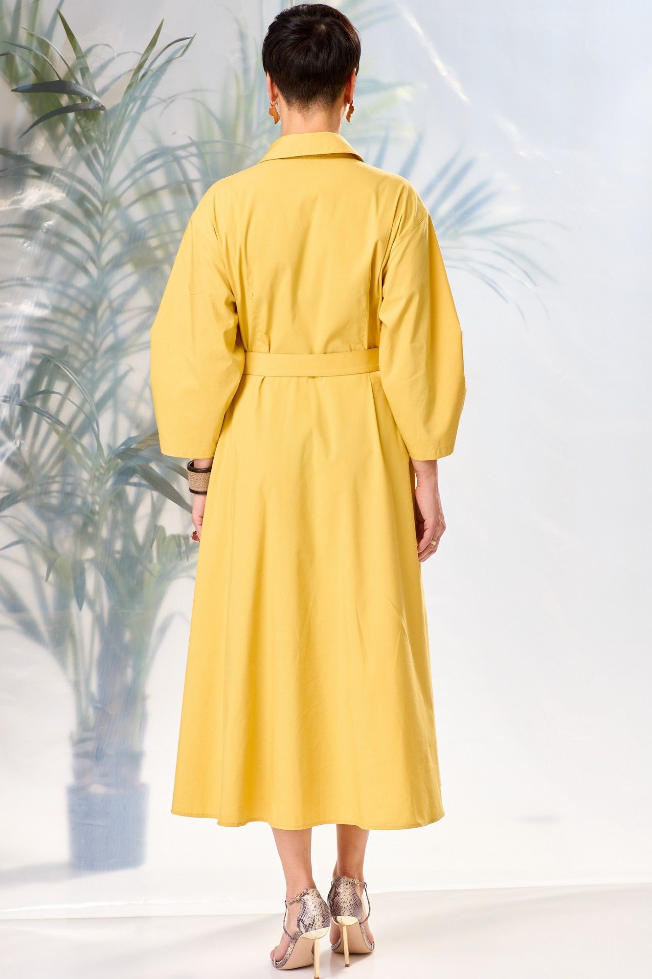 Платье женское, прилегающего силуэта, расширенное к низу, длиной ниже линии коленей, со спущенной линией плеча, с втачными рукавами, с втачным воротником, с втачными планками, отрезное на уровне линии талии, с центральной застежкой на 11 кнопок и 1 кнопку на стойке воротника, со съемным поясом. Лиф деталей переда платья с нагрудными вытачками, исходящими от талии, слева вверху расположен декоративный элемент. Лиф детали спинки с 2-мя вытачками. Юбка платья конической формы, в боковых швах обработаны наклонные карманы, передние полотнища с вытачками-складками. Рукава втачные двухшовные, длиной ¾, на передних швах заложены по две складки. Воротник сорочечный с отрезной стойкой. Декор может отличаться от представленного на фотографии.Платье: длина рукава - 47см, ширина рукава – 23,5см, длина спинки – 122см.