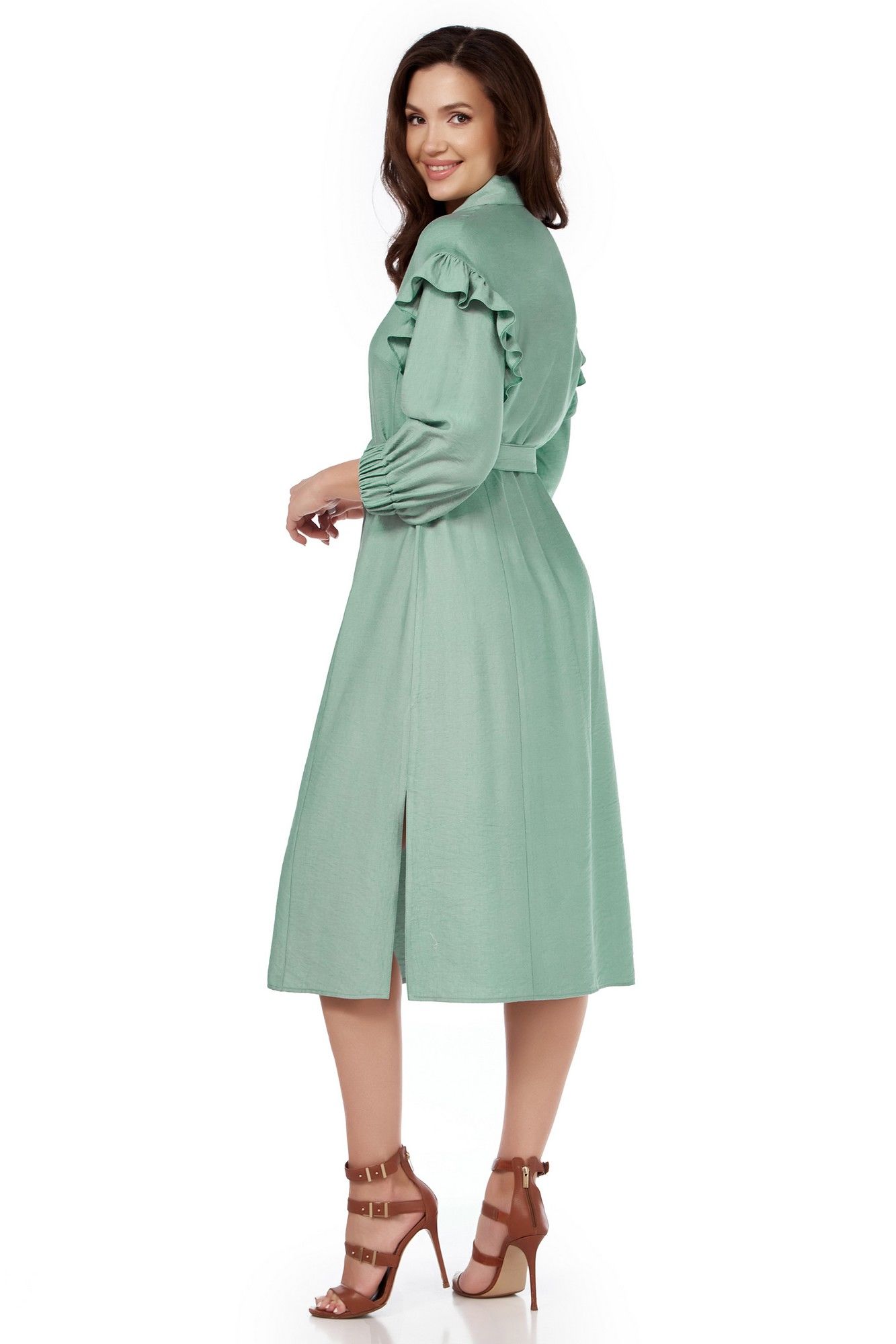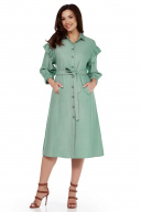 Платье женское Платье-халат полуприлегающего силуэта, длина миди, выполнено из натуральной пластичной ткани. Воротник на стойке, застежка по планке на пуговицы. Слегка расширено к низу. Впереди рельефы от проймы + вытачки, в швах - внутренние карманы. По спинке шов и рельефы от проймы. Линия плеча приспущена. Рукав пышный 3/4, внизу присобран на широкую резинку, линия притачивания подчеркнута небольшой рюшей. Съёмный пояс подчеркивает линию талии.