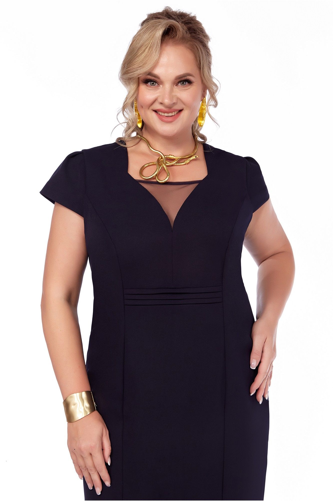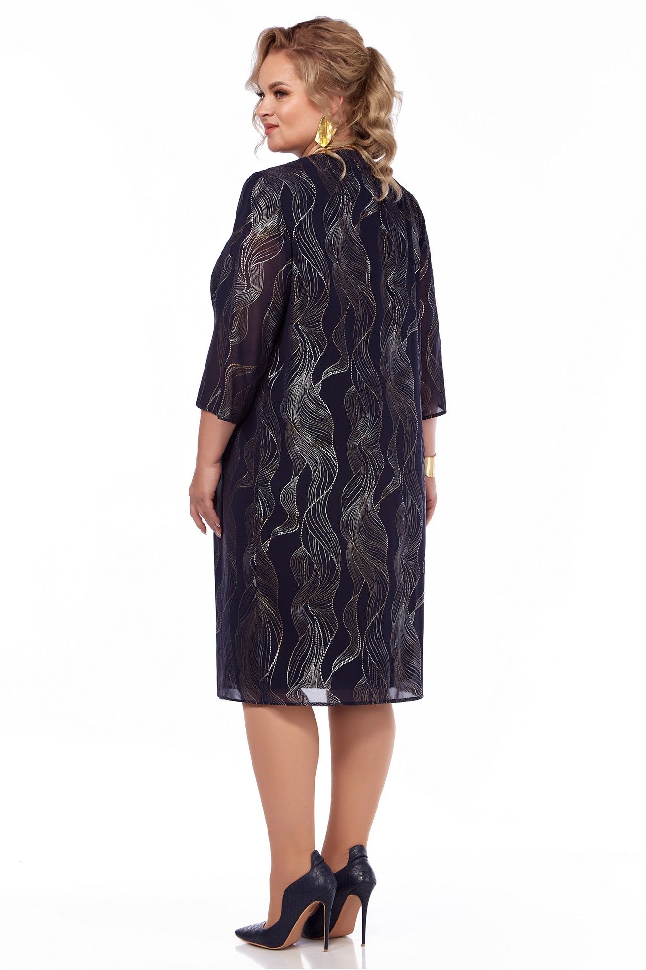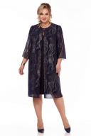 Комплект двухпредметный: платье, накидка. Платье полуприлегающего силуэта, выполнено из плательной ткани. Впереди у выреза горловины вставка из прозрачной сетки. Подрез под грудью, подчеркнутый складочками. По спинке рельефы от проймы, центральный шов и шлица, застежка «молния». Короткий рукав – крыло. Накидка свободного силуэта выполнена из шифона с рисунком. Впереди застежка на декоративный крючок – брошь. Рукав ¾.