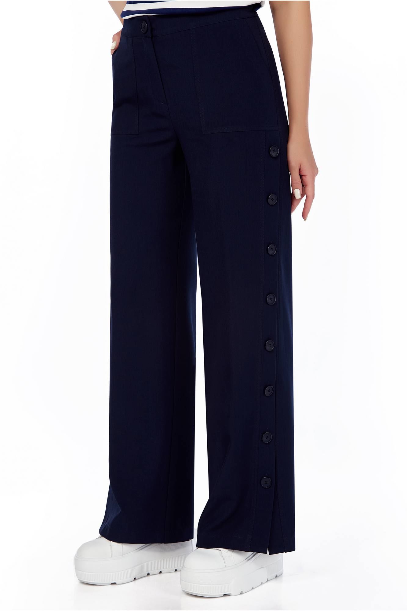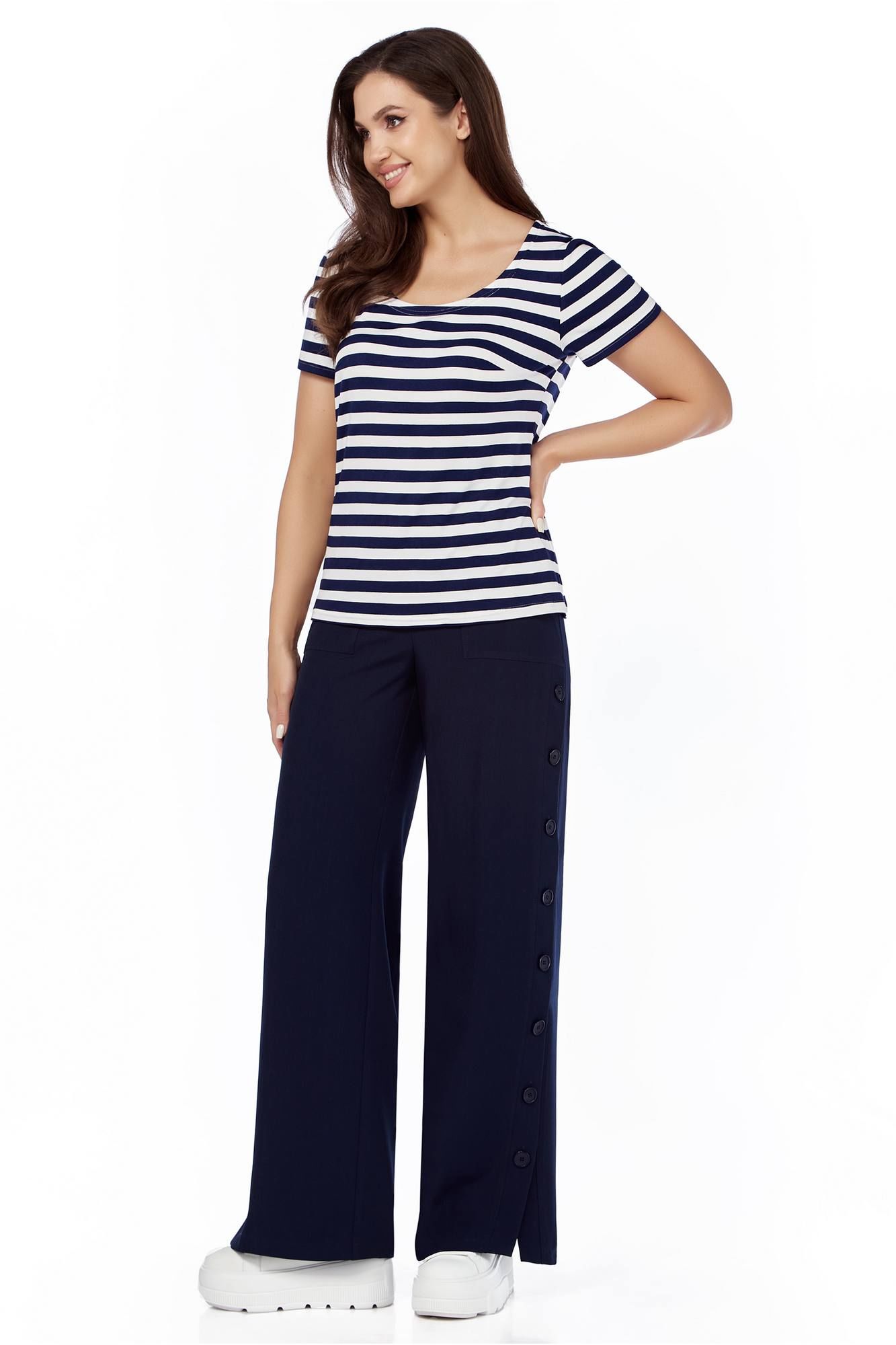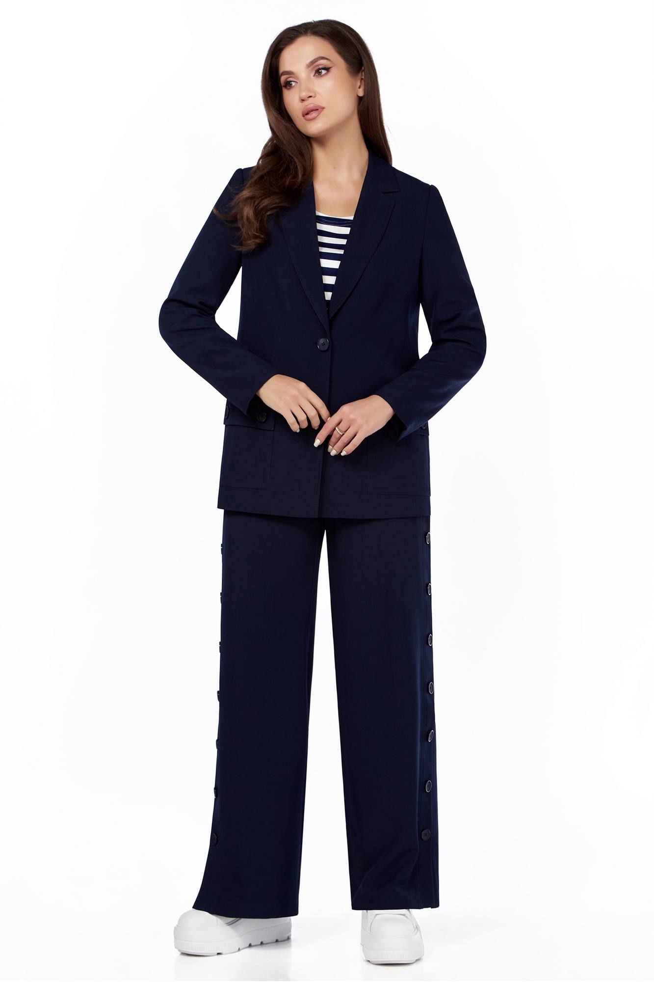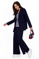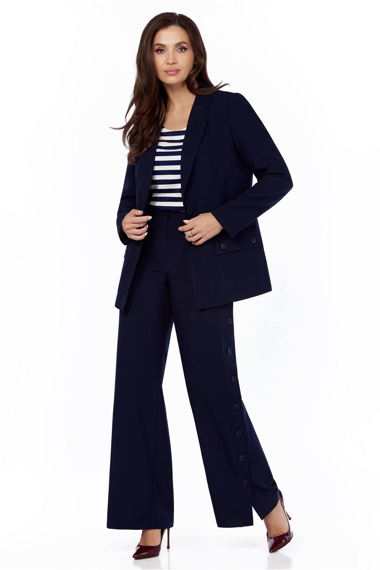 Комплект выполнен в морском стиле, актуальном в нынешнем сезоне. Жакет полуприлегающего силуэта с отложным воротником и лацканами, застёжка на одну пуговицу. Впереди рельефы + вытачка, накладные карманы с клапанами и пуговицами. По спинке шов. Рукав длинный. Детали жакета подчеркнуты двойными строчками. Жакет на подкладке «Гранд». Брюки длинные, прямые, оформлены притачным поясом на талии (по бокам резинки), застежка «молния» + пуговица. Накладные карманы со входом сбоку. Вдоль бокового шва – открытая шлица на застежке сквозь петли на пуговицы. Детали брюк подчеркнуты двойными строчками.