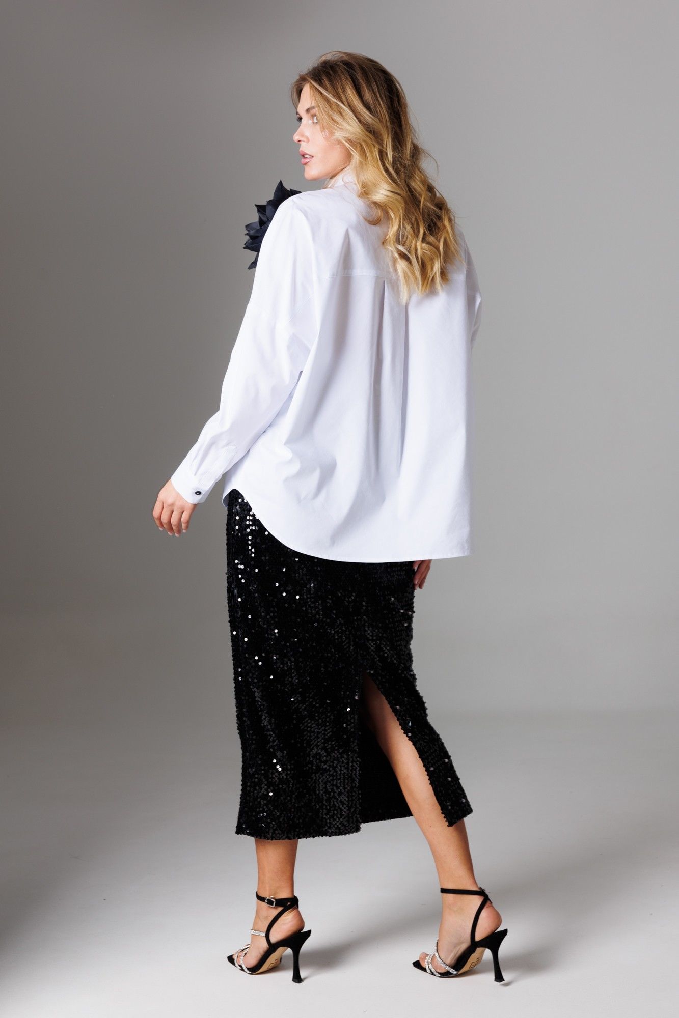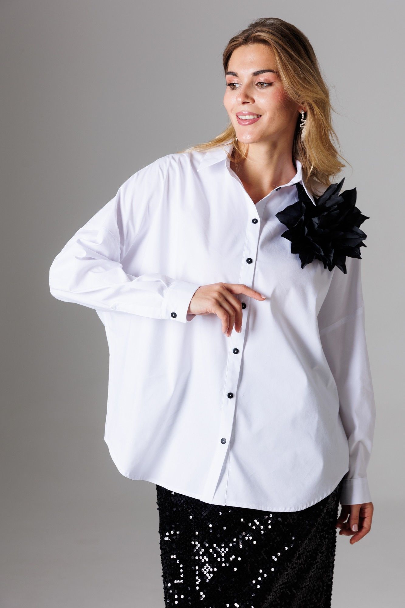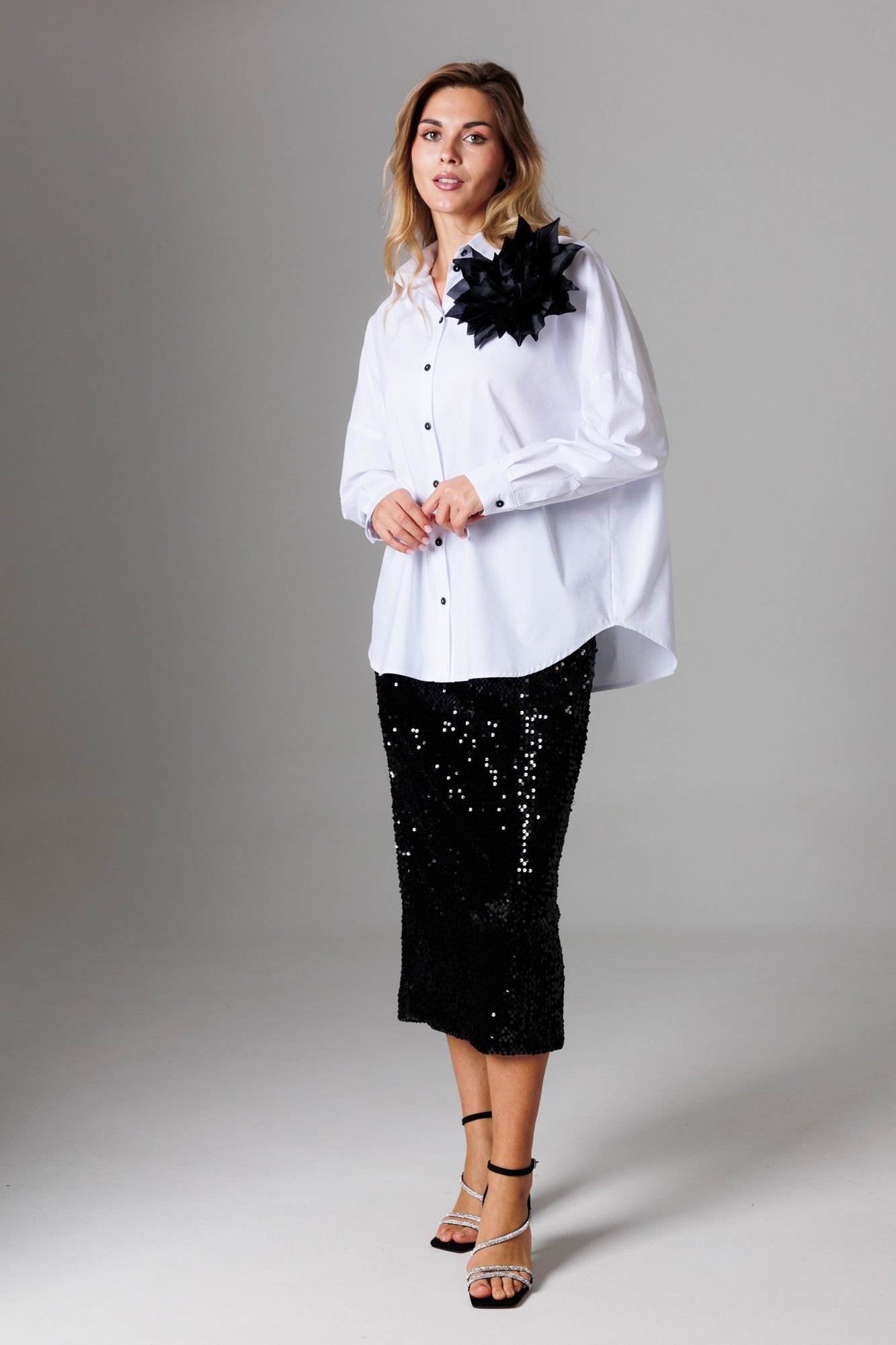 Шикарный стильный комплект, состоящий из блузы классического кроя, юбки в пайетки и дополнительно в комплект включена брошь-цветок. Блуза прямого свободного силуэта с рубашечным воротником на стойке и зауженным рукавом на манжете со спущенной линией плеча; Спереди на функциональной планке застежка петли/пуговицы. Спинка изделия имеет горизонтальную плечевую кокетку и встречную складку для свободы облегания. По плечевому шву заложена складка. Низ блузона слегка фигурный: спинка и полочка чуть длиннее бокового шва. Длина изделия блузона по спинке 73,5 см. Рукав рубашечный одношовный завершается манжетой (высота 5 см) с застежкой петля/пуговица. Длина спущенного плечевого шва 33 см. Длина рукава с манжетой 41 см. Юбка-карандаш из мягкого трикотажного полотна велюр с пайетками, на подкладке, чуть зауженная к низу. В среднем шве расположены потайная молния и открытый разрез. На линии талии расположены классические вытачки, пояс внутренний, обтачной. Длина изделия по среднему 82 см. Комплект дополнен брошью из текстиля в виде цветка. Представленная фурнитура может отличаться от представленной на фото/видео материале. Особые рекомендации: рекомендуется холодная деликатная ручная стирка, без использования отбеливающих СМС, без интенсивного трения. Сушка в вертикальном положении. ВТО с минимальным паром.