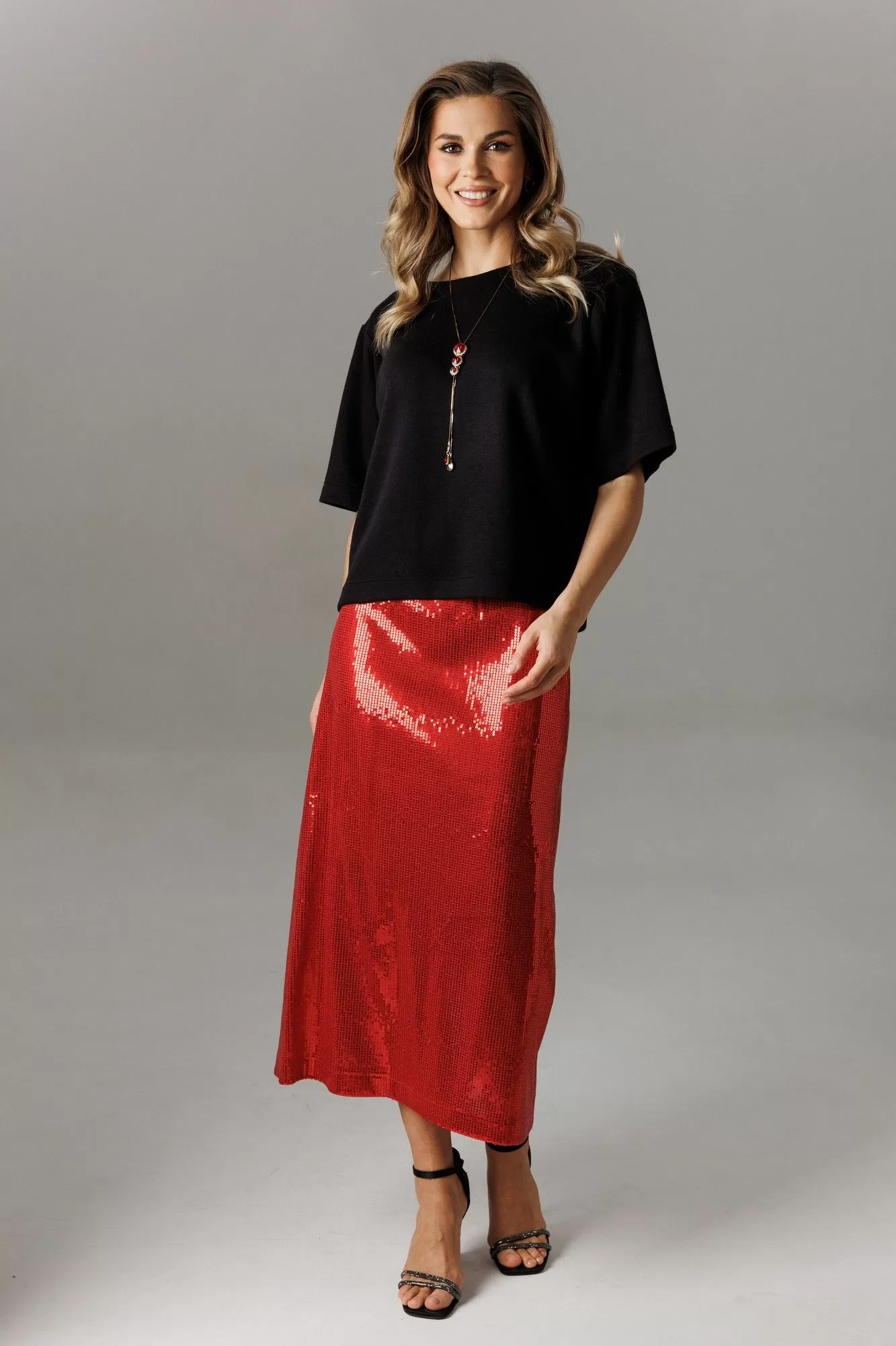 Юбка из трикотажного полотна с пайетками, прямого свободного силуэта, на трикотажной подкладке. Линия талии оформлена притачным поясом на эластичной тесьме. Длина юбки по среднему шву спинки 78 см.