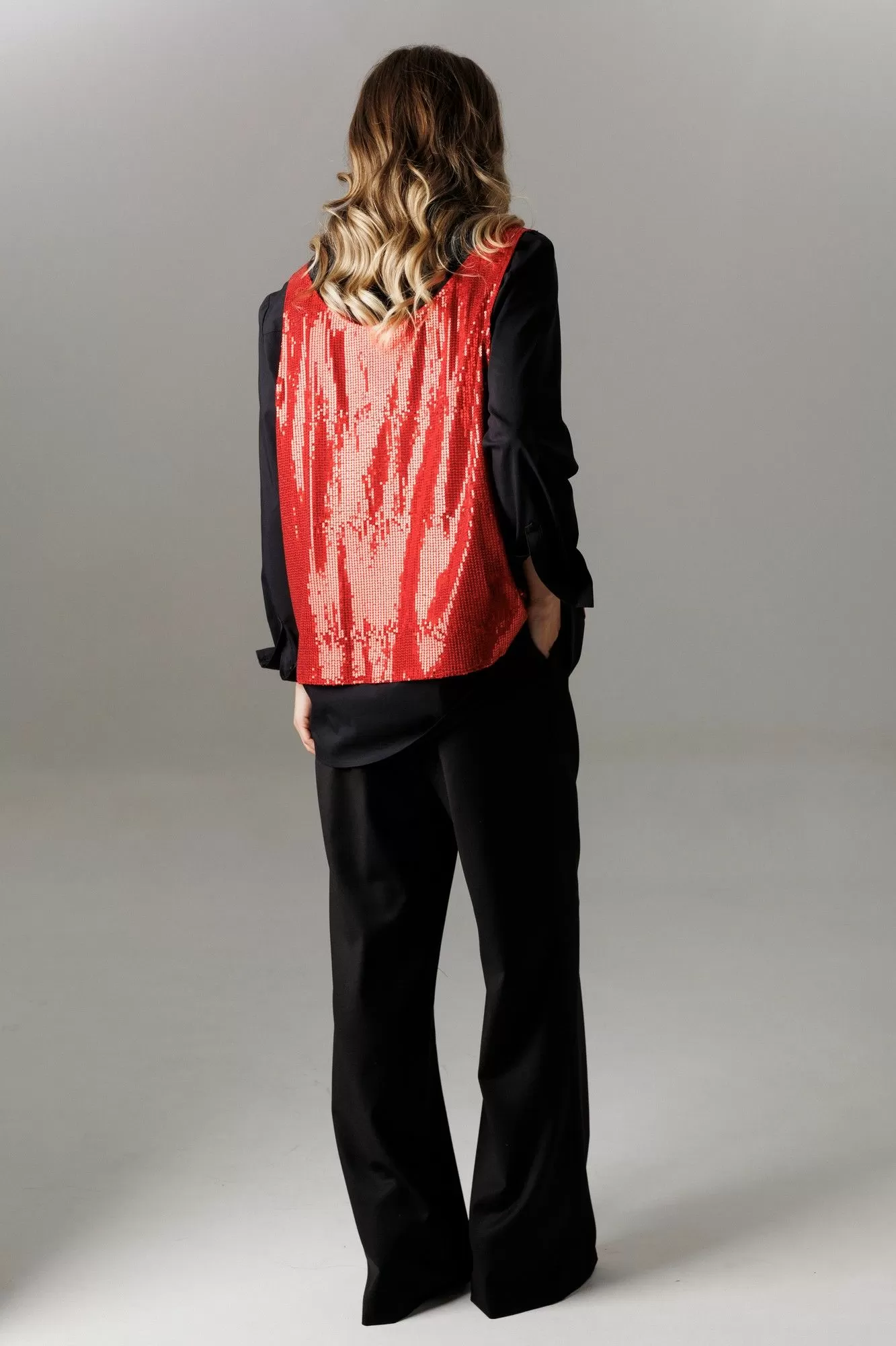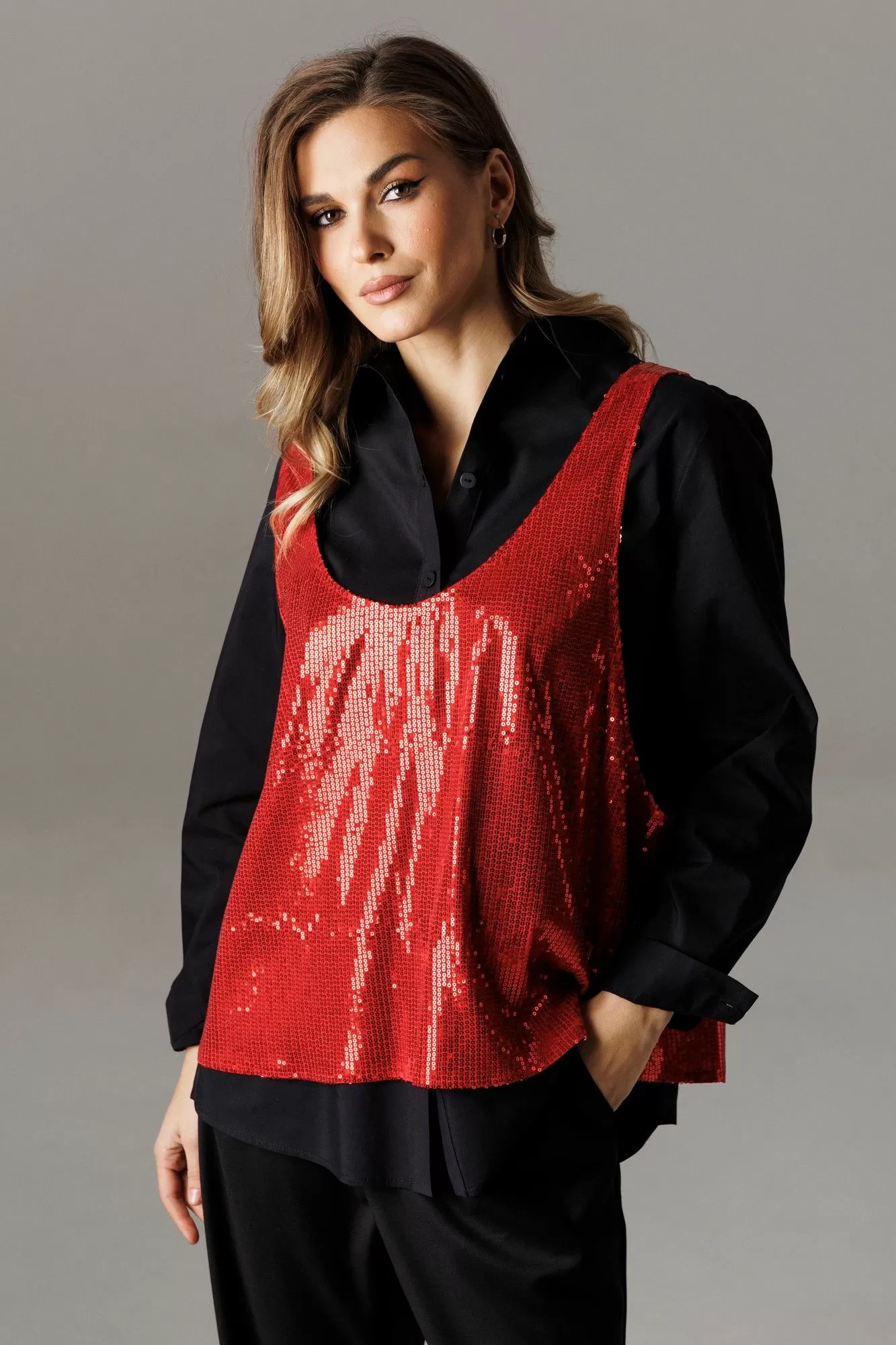 Майка выполнена из трикотажного полотна с пайетками свободного прямого силуэта в стиле оверсайз. Спереди и сзади имеет глубокие овальные вырезы и удлиненную линию проймы. Майка съемная. Длина изделия от плечевого шва по спинке 62 см.